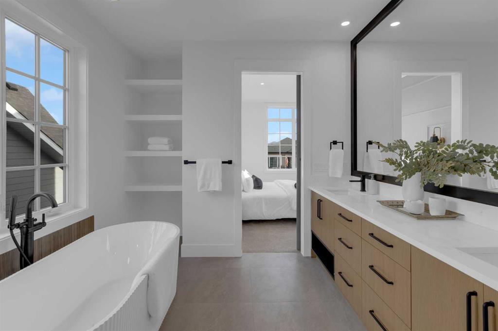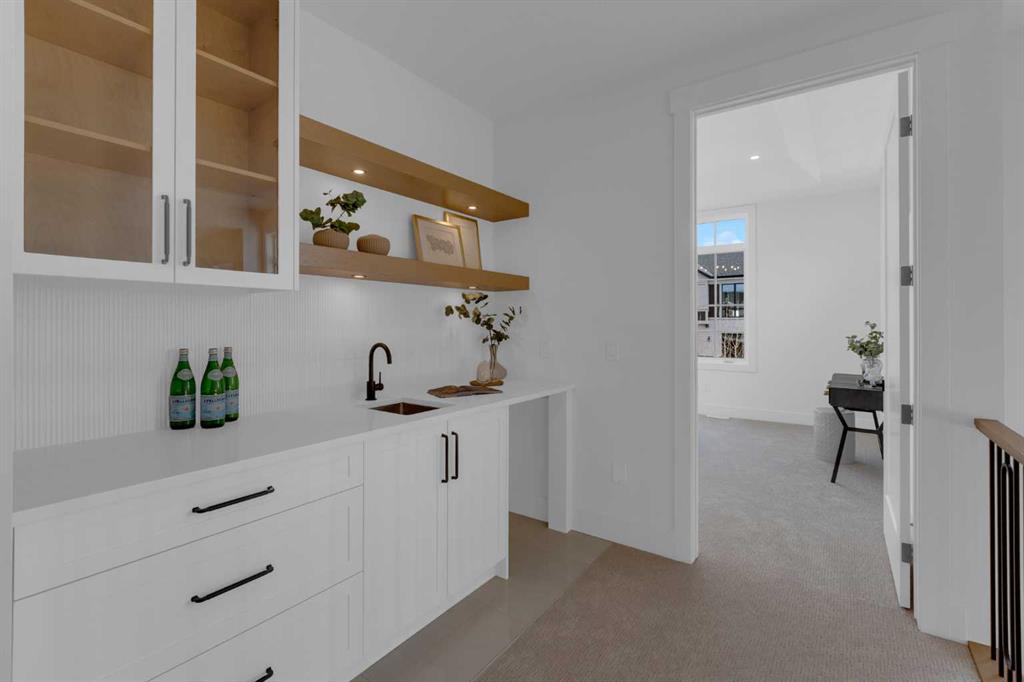 Upstairs, you are welcomed by a spacious bonus room, two secondary bedrooms with built-in shelving, a shared bathroom, and a thoughtfully located upstairs laundry room. A standout feature of this home is the built-in desk space and wet coffee bar in the common area on the second floor—a rare and highly desirable find that adds both character and convenience. The luxurious primary suite showcases a tray ceiling, a spa-inspired ensuite with dual vanities, a standalone tub, a steam shower, and a generous walk-in closet.