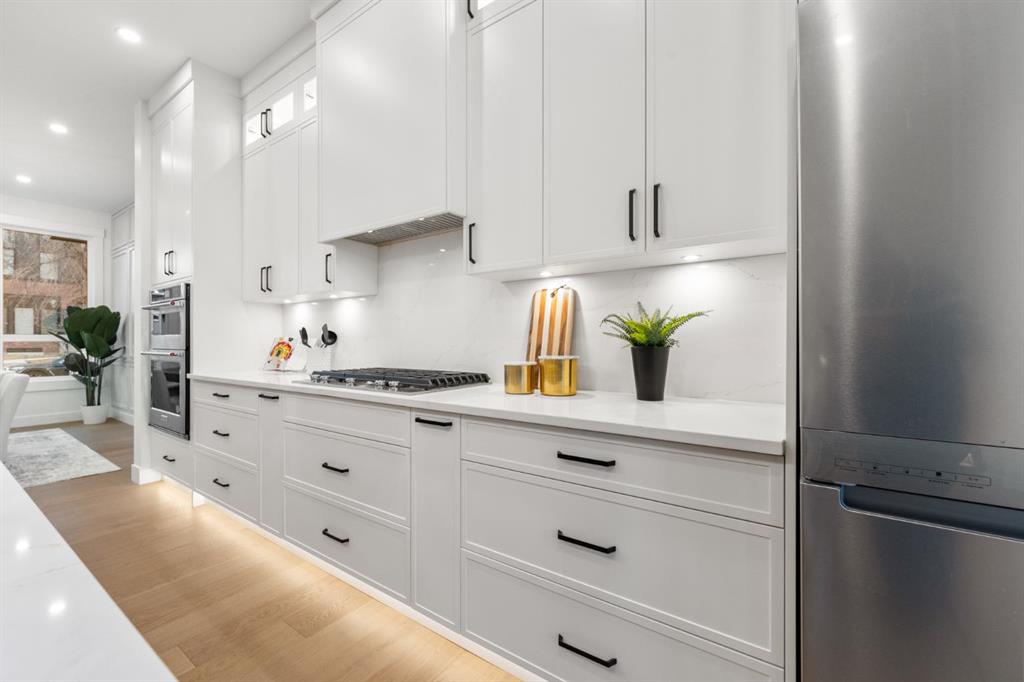 Step inside and be greeted by 10-foot ceilings, an open and airy floor plan, and engineered hardwood flooring on the main level. The chef-inspired kitchen is a showstopper, featuring built-in premium appliances, a massive extended island with a dual waterfall quartz countertop, full-height cabinetry, and a sleek quartz backsplash. Designed to impress, this kitchen perfectly balances luxury and everyday functionality.