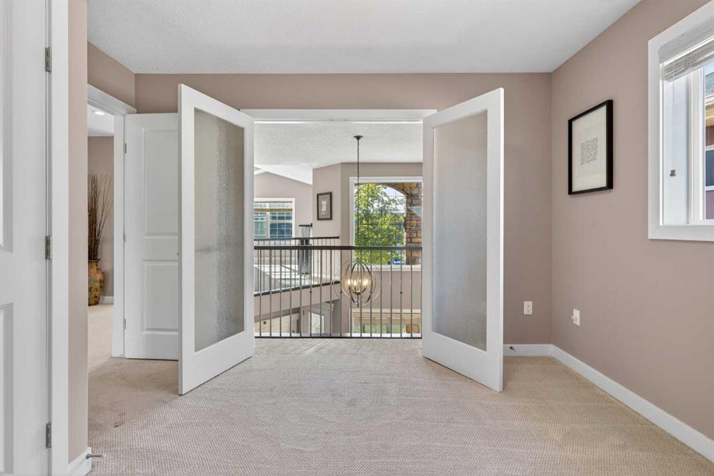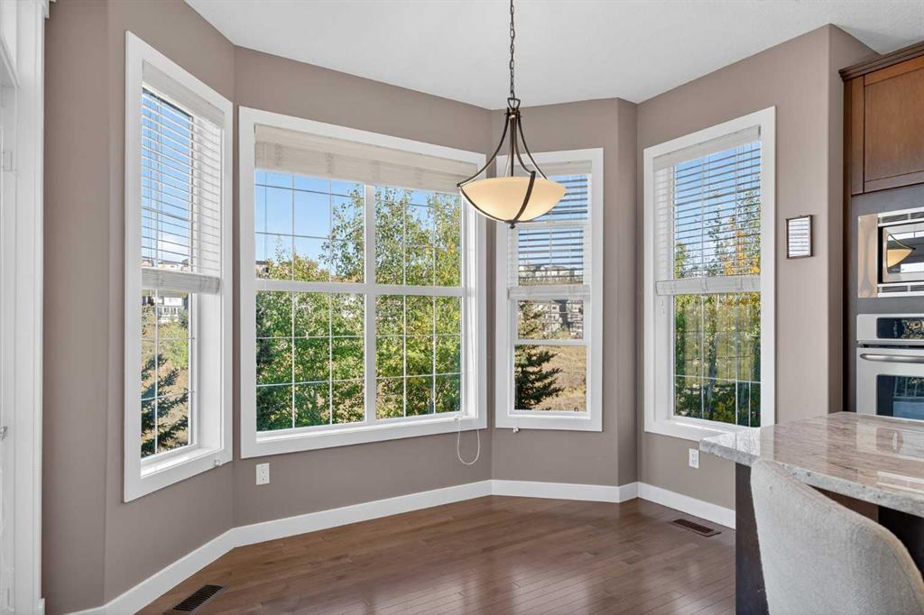 This stunning two-story residence offers over 3,800 sq. ft. of beautifully developed living space, perfectly designed for comfort and functionality. Backing onto Nose Creek - a beautiful tranquil natural setting, the east-facing backyard welcomes peaceful morning sunshine and provides a serene backdrop to everyday living. Step inside and be greeted by soaring ceilings and an abundance of natural light that enhances the elegant open layout. The main floor features a formal living and dining room—ideal for gatherings—along with a versatile flex room that can be used as a home office or study. The gourmet kitchen is a true showpiece, featuring granite countertops, a centre island, and stainless steel built-in appliances. The living room is warm and inviting, anchored by a cozy fireplace framed with beautiful built-in shelving and complemented by rich hardwood floors. Upstairs, the expansive primary suite offers a luxurious retreat with a spa-inspired ensuite, dual sinks, and a spacious walk-in closet. Two additional bedrooms and a large bonus room provide plenty of space for family and relaxation.