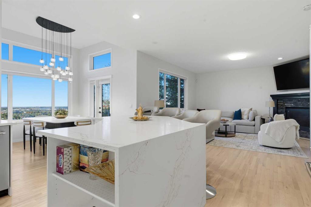 BACKING ONTO THE BLUFFS OF SPRINGBANK HILL | PANORAMIC VIEWS | FINISHED WALKOUT BASEMENT | DESIGNER UPGRADES THROUGHOUT | HUGE PIE LOT | Stunningly updated in a sleek, modern style, this exquisite home captures the best of elevated southwest living. A sophisticated foyer grants an immediate wow factor leading into an open floor plan where natural light and ridge views set an inspiring tone. Relax in the inviting living room centered around a gas fireplace framed by oversized windows overlooking the backyard and beyond. Culinary dreams come to life in the beautifully designed kitchen featuring a gas cooktop, stainless steel appliances, crisp white cabinetry, hexagon backsplash and an expansive waterfall-edge breakfast bar island perfect for casual gatherings. Encased in windows with cascading designer lighting, the dining area offers soaring ceilings and endless views creating an exceptional space for family meals and entertaining. Step outside onto the glass-railed deck, where unobstructed vistas of the bluffs create the ideal setting for warm-weather lounging, BBQs, and unwinding at the end of the day. Upstairs, a vaulted bonus room provides plenty of space to come together for family movie or game nights. The outstanding primary retreat is an oasis of serenity with breathtaking views, a cozy sitting area, a custom walk-in closet and a spa-like ensuite boasting dual sinks, a deep soaker tub and an oversized rain shower. Another spacious, light-filled bedroom and a full bathroom complete the upper level. The fully finished walkout basement is every bit as stylish as the rest of the home, featuring a sleek wet bar for effortless entertaining, a built-in bar-top workspace and a comfortable recreation area anchored by a second fireplace. Two additional bedrooms, a 2nd laundry area and a full bathroom make this level perfect for guests, short term rentals or extended family. Outdoor living is equally impressive with multiple seating areas, including a covered lower patio and rear deck, all framed by mature trees and panoramic views that stretch across the southwest skyline. The insulated, drywalled and heated double garage provides comfort and practicality year-round. Ideally situated in one of Calgary’s most sought-after communities, this home offers direct access to walking paths and is minutes from top-rated schools, several golf courses and an array of amenities at West 85th, Aspen Landing and Westhills Towne Centre. Endless recreation awaits nearby at Westside Recreation Centre and Griffith Woods Park, while downtown Calgary remains within easy reach. Every detail of this exceptional home has been carefully curated to blend modern luxury with everyday comfort, creating an inspiring retreat perfectly positioned to enjoy the best of Springbank Hill living!