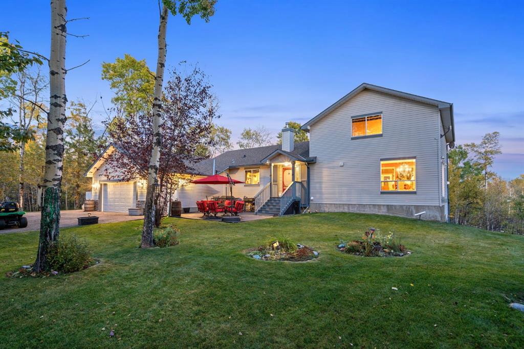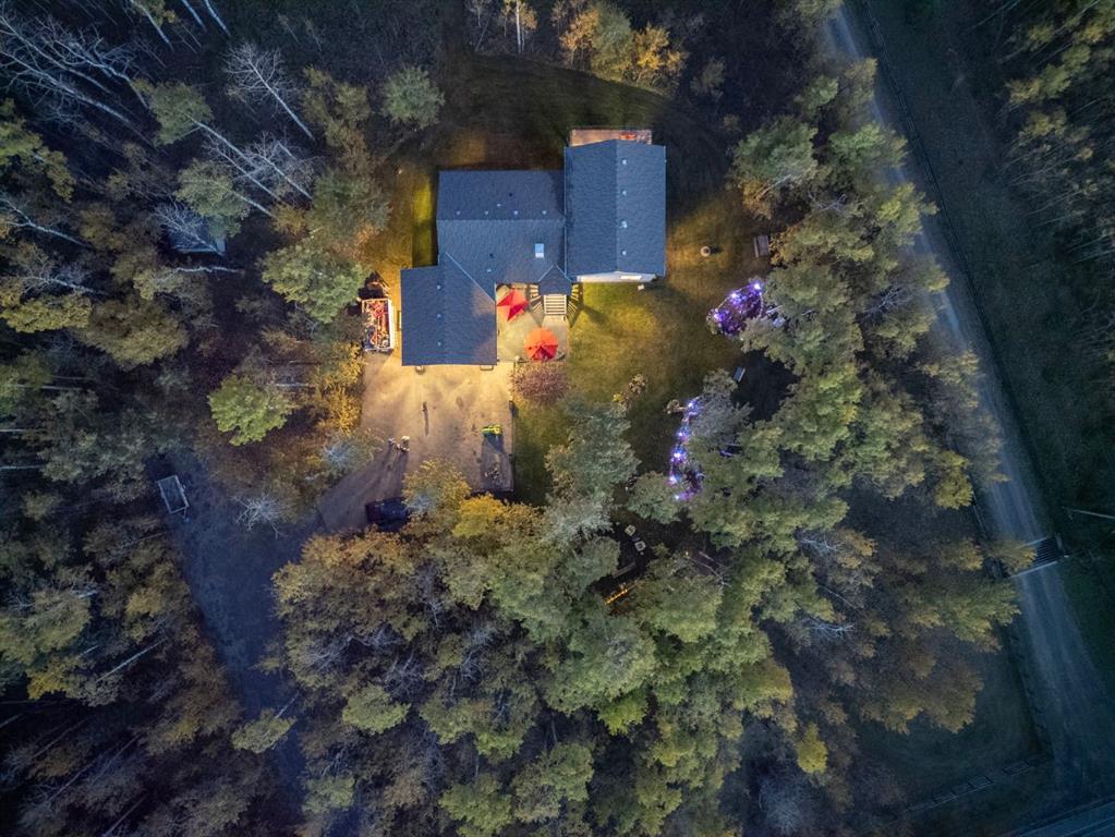 The main floor with its stunning two storey vaulted ceiling’s in the great room c/w oversized windows, and a beautiful double mantle stone fireplace that anchors the gorgeous views, a 400 sq.ft. loft that is over looking the expansive great room and the majestic mountain views to the west and valley views to the south & east. The adjoining dining area and kitchen are surrounded by glass French doors and oversized windows on two complete walls that is breath taking. The beautiful kitchen features traditional, classic antique ivory solid wood cabinets with intricate detailing. Large counter height island with space for 3 or 4 counter height breakfast chairs, plenty of storage and prep space for those to create amazing meals. The spacious primary suite is a serene retreat with a walk-in closets and a 4-pc ensuite, complete with a 6 ft. jetted soaker tub and large vanity. There are two more oversized secondary bedrooms on the main floor for your growing family, and AC throughout. The oversized double attached garage features a separate stairwell that is conveniently placed for a separate private access to the lower level walkout. The walkout level is unfinished and ready for development, c/w roughed-in- infoor radiant heat. There is expansive room to create two large bedrooms c/w large walk-in closets, laundry room, 5-pc full bath storage room, family room , games area or a second full kitchen c/w a large pantry. Outside the property is a true oasis in the forest with manicured lawns & perennial gardens, oversized fire pit, hammock area to lay by the fire and watch the shooting stars, or read a book and unwind. Enjoy the trails that wind around the acreage. A large storage shed and raised cat house to keep your outdoor cats cozy. With its blend of natural beauty and rural tranquility, this property is a rare find for those seeking space, privacy, comfort, and a true connection with nature, all within a short commuting distance from the city & the new ring road. This is where your dreams come true.