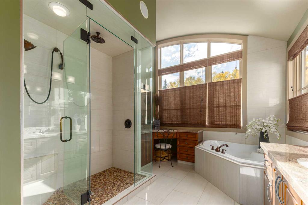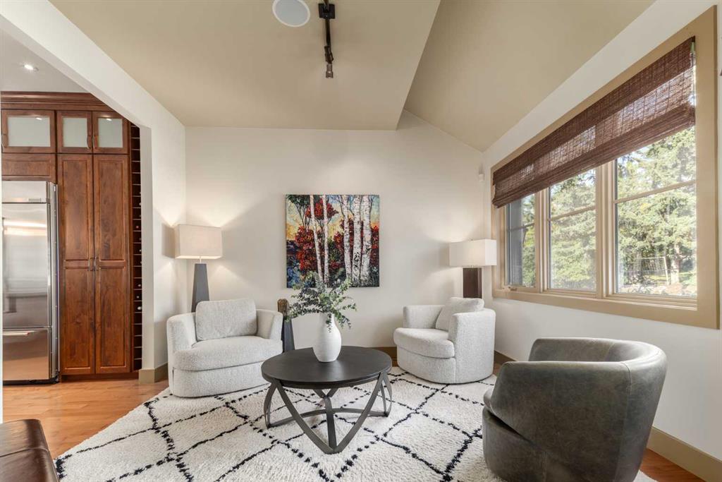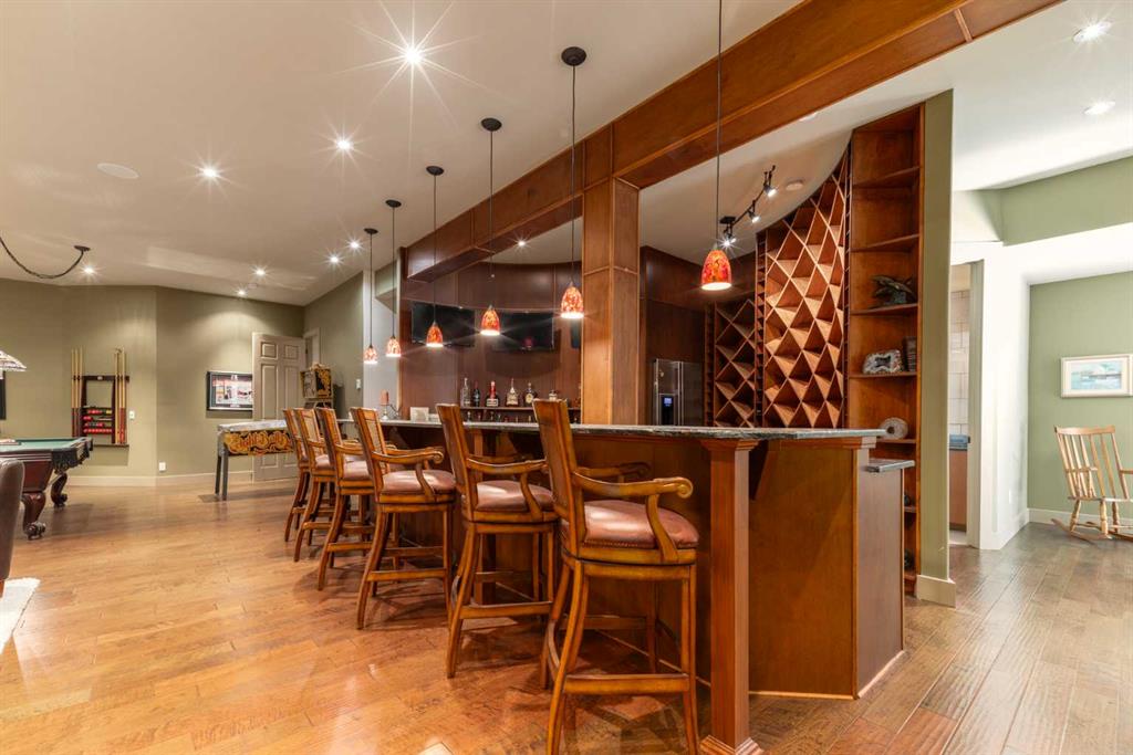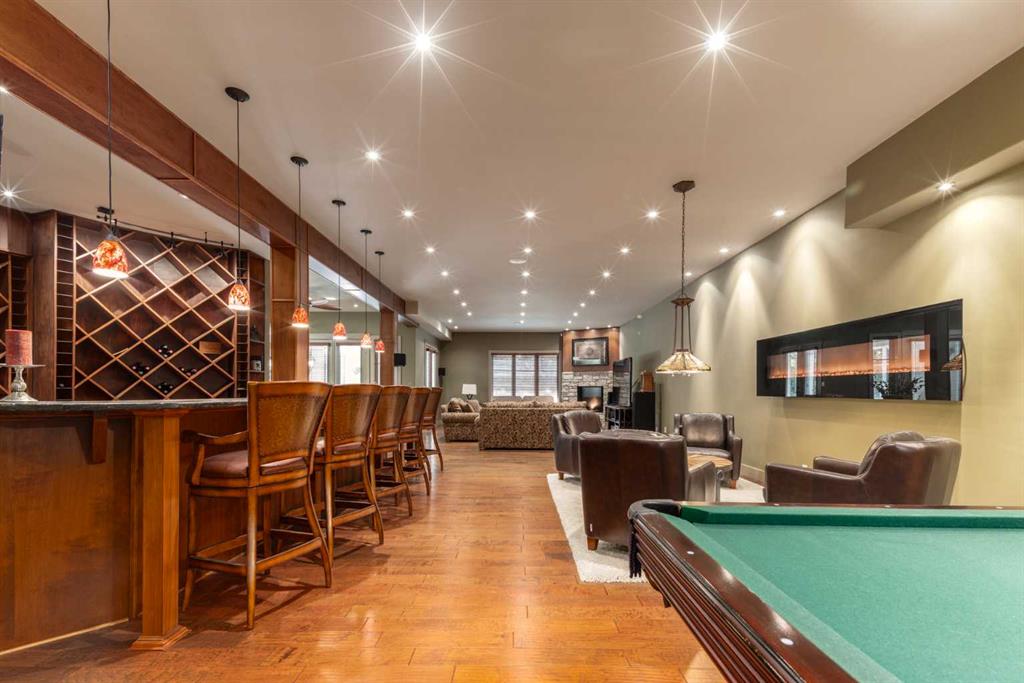 The primary suite, tucked thoughtfully on the main level, is an indulgent escape. Here, mornings begin with light filtering through the trees, and evenings end in the deep calm of a spa-inspired ensuite—complete with a soaker tub, oversized shower, and the promise of relaxation.Ascend the elegant curved staircase to discover two beautifully appointed bedrooms, each with unique architectural charm inviting rest and reflection. The shared, spa-inspired bathroom adds a touch of everyday luxury, with dual sinks & sleek finishes perfect for every family. In the walk-out level, the home reveals a space designed for pure indulgence and effortless entertaining. At its heart stands a custom-built bar, a masterpiece of rich woodwork and impeccable detail, perfect for hosting elegant gatherings or relaxed evenings. Multiple televisions line the entertainment area, creating the ideal backdrop for game nights, while the warm glow of an elegant fireplace adds a touch of charm that encourages lingering conversation. Beyond the entertainment zone, there’s ample space to accommodate a fitness studio or hobby room. This is more than a residence—it’s a lifestyle defined by grace, craftsmanship, and the quiet luxury of living beautifully.