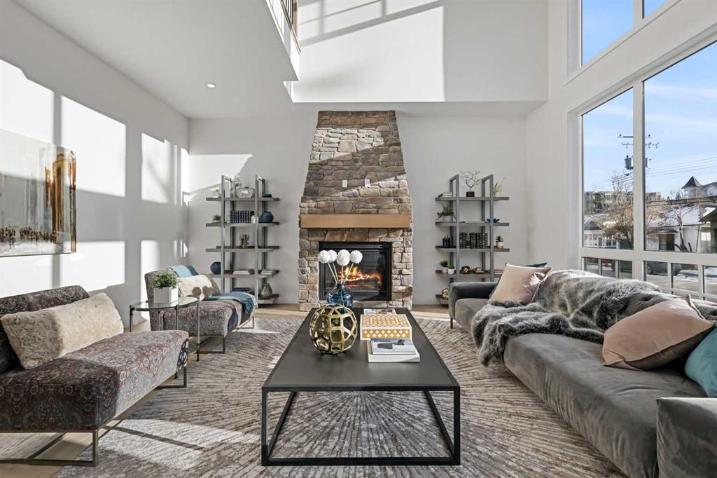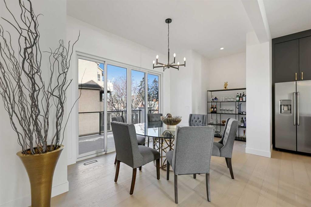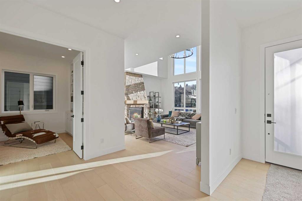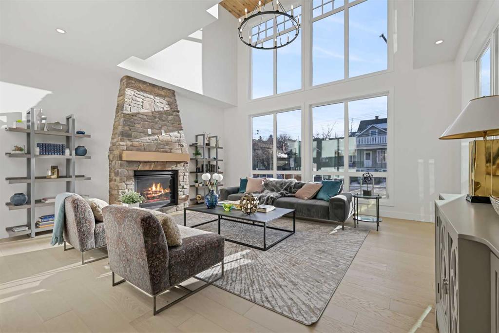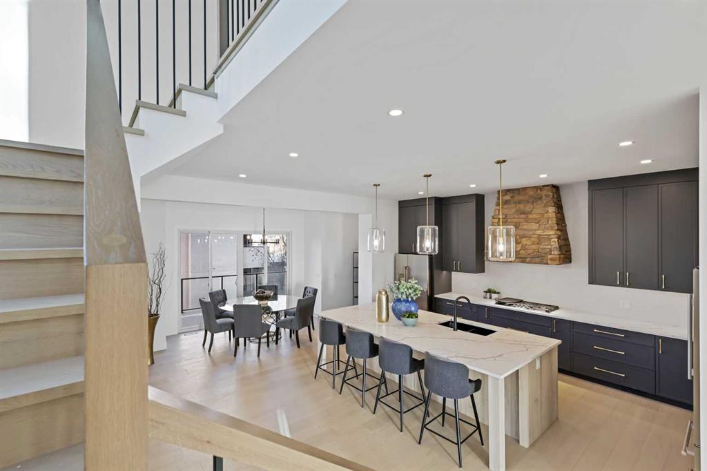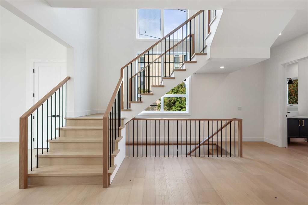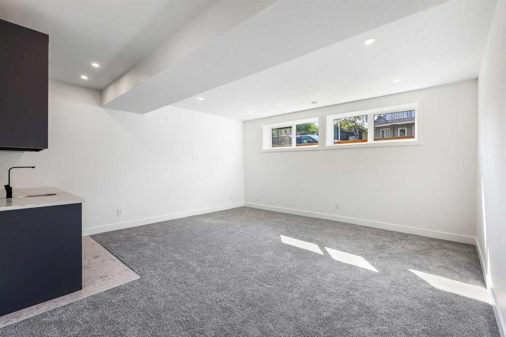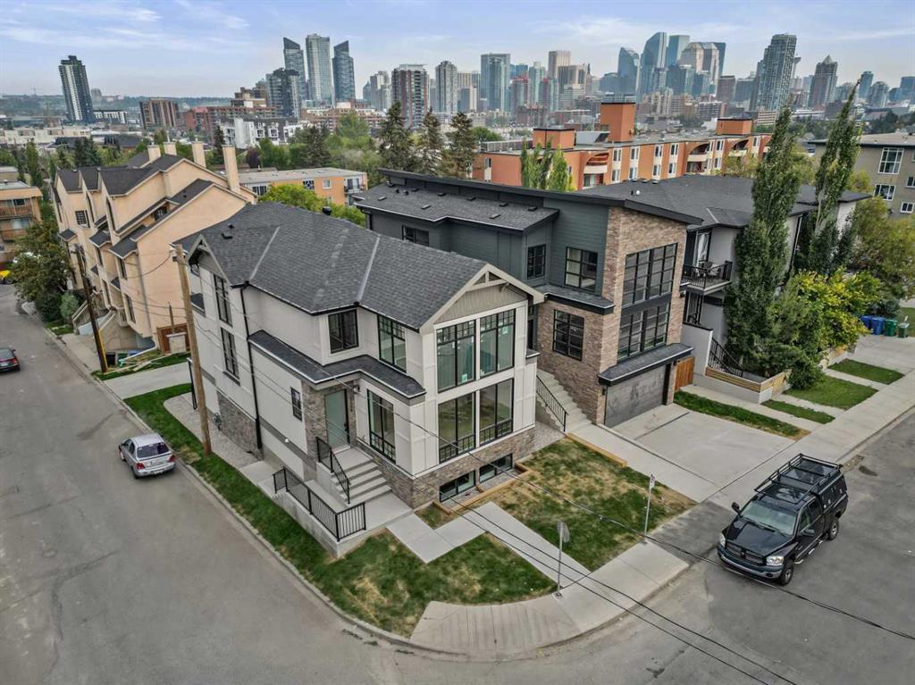 Welcome to 1516 22 Ave SW — a brand-new, luxurious infill offering panoramic Downtown views in the heart of Calgary’s highly sought-after Bankview neighborhood. With 3,465 square feet of meticulously crafted living space, this modern masterpiece boasts 4 spacious bedrooms, 4 designer bathrooms, and a stunning fusion of comfort, style, and sophistication. Step inside to soaring vaulted ceilings accented with rich wood tones, creating a warm and inviting atmosphere. The sun-drenched living room features custom built-ins, a dramatic stone gas fireplace, and expansive bay windows that frame the skyline. A versatile den or home office adds functional flexibility. The chef-inspired kitchen is a standout, equipped with premium GE Café appliances including a wall oven, gas cooktop, and microwave. Elegant quartz countertops, chic blue cabinetry, a generous island, and a handcrafted stone range hood are complemented by a crisp white tile backsplash. A dedicated wine cellar adds a touch of indulgence. The adjacent dining room is ideal for everyday meals or elegant entertaining. Upstairs, the serene primary suite offers a walk-in closet with custom built-ins and a luxurious 5-piece ensuite with a soaker tub, dual sinks, and a glass steam shower. Two additional bedrooms, each with their own walk-in closets, share a stylish 4-piece bathroom. Enjoy sweeping Downtown views from the private second-floor deck. The upper-level laundry room includes a washer, dryer, sink, and ample storage for added convenience. The fully developed walk-out basement is perfect for entertaining or relaxing, featuring a large family room, wet bar, guest bedroom, 3-piece bath, and generous storage. The oversized lot enhances the home’s spacious feel and natural flow. Perfectly positioned near 17th Avenue’s vibrant shops and restaurants, Marda Loop, Mount Royal University, and with easy access to Downtown, this extraordinary residence is more than a home — it’s a statement of modern luxury living.