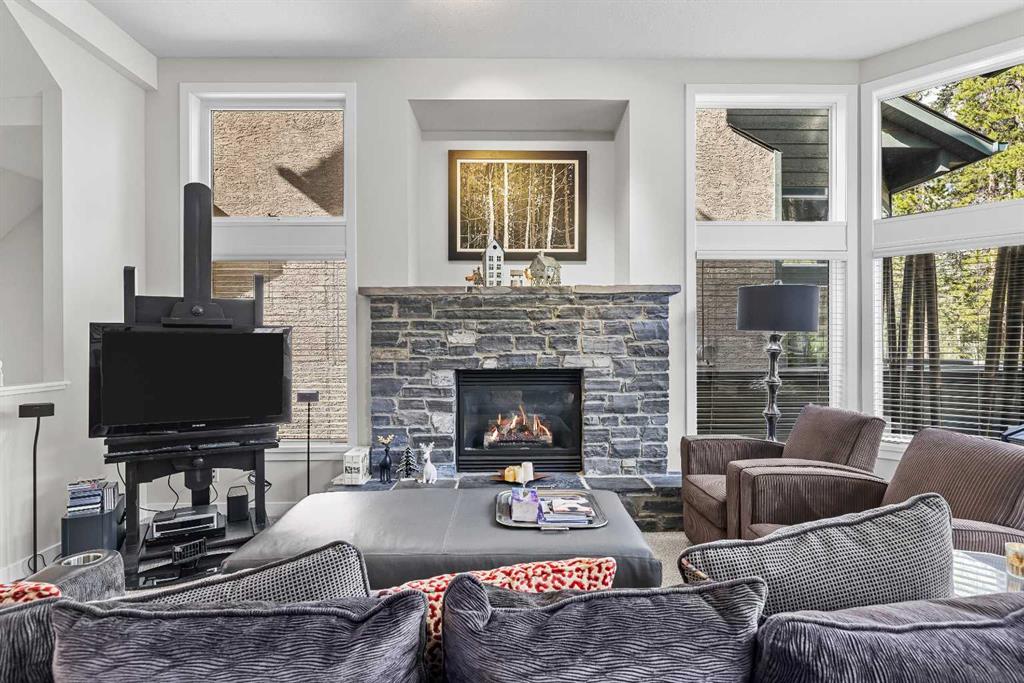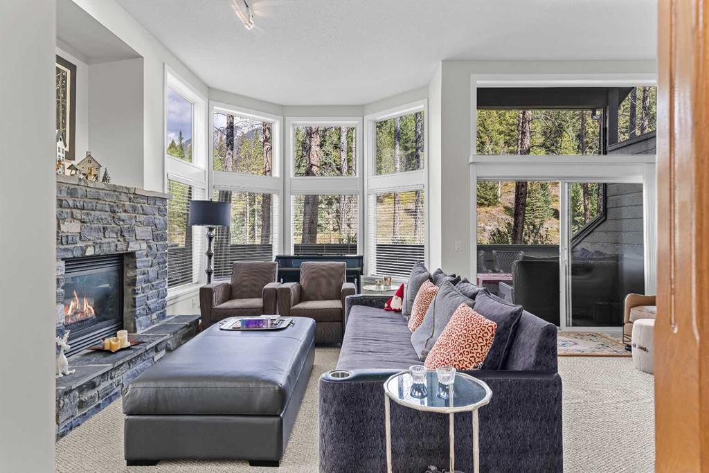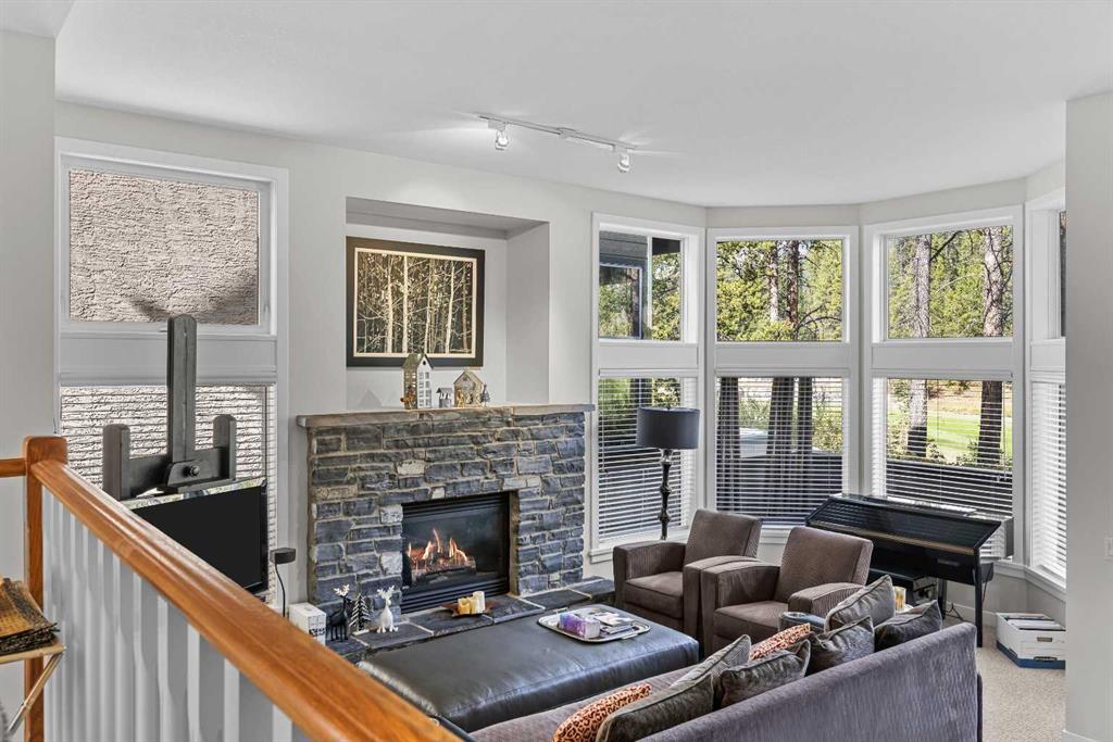 A rare opportunity awaits in Aspen Glen, Grizzly Ridge, a serene end unit townhome community tucked away along the coveted fairways of Silvertip Golf Course. This spacious 3-bedroom, 4-bathroom home combines mountain charm with thoughtful design, offering both privacy and spectacular views. Step inside to a bright and inviting entry, where skylights above the foyer and staircase flood the home with natural light. The sunken living room is the heart of the home, showcasing tall ceilings and a wall of windows that frame the tranquil golf course backdrop of hole number 1. A cozy fireplace adds warmth, while the spacious dining room and breakfast nook capture stunning mountain vistas, including the iconic Three Sisters. This home also has A/C for added comfort. Upstairs, you’ll find two generously sized bedrooms, each with its own ensuite, plus the convenience of laundry on the same level. The lower level provides flexibility with an optional third bedroom or family room, complete with a second fireplace and access to a full 4-piece bathroom. Additional highlights include a double-car garage, abundant natural light throughout, and a floor plan designed to accommodate full-time living, weekend escapes, or hosting friends and family in style. Backed by golf course serenity and fronted by mountain views, this townhome delivers a lifestyle that’s uniquely Canmore, peaceful, private, and perfectly located.