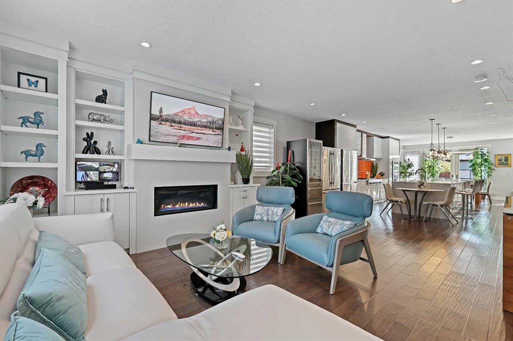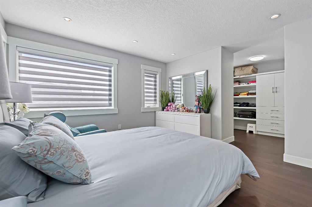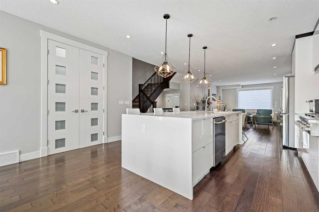 A rare opportunity in Montgomery — semi-detached home stands out with four fully finished levels, nearly 4000 sqft of developed living space, a private balcony, and a long list of premium upgrades. Steps from the Bow River pathway, Shouldice Park, Market Mall, and minutes to both Foothills and Children's Hospital, this location is as connected as it is private. Inside, the home is finished with luxury Canadian maple hardwood on all upper levels, layered lighting (including updated LED fixtures), and fresh paint throughout. The main floor showcases a sleek chef's kitchen with JennAir stainless steel appliances, including a gas cooktop, built-in oven, chimney hood fan, and integrated microwave. A full walk-in pantry, with double doors, and extended island with waterfall quartz complete the space. The spacious living area offers floor-to-ceiling windows and a gas fireplace framed by custom tile. The second level hosts dual primary suites, each with walk-in closets and five-piece ensuites featuring full tile, deep tubs, and separate glass showers. A bonus room with custom built-in shelving and a full laundry room with storage complete this level. On the top floor, a third bedroom, with its own 5 pc ensuite, walk in closet, and dedicated office that's open to a private rooftop balcony with unobstructed views. The fully developed basement includes a fourth bedroom, full bath, in-floor heating, large rec room with wet bar and beverage fridge, and extra storage. Additional upgrades include: newer high-capacity heat pump system, Kinetico water softener, dechlorinator, purified drinking tap, security cameras (x4), dual doorbell cams, Hunter Douglas window coverings and a freshly painted interior. Detached garage and landscaped yard, with a large deck and beautifully tended garden complete the package.