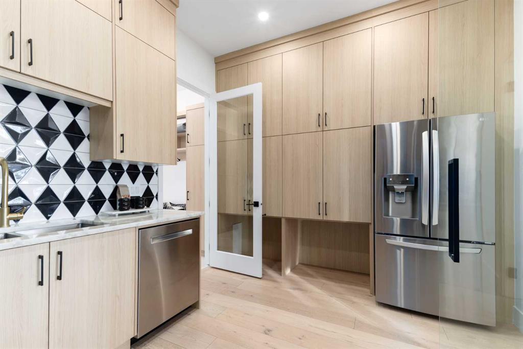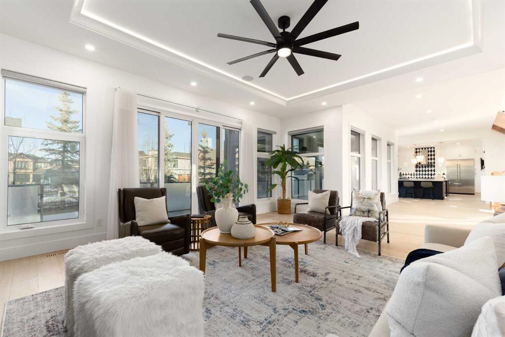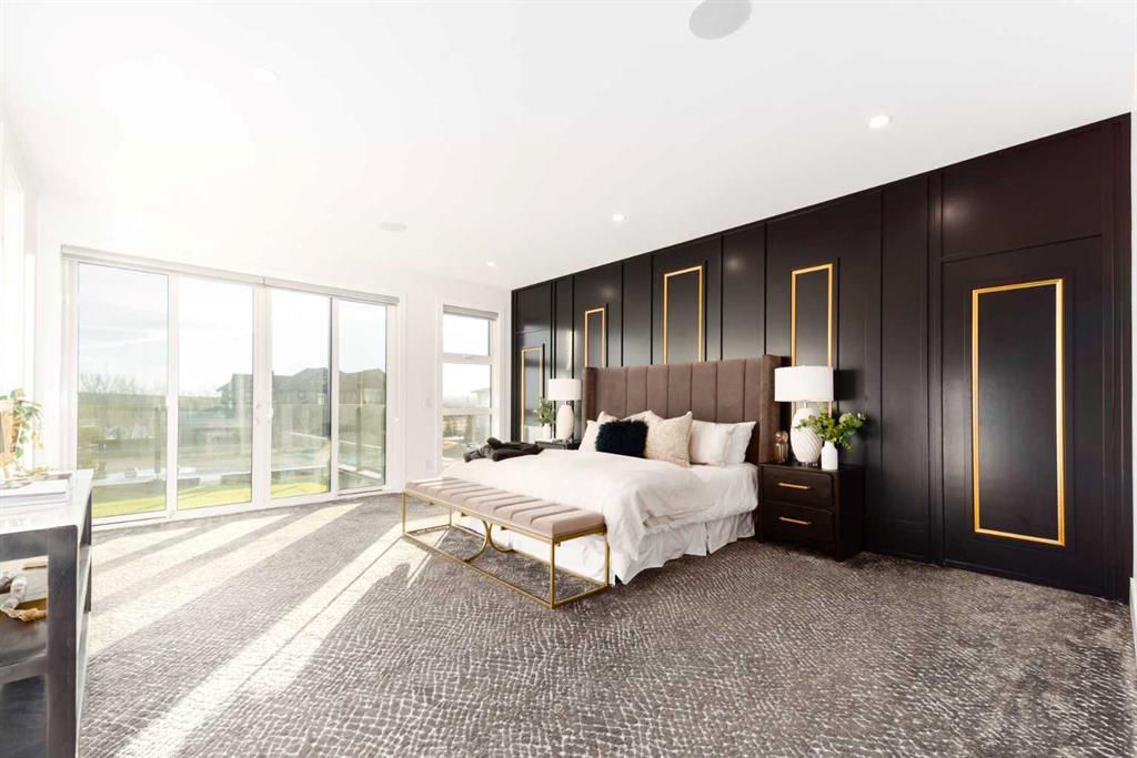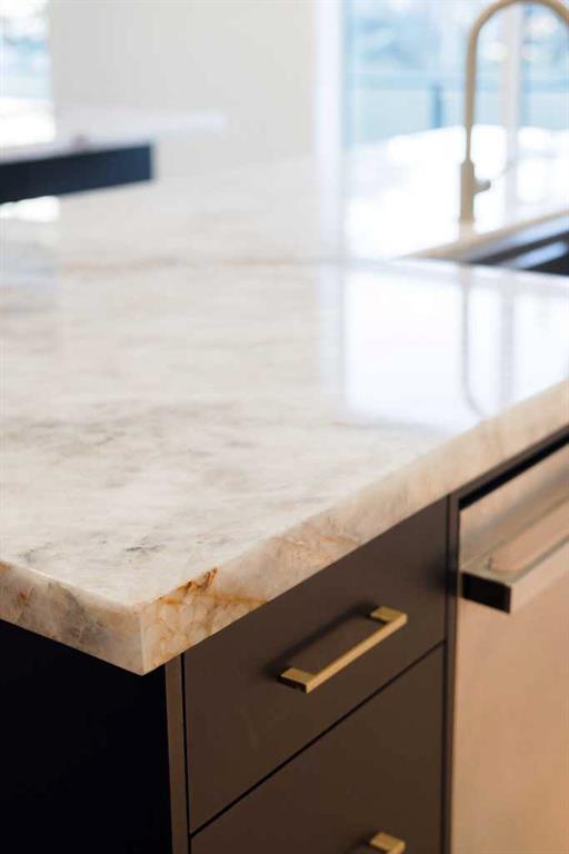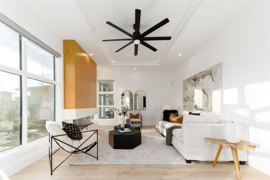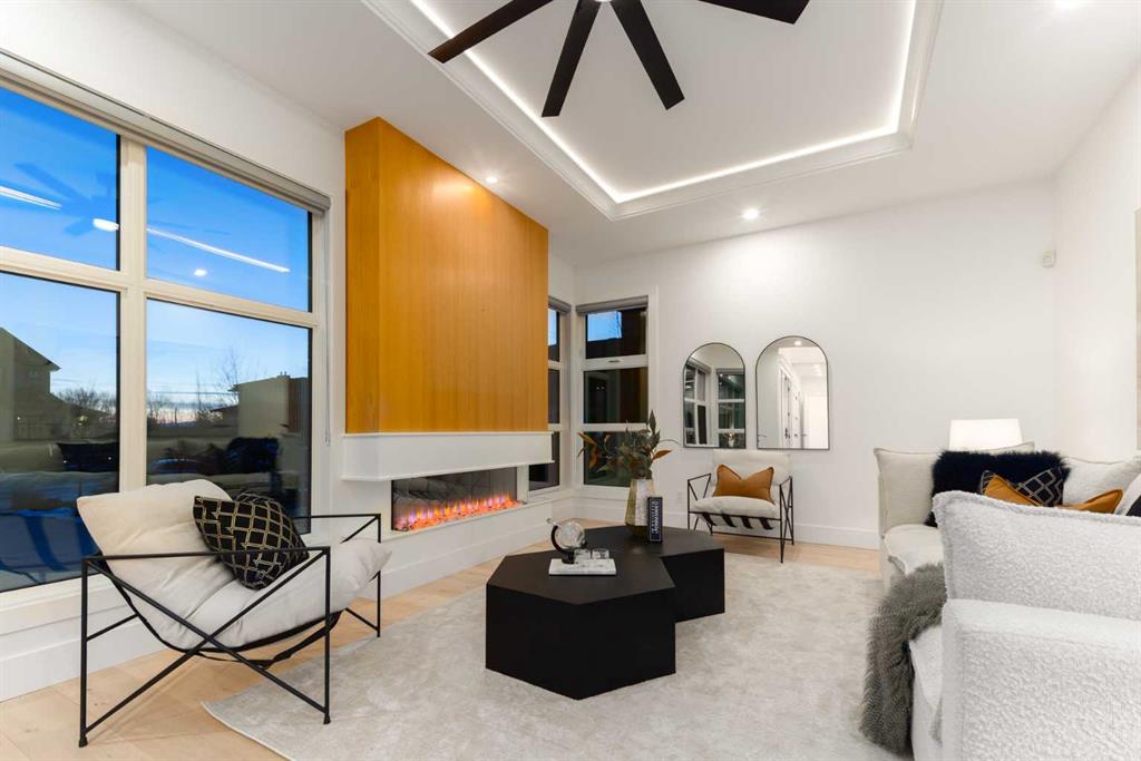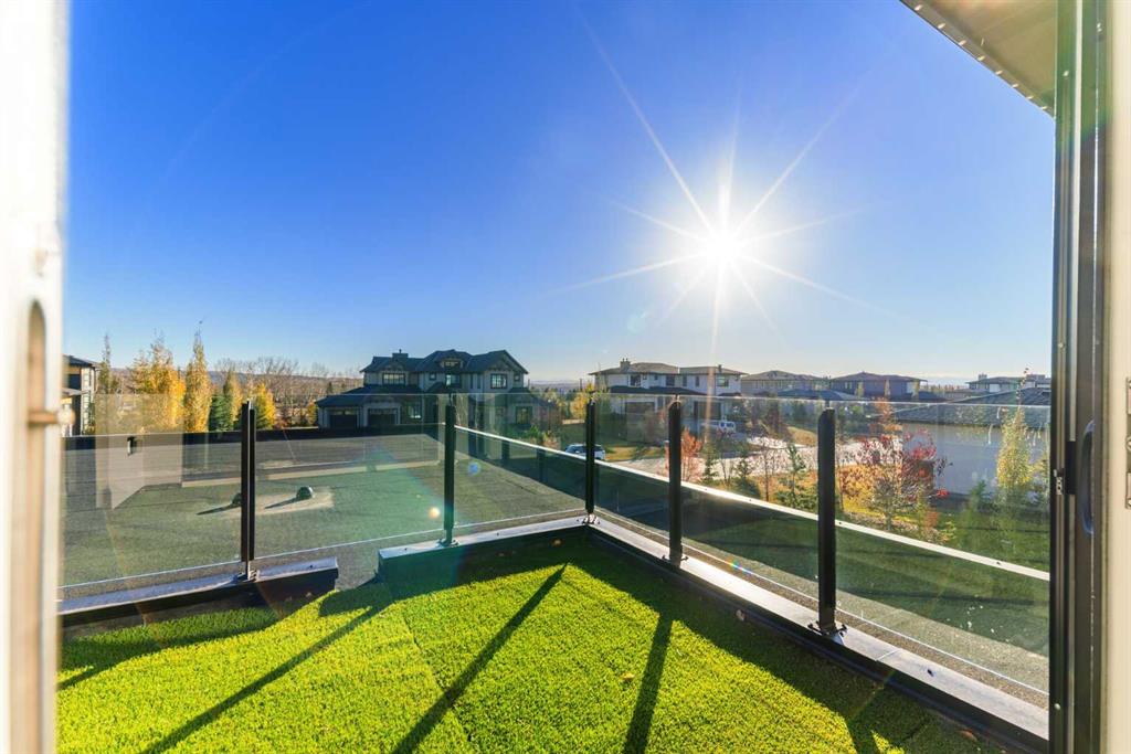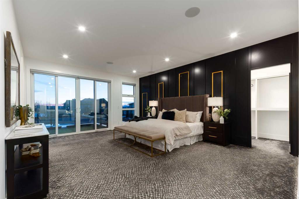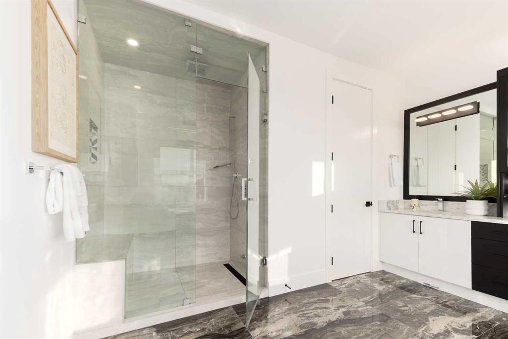 NEW PRICE! This modern estate in Calgary’s prestigious Watermark community showcases precision construction, advanced systems, and contemporary design spanning throughout over 7600 SF of total developed living space. A heated four-car garage features a durable epoxy floor, radiant in-floor and gas heating, a half bath, and ample space for a workshop or bench setup. Inside, a residential elevator provides full accessibility across all levels, while engineered hardwood flooring, custom millwork, and an open-riser glass staircase define the home’s architectural character. The great room features a tray ceiling with recessed lighting and a linear gas fireplace framed in charcoal tile, blending form and function. The chef’s kitchen is anchored by dual onyx-clad islands, gloss-white cabinetry, brass fixtures, and Jenn-Air professional appliances, complemented by a full prep kitchen with induction cooktop, secondary refrigerator, and dishwasher for seamless entertaining. The formal dining area includes built-in cabinetry, crown detailing, and geometric backsplash, while a front sitting room with a wood-accent fireplace, glass-enclosed office, and powder room with onyx counter and brass accents complete the main level. A well-appointed mudroom offers full-height storage, marbled tile, and a built-in bench for easy transitions. Upstairs, the primary suite includes a private balcony with mountain views, dual walk-in closets, and a spa ensuite with heated floors, dual vanities, steam shower with dual rain heads, and a deep soaker tub. Three additional bedrooms feature walk-in closets, with both Jack & Jill and private ensuite layouts. The upper level also offers a loft, study nook, and laundry room with quartz counters, extending to an outdoor patio finished with glass railings and synthetic turf. The lower level is designed for recreation and fitness, with a quartz wet bar, brass fixtures, beverage fridge, custom shelving, media area, mirrored gym, and two bedrooms with walk-in closets and full baths. Finishes include luxury vinyl plank, recessed lighting, and marbled tile throughout. Mechanical highlights feature radiant in-floor heating throughout the lower level, high-efficiency HVAC, smart lighting controls, and an integrated sound system — combining craftsmanship, durability, and performance in one of Watermark’s most technically refined residences.