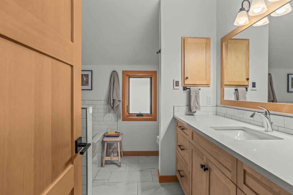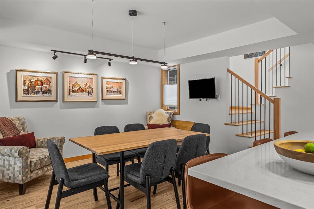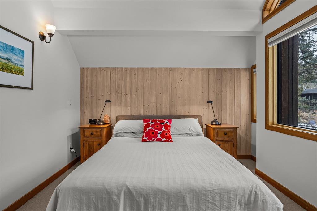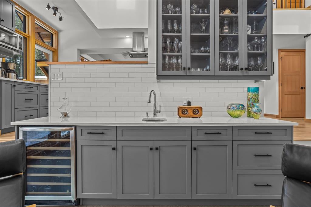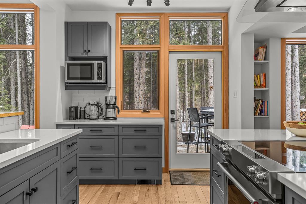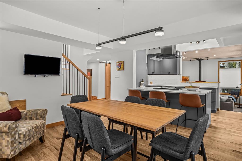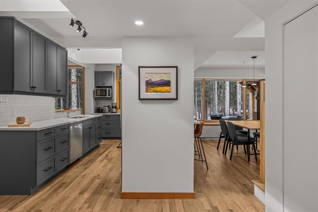 Tucked into the heart of Canmore, this beautifully fully renovated 4-bedroom, 2-bath home offers a rare blend of privacy, walkability, and thoughtful design. Backing directly onto a peaceful treed reserve and creek, the setting feels quiet and secluded - yet you’re just steps from cafés, shops, restaurants, and the town’s extensive pathway network. Completely re-done in 2021, the home showcases warm, modern finishes throughout, including oak hardwood flooring, custom fir millwork, and vaulted ceilings on the upper level. Large windows frame forest views and fill the home with natural light, while the open-concept layout creates an effortless flow for both everyday living and entertaining. The kitchen is designed with both style and function in mind, featuring quartz countertops, stainless steel appliances, a skylight, and a thoughtfully designed pantry with butcher block workspace. Just beyond, the dining and living areas offer inviting spaces to gather - complete with a wood-burning stove, feature wet bar, and seamless connection to the expansive outdoor deck. Step outside to your private backyard oasis - backing onto nature and designed for year-round enjoyment. With ample space for dining, lounging, and evenings around the fire, plus natural gas hookups and low-maintenance landscaping, it’s the perfect extension of the home. Inside, the four bedrooms offer exceptional flexibility. Built-in Murphy beds allow for easy transformation between guest space, office, or family living, while the upper-level primary retreat features two walk-in closets and a beautifully appointed ensuite with a soaker tub. A private balcony off one of the upper bedrooms provides a quiet place to take in the surrounding forest views. Additional features include a heated concrete slab on the main level, a spacious mudroom with built-in storage, high-efficiency laundry, an oversized heated garage with epoxy floors, and a backyard storage shed. With easy highway access and an unbeatable central location, this is a home that offers both convenience and a true connection to nature - designed to adapt to your lifestyle and elevate everyday living.