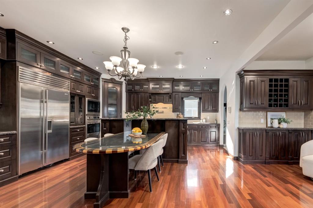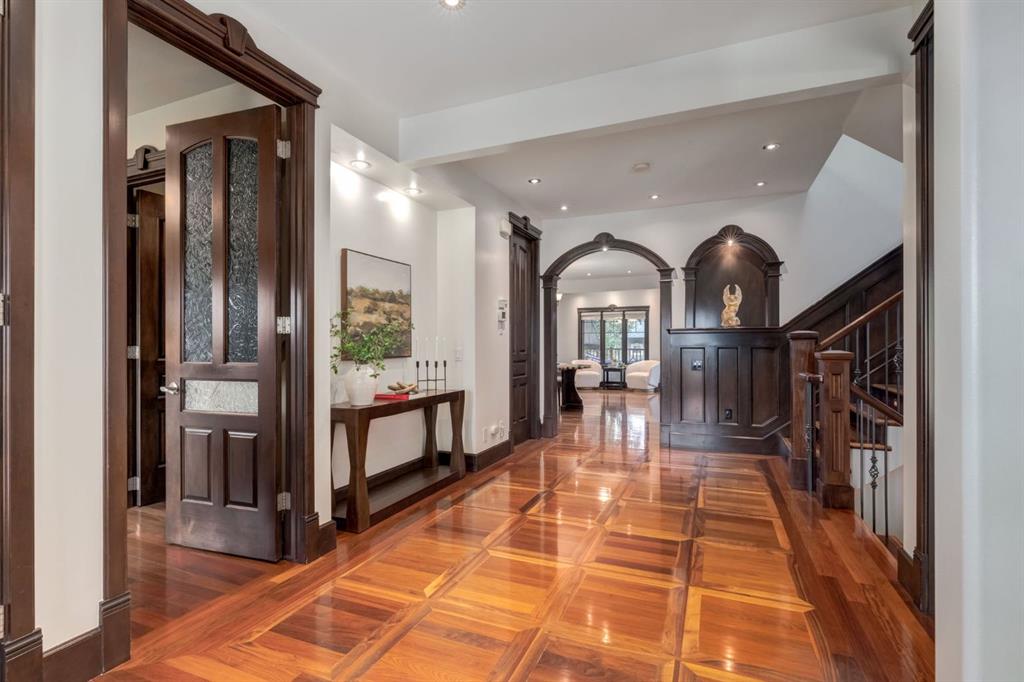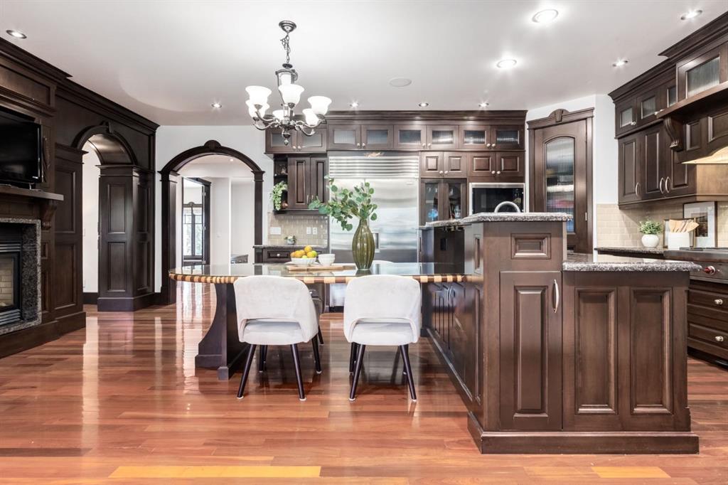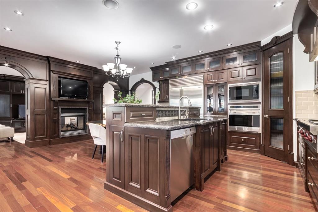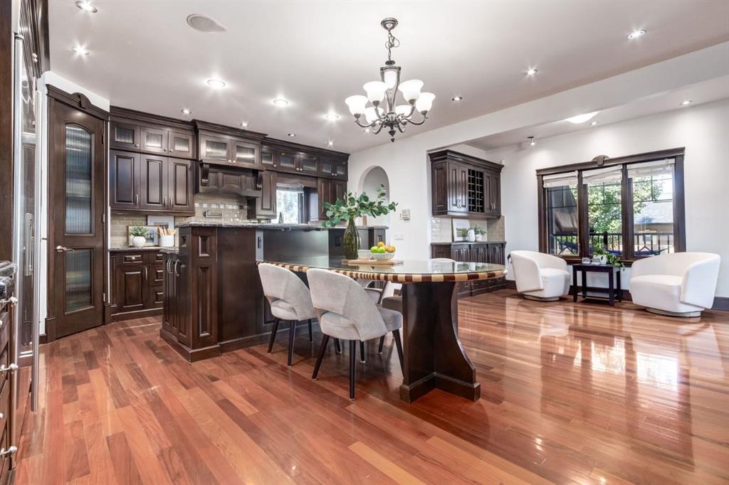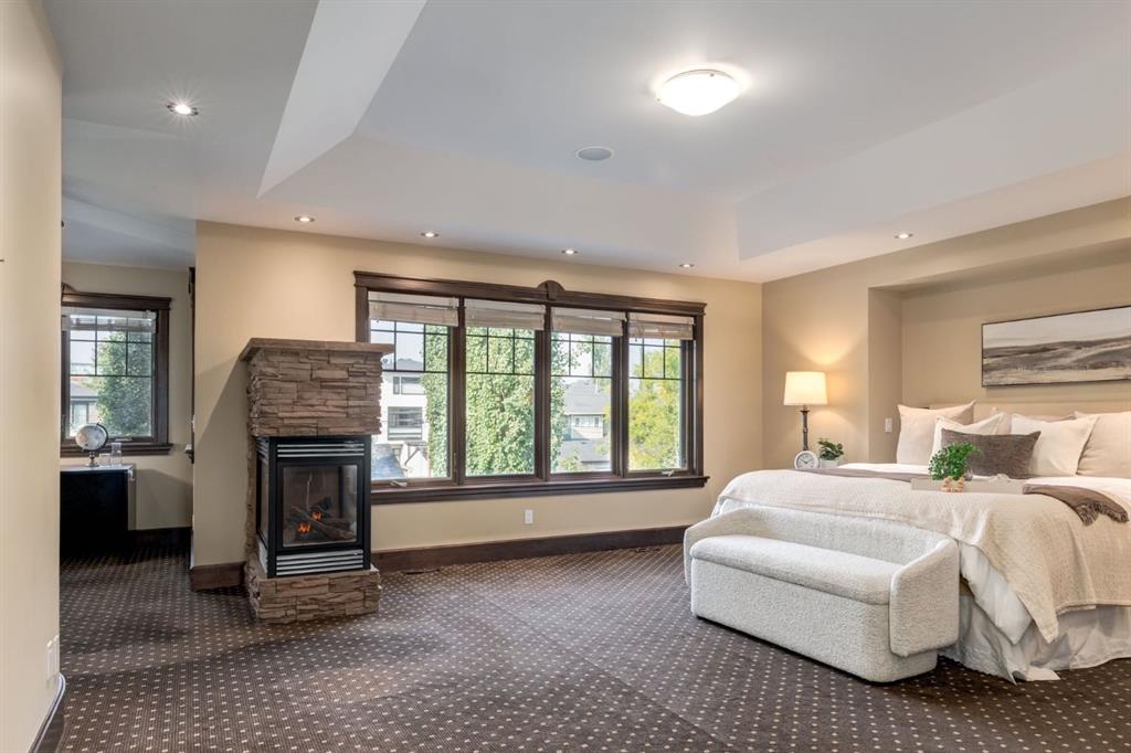 This extraordinary custom estate offers over 5,200 sq. ft. of total living space, situated on a massive 179' deep lot, plus more than 1,100 sq. ft. of covered outdoor areas, all with sweeping views of the Bow River and downtown skyline. From the foyer, the craftsmanship is immediately evident with over 8,000 board feet of maple millwork, solid maple doors, Brazilian walnut floors, and exotic hardwoods such as tiger wood, bird’s-eye maple, ebony, kaiju, walnut, and cherry, all installed by master artisans. The main floor offers a front-facing primary bedroom with a private ensuite with jetted shower and tub, and in-floor heat. A formal dining space or office, and a showpiece kitchen appointed with a Wolf gas range, Sub-Zero fridge, Bosch dishwasher, walk-in pantry, curved cabinetry, beveled granite counters, and a custom removable island table. The adjoining living room is anchored by a fireplace and opens seamlessly to expansive covered decks with cedar ceilings and stamped concrete, creating year-round indoor-outdoor living. Upstairs, four bedrooms include two full primary suites with fireplaces and spa-inspired ensuites, while the main retreat enjoys a sitting area, walk-in closet, heated floors, jetted tub, and steam shower. Another primary bedroom with an ensuite, two additional beds with a jack-and-jill bath, one with a built-in fireplace, a wet bar, which leads out to the balcony with skyline views, and a laundry room complete the second level. The fully developed walk-out/walk-up basement offers a recreation room, kitchenette, two more bedrooms, and two bathrooms, all warmed by in-floor heating with direct access to covered patios. Outside, six distinct decks and patios surround the real-stone exterior, complemented by a finished four-car garage with skylights, a 66’ RV pad, stamped-concrete driveway, and rear alley access with space for lots of vehicles. Recent upgrades include a new roof, downspouts, custom putting green landscaping, and central A/C (2025), while a pre-poured foundation provides a ready-to-build addition (with city of Calgary Permit Approval). Surrounded by multi-million-dollar homes and set directly across from downtown Calgary, this rare riverfront property combines artisanal detail, scale, and location in a way that defines luxury living. Nestled just steps away from parks, trendy restaurants, and bars, this residence provides a serene escape in the vibrant Kensington district. Its proximity to the Bow River, downtown, the University of Calgary, SAIT, and Foothills Hospital makes it ideal. With easy access to Memorial Drive and Crowchild Trail, this is your opportunity to call this magnificent property your own. Don't hesitate to call today!