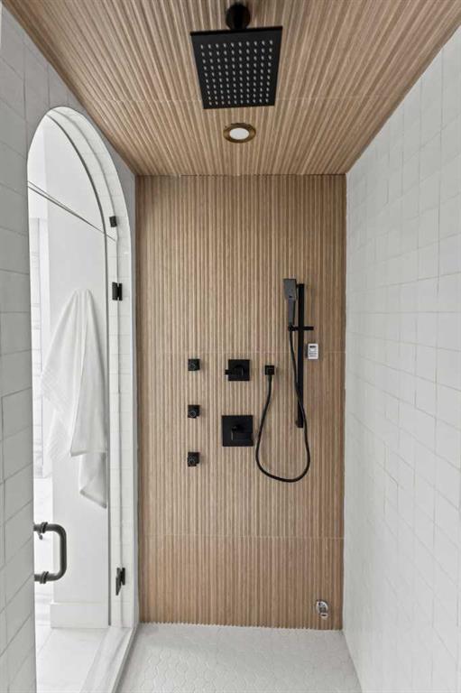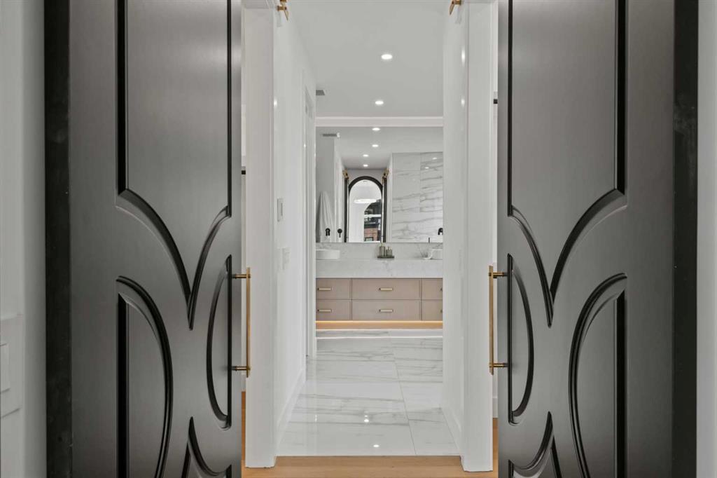 Upstairs, 9ft ceilings and oversized windows continue the sense of openness. A central bonus room provides flexible living space, while all bedrooms feature their own private ensuites. The primary retreat offers French doors, a private lounge area, and downtown views. Dual walk-through his-and-hers closets lead to a spa-inspired ensuite with heated floors, dual vanities, a freestanding soaker tub, and a fully tiled steam shower.