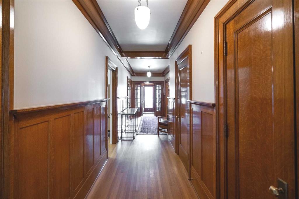 Inside, the home opens to a grand oak-clad hallway and a flowing floor plan highlighted by original quarter-sawn oak millwork, built-in cabinetry, and beveled-glass windows that showcase the craftsmanship of the period. The dining room leads to a sunroom with leaded glass windows, while the kitchen is equipped with floor-to-ceiling built-ins and a functional dumbwaiter. The grand living room features a striking fireplace, and the master suite offers a luxurious soaking tub. Dedicated leisure spaces include a poker room and a lower-level recreation area with ping pong and pool tables, a wet bar, and lounge space. Historic elegance, modern comfort, and an unbeatable location—all in one home.