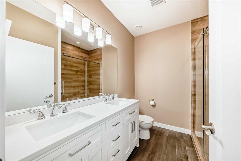 The lower level is an open plan with 9’ ceilings and an expansive rec room, two additional bedrooms, full bathroom with dual vanities and mechanical room.