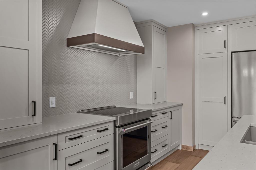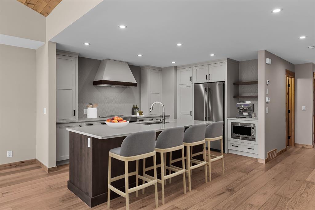 Privately positioned with a treed backdrop and the soothing feel of the creek nearby, this home is designed to deliver the mountain experience guests are looking for. The main living area is warm, bright, and beautifully finished, with vaulted wood ceilings, large windows, and an open-concept layout that takes full advantage of the views and natural setting. The kitchen is a standout, featuring quartz countertops, solid wood cabinetry, and KitchenAid stainless steel appliances, including an induction stove, all centered around a large island that invites gathering and entertaining.