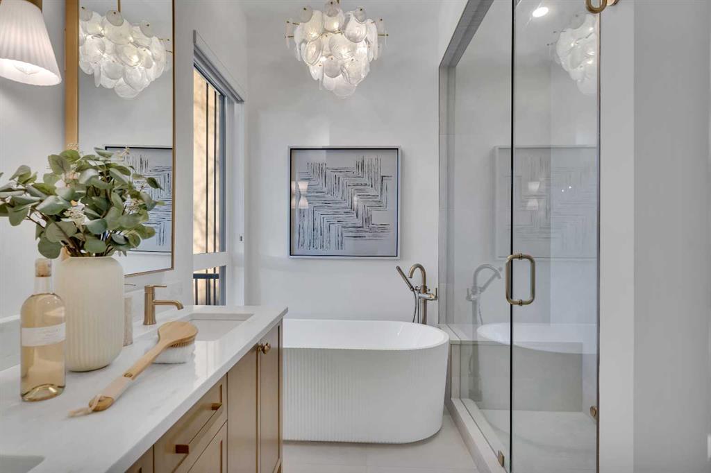 The spa-inspired ensuite features heated floors and a luxurious steam shower, while the main-level washroom showcases marble flooring, a custom vanity, and designer finishes. Custom closets, blinds throughout, and clean, casing-free windows complete the refined interior.