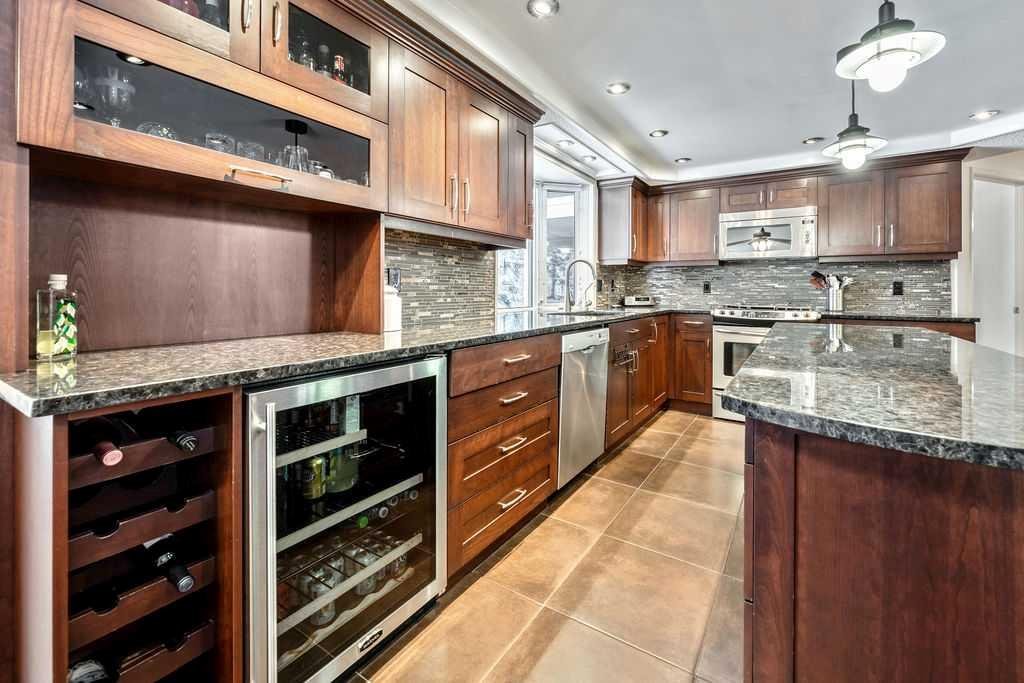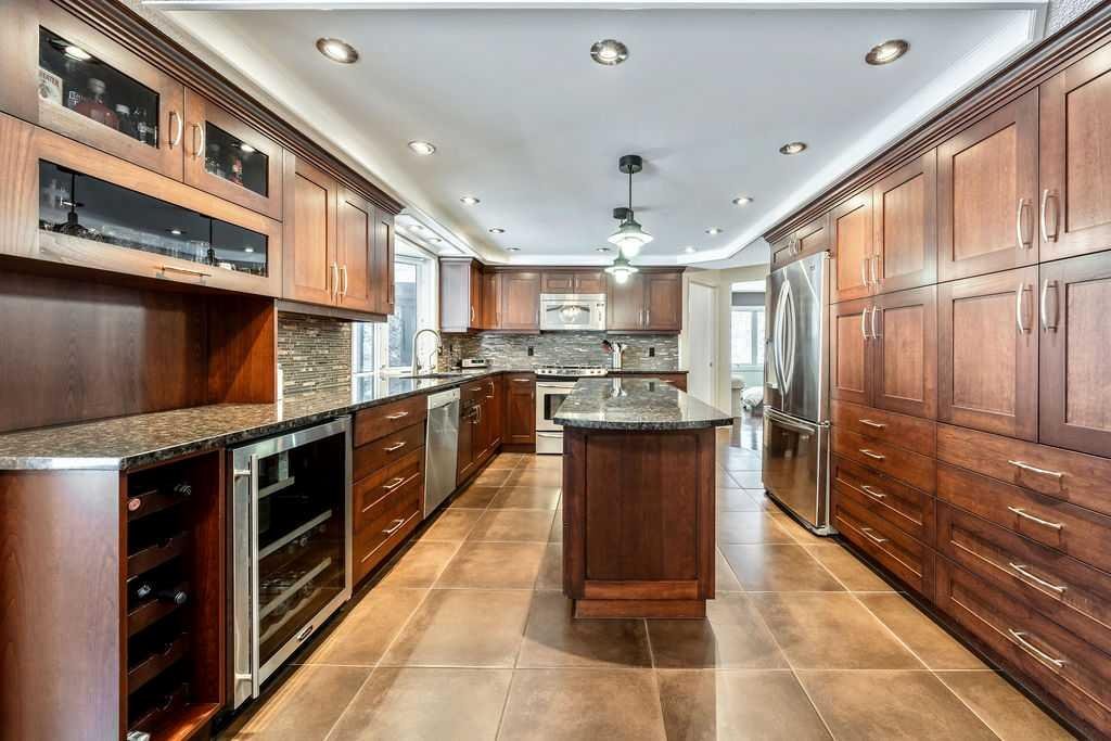 The main level is bright and welcoming, featuring a spacious front entry, rich hardwood floors, and large windows overlooking the property. The dining and sitting rooms are warm, comfortable spaces filled with natural light. The kitchen is practical and well-designed, offering full-height cabinetry, granite counters, a large island, wine storage, and a sunny breakfast nook with a clear sightline into the backyard.