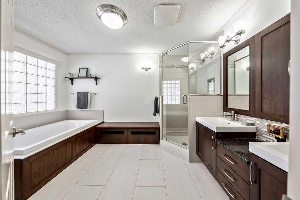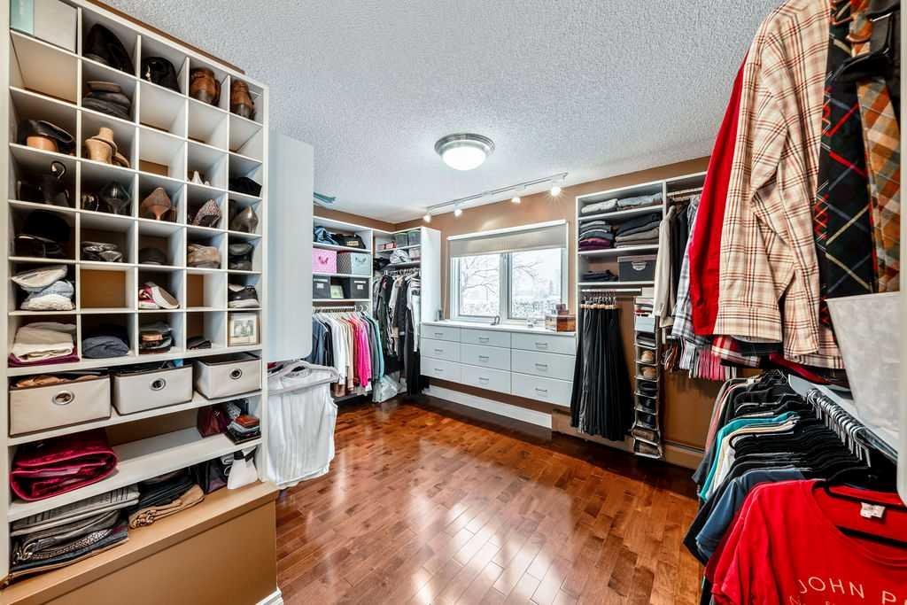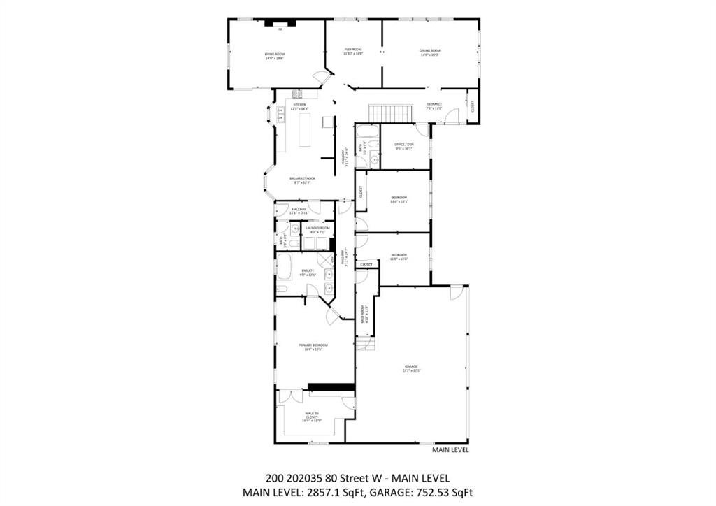 The primary suite offers a true sense of retreat with its impressive dimensions, easily accommodating a king bed along with space for a reading area or lounge furniture. The custom walk-in closet provides excellent organization, and the beautifully finished ensuite features a deep soaker tub, glass shower, double vanity, and rich wood cabinetry. Two additional bedrooms, a full bathroom, an office or den, a family room, a mud room, and a laundry room complete the main level.