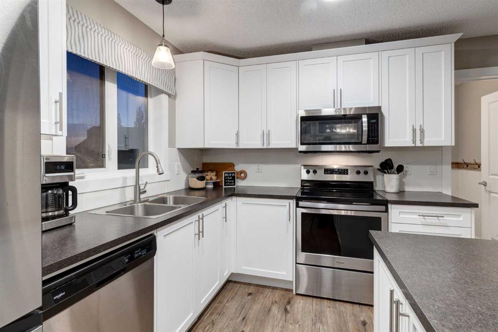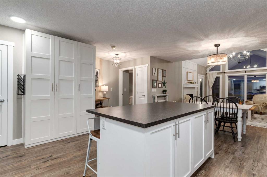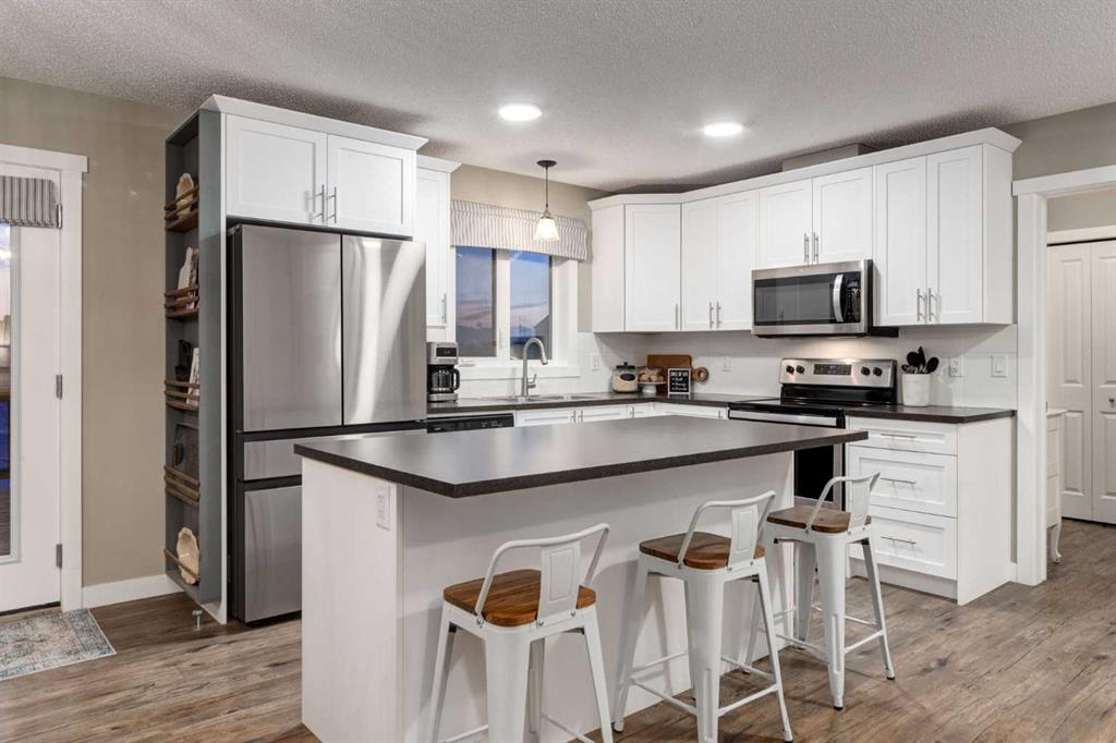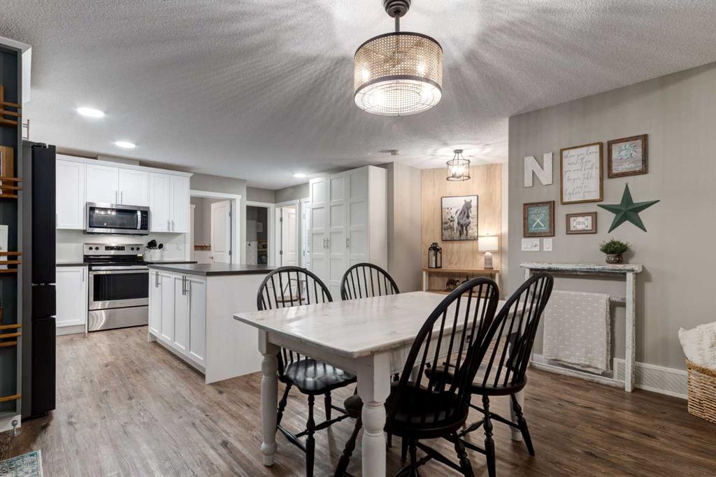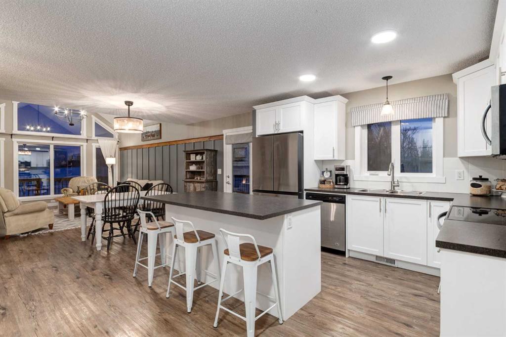 The Dining Room provides a COMFORTABLE AND FUNCTIONAL setting for evening dinners with family and friends. A WARM & INVITING KITCHEN ft CRISP WHITE CABINETRY, SS APPLIANCES, + a LARGE CENTRAL ISLAND w/seating. Thoughtfully designed w/ample storage, generous counter space, + bright overhead lighting, the kitchen flows seamlessly w/the living area + provides direct access to the INCREDIBLE DECK. The WRAPAROUND DECK offers INCREDIBLE MOUNTAIN VIEWS + a GAS BBQ LINE, creating the perfect space for outdoor entertaining and everyday enjoyment.