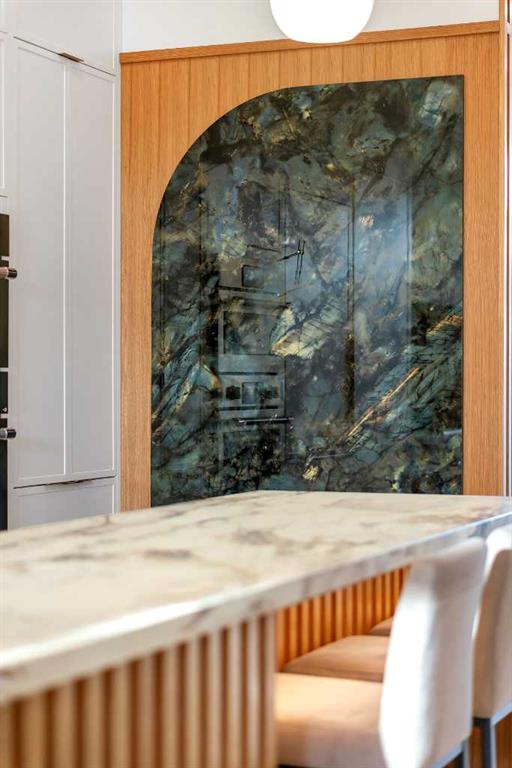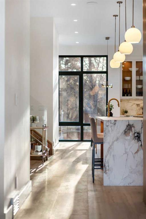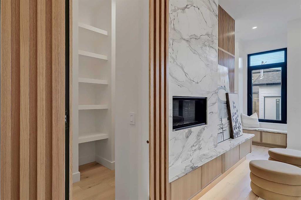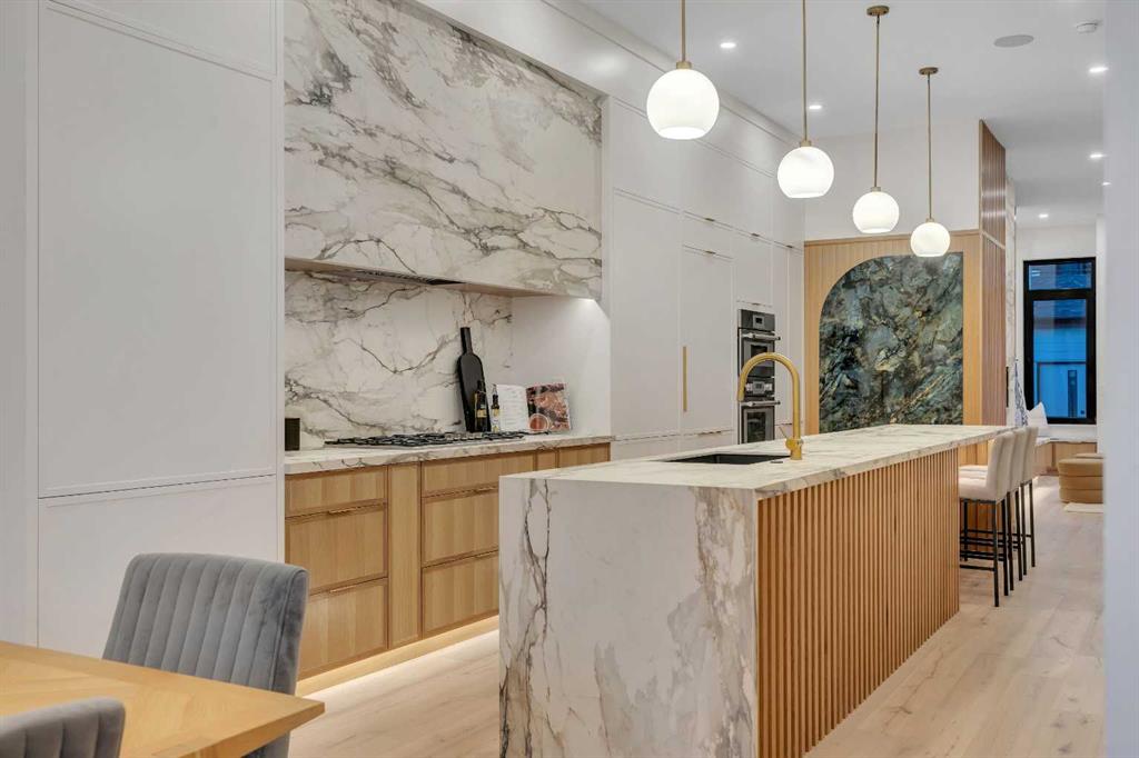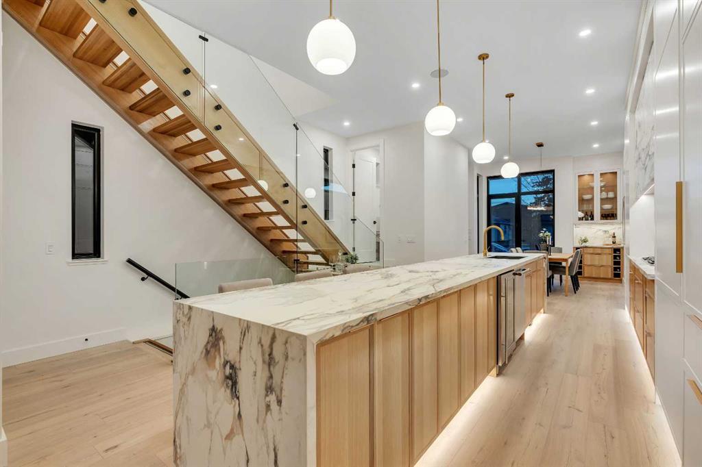 The open-concept main floor is designed for elevated living & entertaining, showcasing high ceilings, wide-plank hardwood flooring, and curated designer finishes. The chef’s kitchen features full-height custom cabinetry, HONED PORCELAIN countertops, backsplash & hood fan, a stunning PORCELAIN feature wall with built in clock, concealed walk-in pantry, waterfall island, and a premium THERMADOR appliance package including gas cooktop, wall oven, integrated refrigerator & dishwasher, and a beverage fridge. The dining area includes a statement chandelier and built-in buffet with wine storage and glass custom cabinetry, while the living room offers a custom media wall, inset gas fireplace, and full-height quartz surround overlooking the private backyard. A mudroom, powder room, and striking full-height GLASS WALL staircase complete the main level.