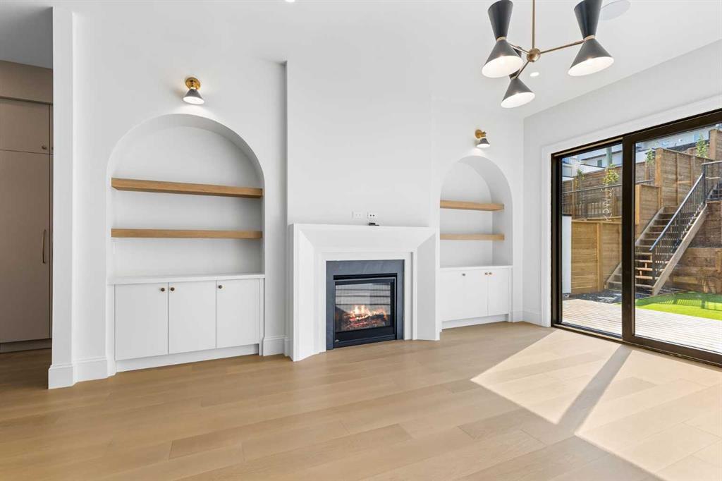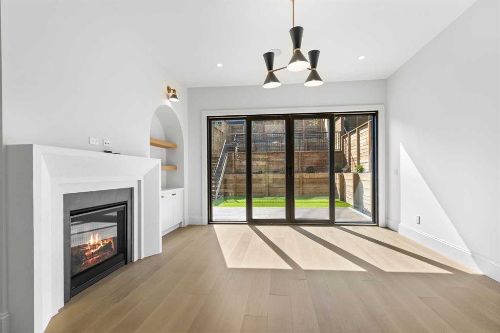 Across from it, the living room centers around a beautiful fireplace and custom built-ins which make it cozy, refined, and made for real living. Large doors lead to the deck and the sunny south facing backyard, that is tiered, turfed and truly low maintenance.