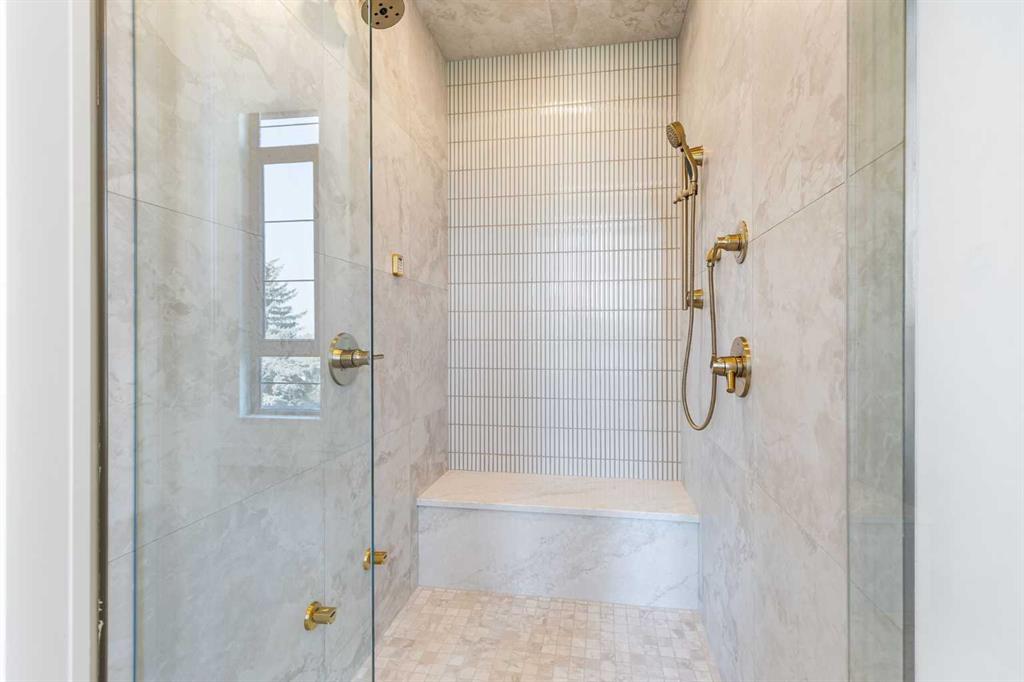 Upstairs, the primary suite is a serene retreat with a spa-like ensuite featuring a steam shower, dual vanity, custom tilework, and skyline views. Secondary bedrooms are generously sized, each with walk-in closets, and connected by a stylish bathroom ideal for kids or guests.