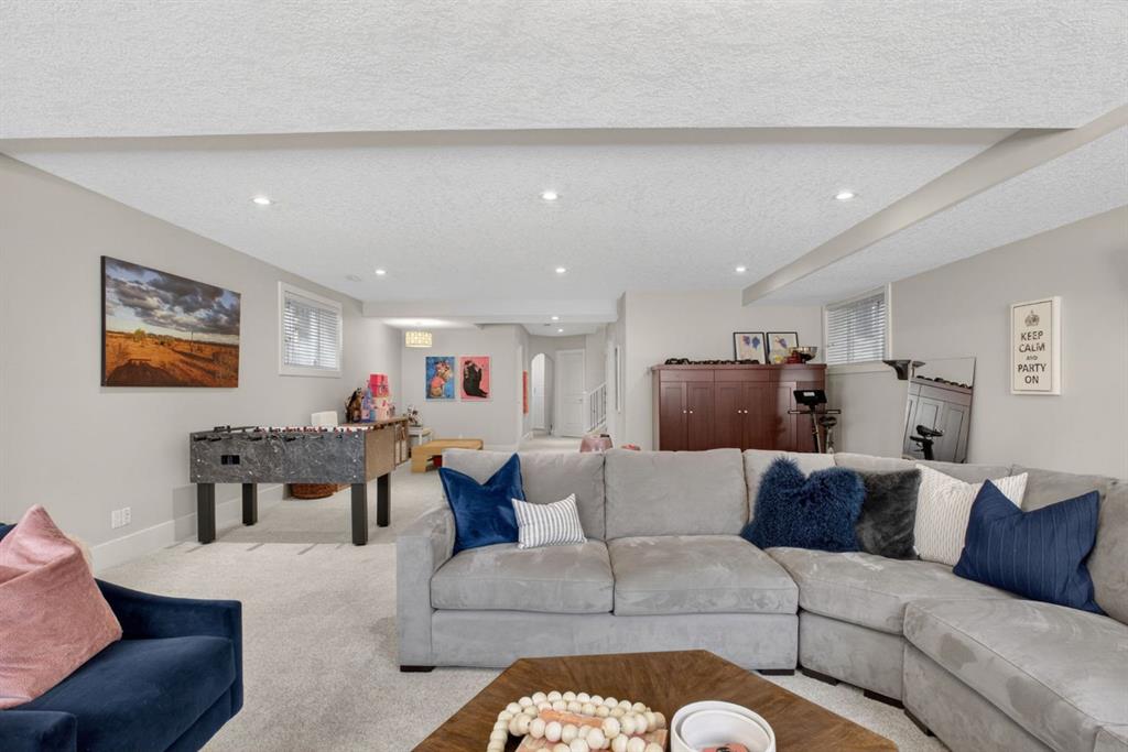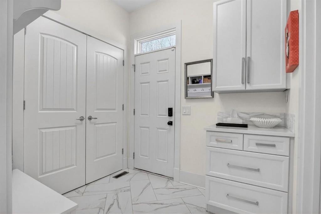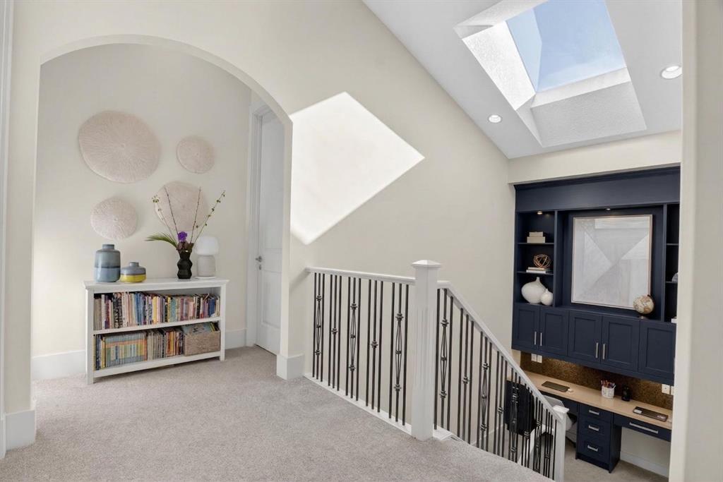 OPEN HOUSE: SATURDAY APRIL 18 2-4PM. Set on a 32.5 ft. wide lot and offering over 3,900 sq. ft. of developed living space, this home blends thoughtful design with high quality craftsmanship and standout custom features throughout. From the moment you step inside, you’re welcomed by a spacious front foyer, with a heated tile floor and a functional side mudroom. The home is filled with natural light thanks to expansive windows, while 10 ft. ceilings on the main floor and vaulted ceilings in all four upper bedrooms create an airy, elevated feel. A rare layout with 4 bedrooms upstairs (master plus 3 additional bedrooms) sets it apart from other homes in the area. Additional features like central air conditioning, central vacuum, water softener, and custom built-ins enhance both comfort and functionality. The open concept main floor showcases site finished exotic tigerwood hardwood flooring, high doorways, and a seamless flow between living, dining, and kitchen spaces. The kitchen, redesigned in 2016, is a true centrepiece, featuring a 10 foot island, ceiling height cabinetry, walk in pantry, and a premium appliance package including a paneled 42” Sub Zero fridge, Sub Zero beverage centre, Bosch cooktop, oven, steam oven, and dishwasher. Quartz countertops are carried throughout the home, complemented by a striking Calcutta Gold marble backsplash. The adjacent living area is anchored by a beautiful marble fireplace surround, while motorized custom drapery adds a refined finishing touch. A stunning staircase including a built-in desk area with curved treads connects all levels, leading to the upper floor where the primary suite offers a private retreat with his and hers closets and a spa inspired ensuite featuring heated tile floors, a steam shower, Bain Ultra air jetted tub, and double vanities. Three additional bedrooms, each with vaulted ceilings, complete the upper level, including a unique hidden passage between two of the bedrooms, seamlessly integrated into custom wall paneling. The fully developed basement extends the home’s versatility, complete with in floor heating, high ceilings, a large recreation and media area, a bright bedroom or office, full bathroom, and a flex space ideal for a home gym or additional storage. Basement offers additional square footage as the footprint is built out under the back deck, creating an open, expansive space. A custom built office setup with quartz desktop, built in filing, shelving, and brass library lighting adds another layer of functionality. Recent upgrades include new triple pane Lux windows on the upper level in 2024, further enhancing energy efficiency and comfort. Outside, the sunny south facing backyard is designed for both relaxation and entertaining, featuring a large aggregate deck, professional landscaping with mature perennials, and integrated landscape lighting.. This is a rare opportunity to own a meticulously designed property that combines space, quality, and unique architectural details in every corner.