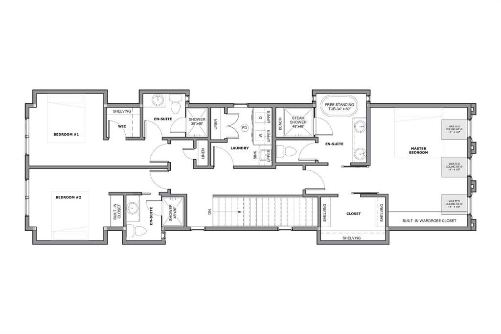 Upstairs, every bedroom has the comfort of its own ensuite. Two secondary bedrooms include a walk-in or built-in closet, offering ample storage. The laundry room sits between, complete with a sink and upper cabinets to keep chores easy and tucked away. The primary suite is a true retreat. VAULTED CEILINGS create a dramatic feel, while a BUILT-IN WARDROBE closet keeps everything streamlined along with the large walk-in closet. The ensuite delivers spa-level luxury with a STEAM SHOWER, freestanding tub, and dual vanities.
