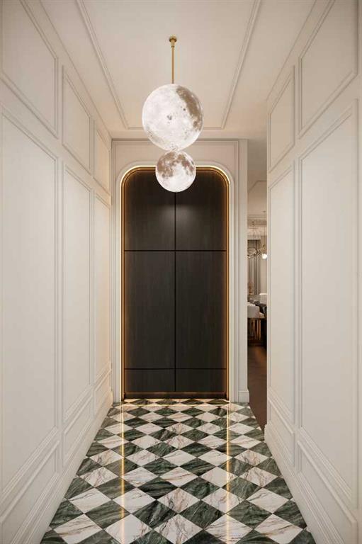 This home makes an impression. Its stately architecture and dramatic windows rise tall, blending timeless design with modern detail. The thoughtful layout begins in the foyer, where a built-in closet and bench keep everything organized. Just off the entry is a bright den, perfect for a home office or library, with a set of mullion windows framing the space. The contemporary powder room is nicely tucked next to the den, perfect for guests or clients.