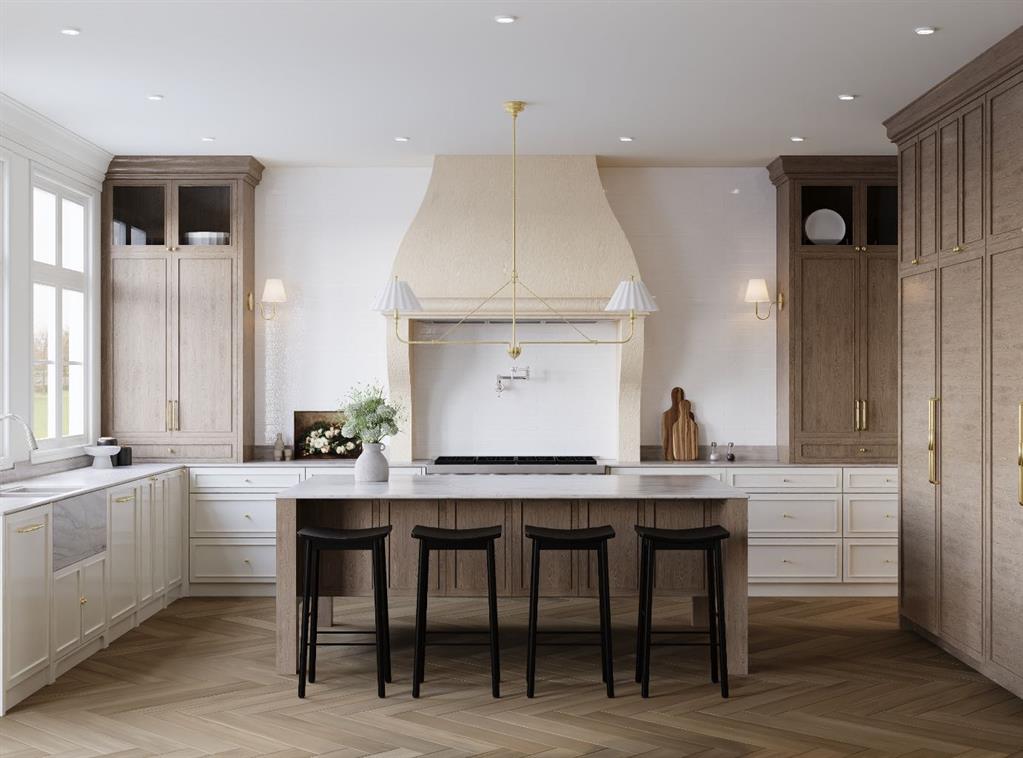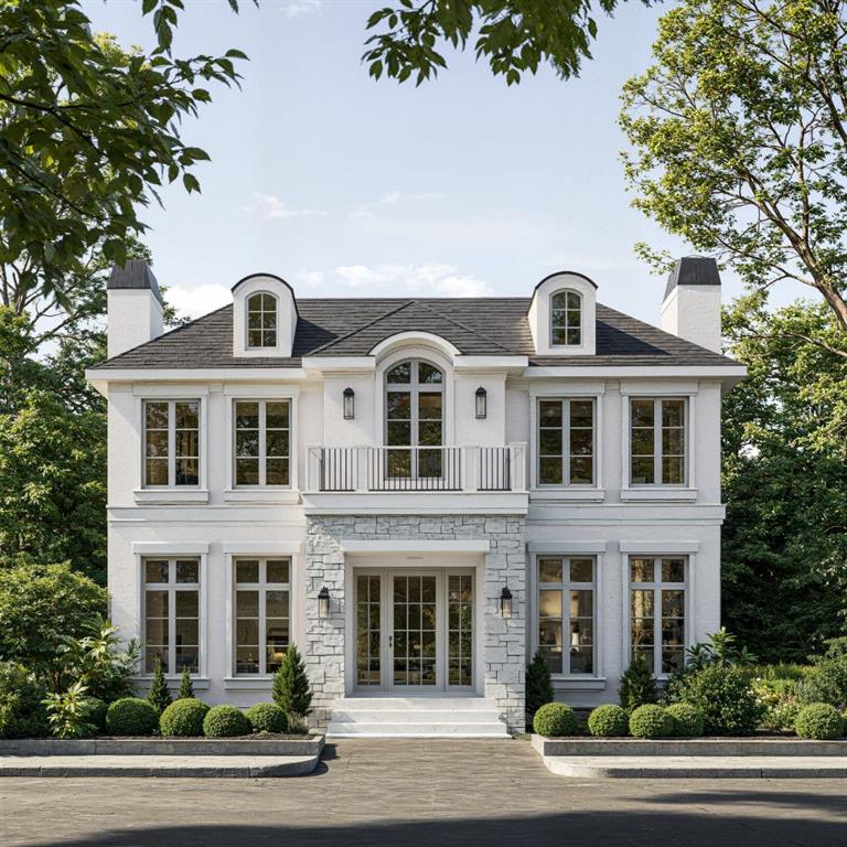 Nestled in the prestigious community of North Glenmore Park, this masterfully designed French Parisian–inspired residence by Bright Custom Homes offers over 5,100 sq ft of exquisitely finished living space across three levels. Set on a full-size lot, this 5 bedroom, 5 bathroom estate blends classical charm with modern sophistication, curated in collaboration with Aly Velji Designs. The main level welcomes you with grand proportions, 10' ceilings, extensive millwork, and herringbone patterned hardwood flooring. The chef’s kitchen features a curved Venetian plaster hood, Sub-Zero and Wolf appliances, custom cabinetry, natural quartzite, and intricate crown detailing. A fully equipped large butler’s pantry with vertical storage, and integrated prep space connects directly to the formal dining room adorned in custom wall panel moulding and natural light, ideal for hosting. The open concept living room offers coffered ceilings, a gas fireplace, and built-ins, while the adjacent dining nook opens to both a covered rear deck and an open air deck for year round entertaining. A beautifully appointed mudroom features Saltillo tile with black inserts, full-height custom cabinetry, a floating shelf, and a built-in bench. Near the foyer, a front facing office provides a quiet workspace with custom panel moulding, warm white millwork, and matching herringbone hardwood, the entire office in colour-drenching moment enclosed by glass paneled French doors. Heading upstairs from the curved staircase with curved drywall. Upstairs, the high tray ceiling primary suite includes a walk-in closet with reeded millwork and a luxurious ensuite with natural quartzite, double vanity, makeup desk, heated floors, and a curved steam shower. Three secondary bedrooms, two sharing a Jack & Jill bath and one with its own ensuite, are finished with elevated tile selections, polished chrome Delta hardware, and designer wall treatments. The upper level also includes a generous laundry room with built-ins and quartz surfaces, linen storage, and access to a private balcony. The fully developed basement features in-floor radiant heating, a spacious rec room, white oak bar with island, gym area, and a rough-in for a golf simulator ready for a full swing enclosure and projection system. A fifth bedroom and full bathroom complete the lower level. The home includes A/C, in-floor heat, dual hot water tanks (including one for radiant heating), smart thermostats, and full mechanical rough-ins for automation, security, speakers, and motorized blinds. Exterior highlights include triple-pane windows, acrylic stucco with stone veneer, and a fully insulated garage with drywall and EV charging rough-in. With its refined layout, elevated craftsmanship, and architectural character, this residence is a rare opportunity in one of Calgary’s most sought-after inner-city neighborhoods. Buyer’s will have the opportunity to work with the interior designer and make changes to the selections. Call today to book your private tour!