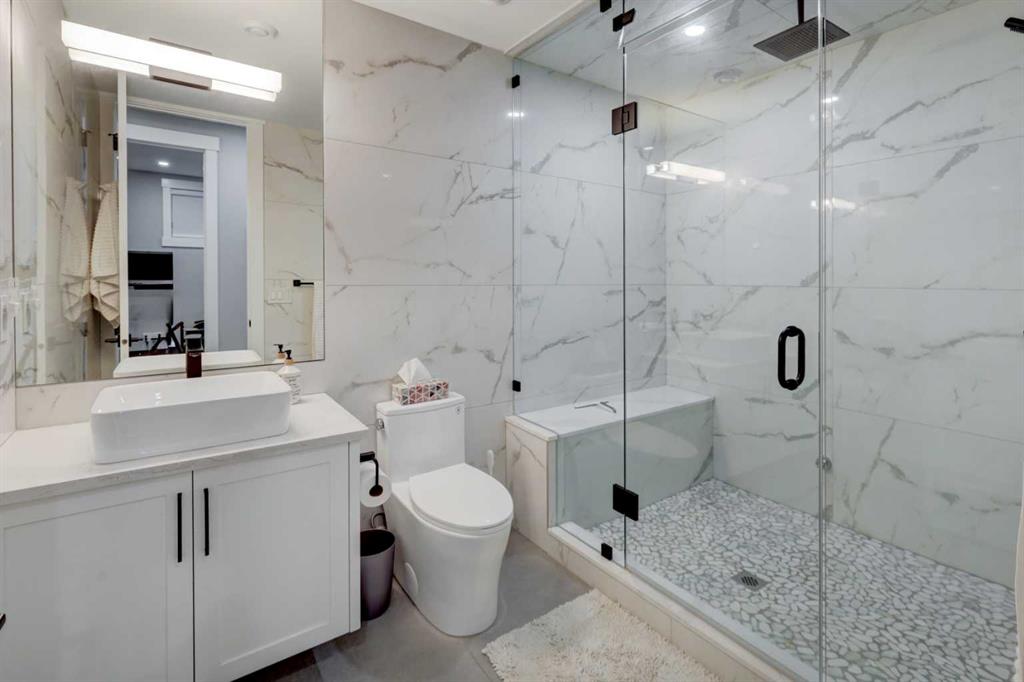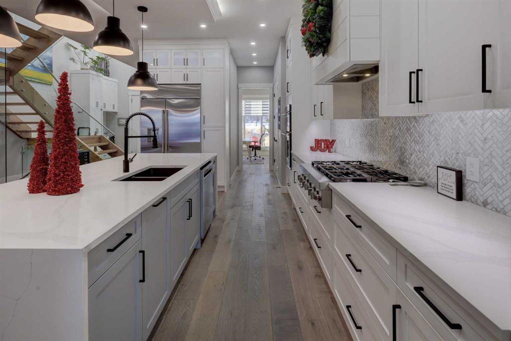 OPEN HOUSE JAN 17/18 130-430PM with NEW PRICING in effect! Stunning custom-built executive home with over 3500 Square feet of developed living space including FOUR bedrooms, FOUR full baths, a professionally developed basement, and heated TRIPLE-car garage, ideally located across from a park in Killarney. Stylish exterior with custom stone accents, gemstone lighting and inviting front patio. Open-concept design with neutral tones, 9’ & 10’ ceilings, wide-plank hardwood flooring, custom mouldings, barn doors, and Hunter Douglas blinds throughout. Chef-inspired kitchen with huge pantry features a six-burner gas range, professional stainless appliances, waterfall countertops, ample white cabinetry, and designer lighting. Spacious living room with gas fireplace and tray ceiling opens to a large deck, saltwater hot tub, and fully fenced yard. Show-stopping foyer with custom locker storage and open-riser staircase with glass railings, plus main-floor powder room and mudroom. Primary retreat offers vaulted ceilings, luxurious 5-piece ensuite with heated floors, floating double vanity, soaker tub, walk-in closet, and private outdoor seating area. Two additional upper bedrooms each include ensuite baths, plus upper-floor laundry. Entertainer’s basement features wet bar, fourth bedroom, fourth bath with heated floors throughout, wine cellar, gym, and ample storage. Other features include reverse osmosis water filtration, water softener, radon mitigation and Professionally landscaped low-maintenance yard with irrigation & artificial turf. This is the perfect family home in a great location just minutes to downtown, close to shops and all amenities including schools & parks.