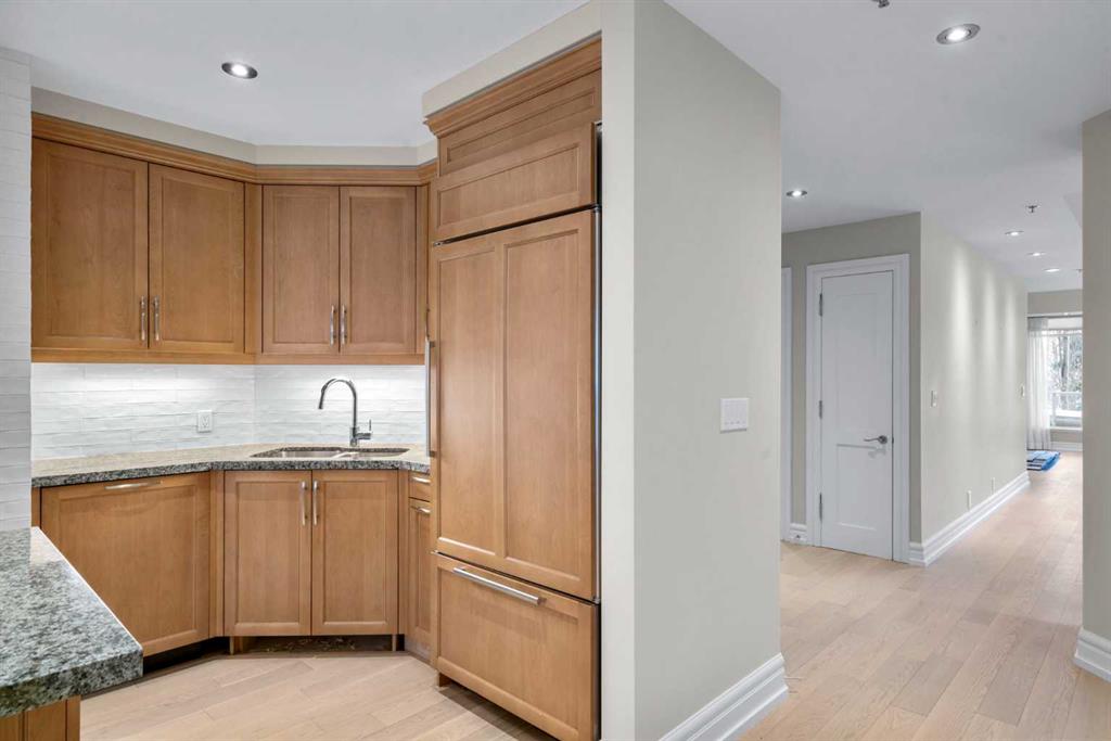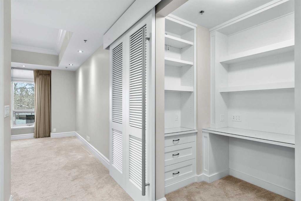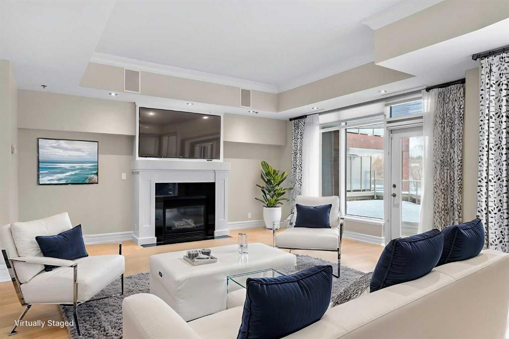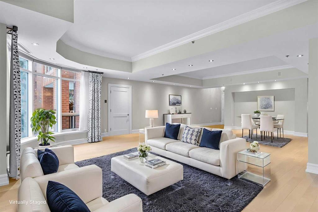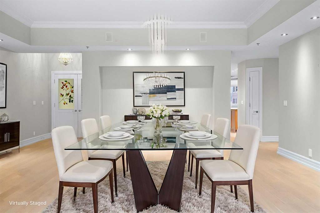 For those who value excellence, this distinctive executive residence in the Princeton Grand, a name synonymous with exclusivity, privacy, and luxury, is set amidst the most desirable residential enclave in Eau Claire. Your lifestyle will appreciate the opulent convenience of a private in-suite elevator coupled with exceptional amenities including 24 hour dedicated concierge, temperature controlled wine room with private storage lockers & tasting room, events area with full kitchen, TV’s and terrace, 2 private guest suites, a fully equipped fitness centre, yoga centre, steam room, dry sauna, showers, change room with lockers, full kitchen & bathroom, full service U/G car wash bay, bicycle storage, and a separate freight elevator. The beautifully manicured grounds create a private park-like setting, nestled along the south bank of the Bow River next to beautiful Prince's Island Park and incredible Pathway System! Walking distance to office towers, shopping, entertainment, restaurants, +15 skywalk system, transportation and the LRT, Peace Bridge, Kensington Shops and Calgary's vibrant City Center. Presenting a rare offering of 2892 sq.ft. of harmoniously appointed living space displaying the highest level of craftsmanship and luxurious interior tailoring, with pride of ownership complimenting the timeless prairie palette that flows seamlessly throughout the integrated floor plan that embraces the stunning backdrop of the Bow River. This exceptional luxury residence features a private elevator for the ultimate in convenience which opens to your stylish and spacious foyer, and then presents an exceptionally open entertaining floor plan, large floor to ceiling windows that provide exceptional natural light, with the open concept living/dining areas overlooking the private treed views to the Bow River. The master quarters overlooks the river and offers a large walk-in closet, relaxing, sensual 5 piece spa inspired ensuite with heated floors, a convenient office area and direct access to the expansive north terrace overlooking the Bow River and Prince's Island. The very private second bedroom is totally secluded from the living areas. The bright professional-grade gourmet kitchen was designed as the epicenter of the space with direct access to the south terrace, coupled with the north terrace can accommodate gatherings of all sizes. This peaceful and park-like setting offers two spectacular and spacious outdoor living spaces, a stunning 680 sq ft covered deck overlooking the mature trees and Bow River to the north, and a second sunny south facing covered balcony off the kitchen & family room, great for year round BBQs. An exceptional floor plan that's perfect for entertaining. Home includes built-in speaker system, vacuum system, a wine fridge, 1 gas fireplace, high ceilings, large bright windows, 2 titled parking stalls and titled storage locker. Enjoy your refined lifestyle against a backdrop of luxury services, finishes and accoutrements in the Princeton Grand.