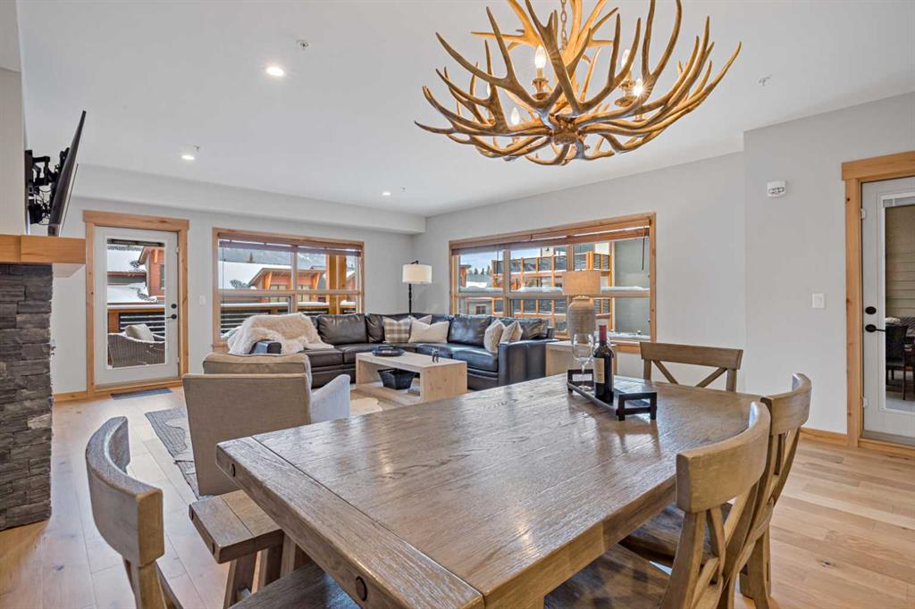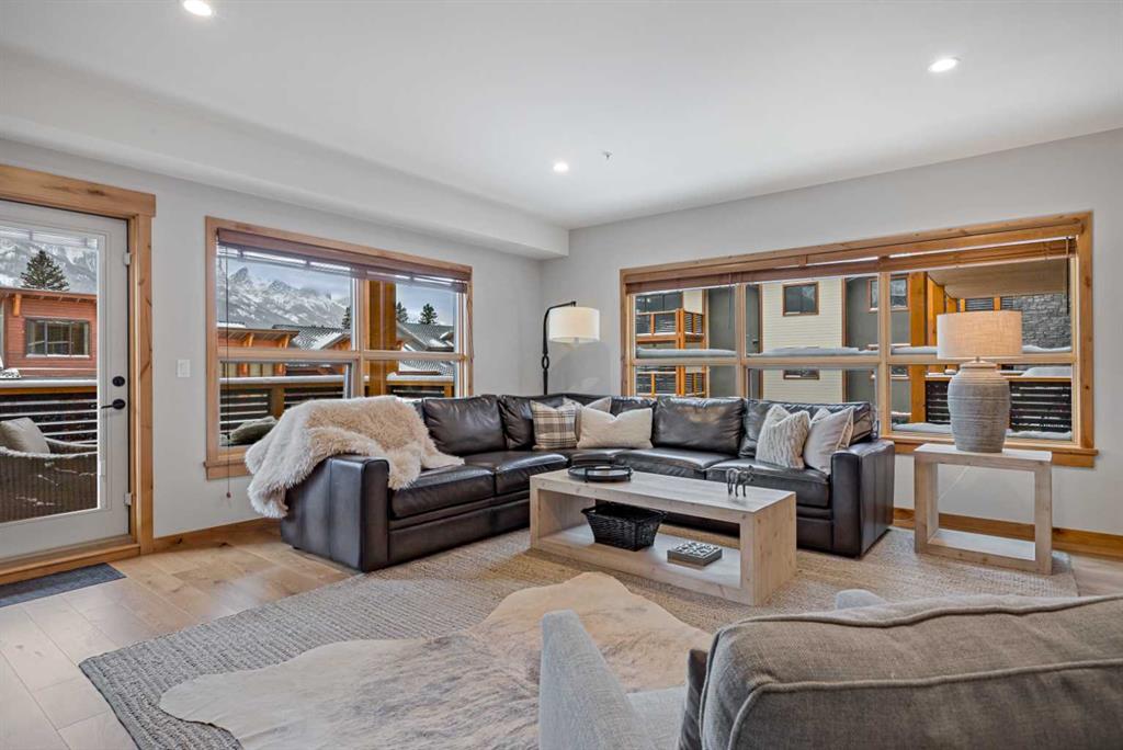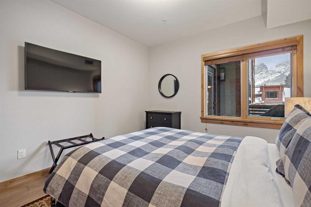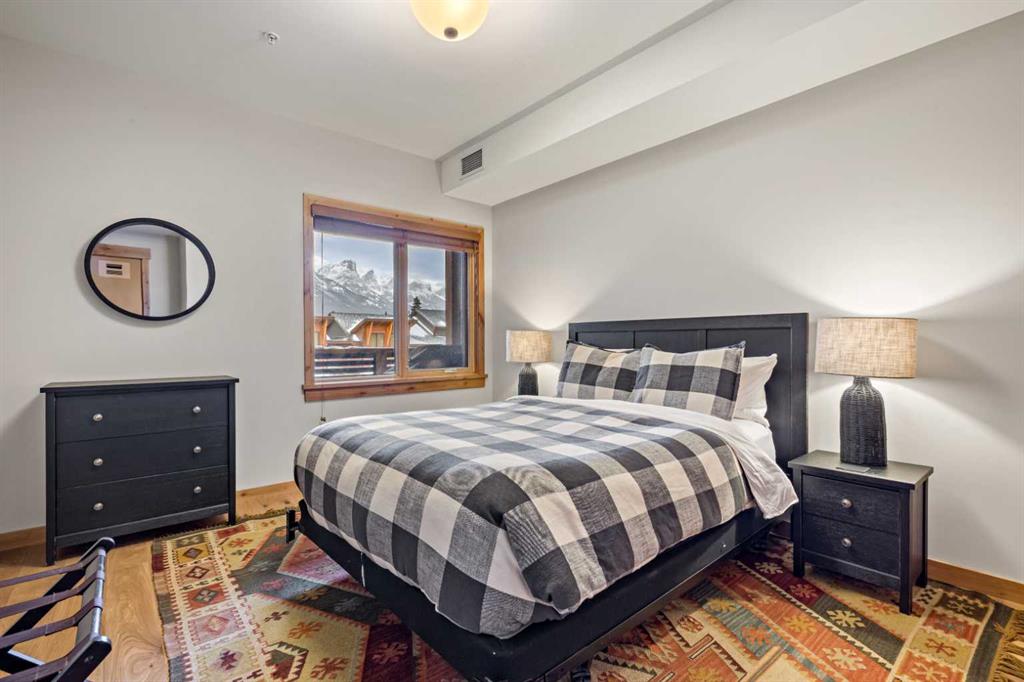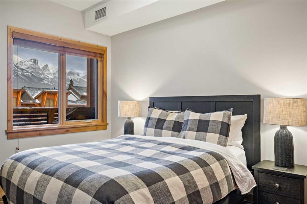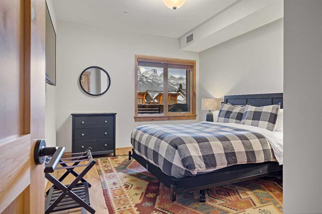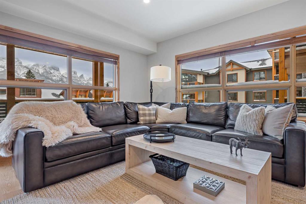 Immaculate and rare 2-bedroom plus den (functions as 3rd bedroom) luxury condominium in White Spruce Lodge in the heart of Spring Creek. This property carries the "tourist home" designation permitting short-term vacation rentals. Sold fully furnished and turn-key for immediate rentals, with many reservations already on the books for 2026! Owners and rental gusts will enjoy the open concept living with spacious living areas ideal for families or gatherings with a large gourmet kitchen complete with stainless appliances, quartz counters and plenty of cabinet space, a large dining area and living room, perfect for entertaining. Enjoy outdoor living with 2 large covered decks, facing SW/W with great views of Ha Ling Peak and the entire Rundle Range. The den has two full size built in bunk beds, perfect for the kids! The large primary bedroom features king, a walk-in closet and 5 piece ensuite. White Spruce Lodge has an inviting courtyard hot tub with fantastic views and an exercise room on the main level. White Spruce Lodge is located adjacent to the Plaza in Spring Creek with shops, Bridgette Bar restaurant and is just a short stroll to Main Street Canmore along the lovely creek paths to downtown.