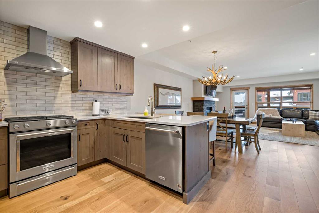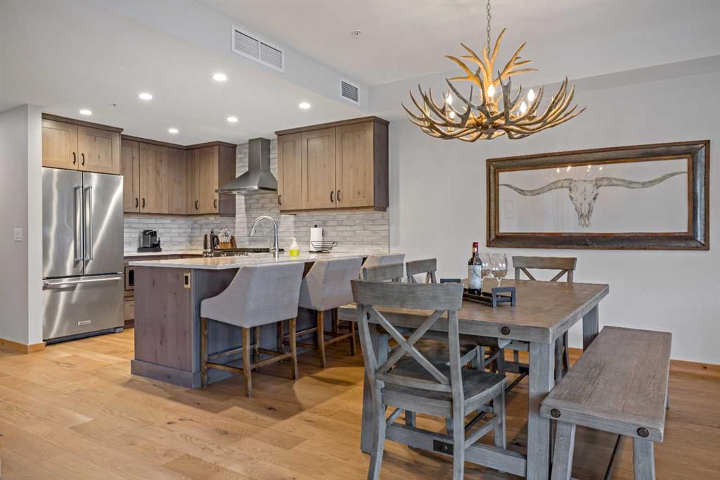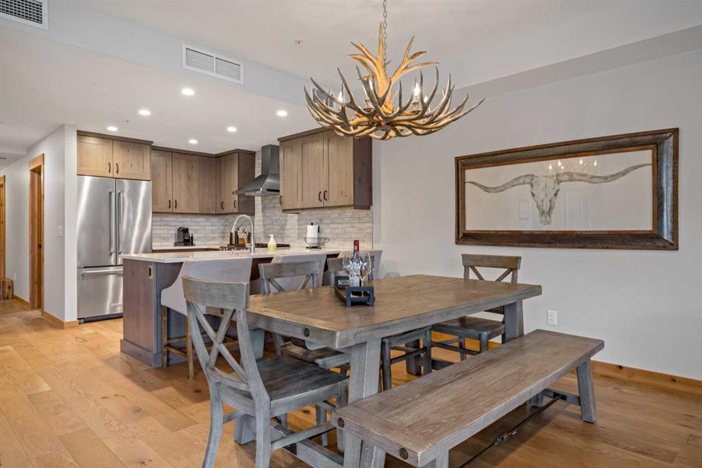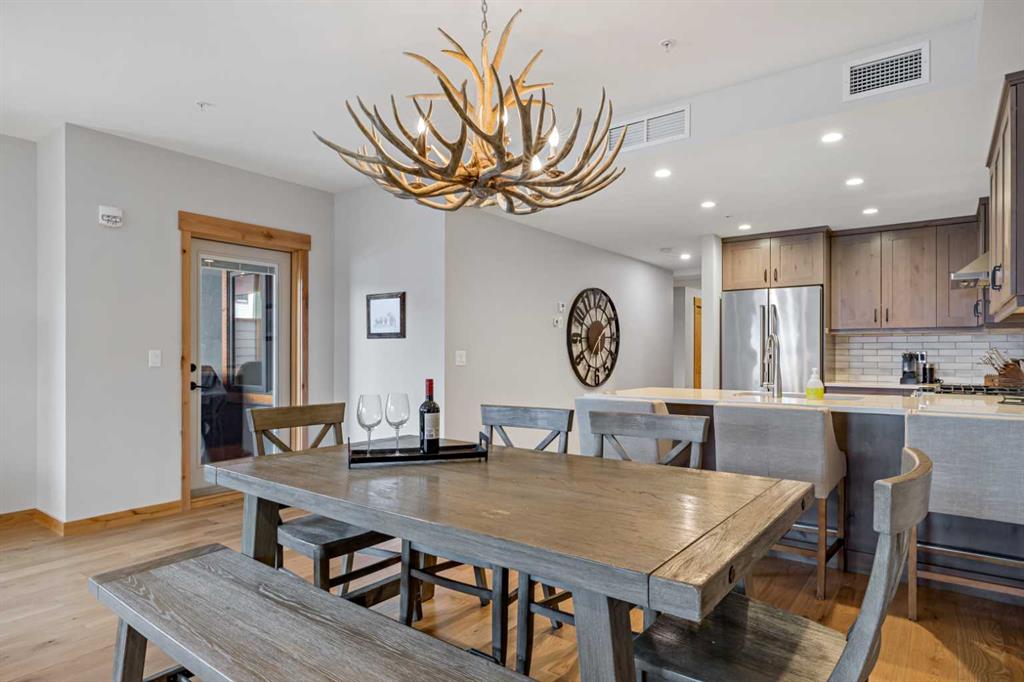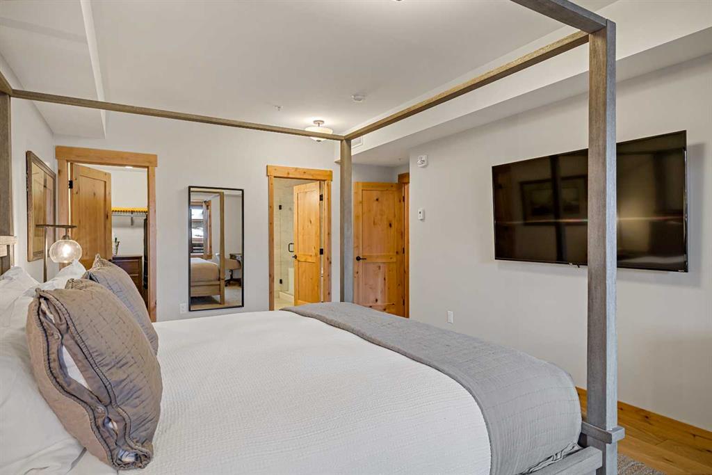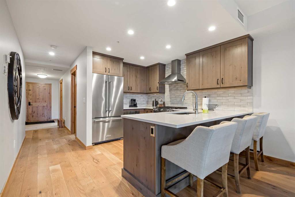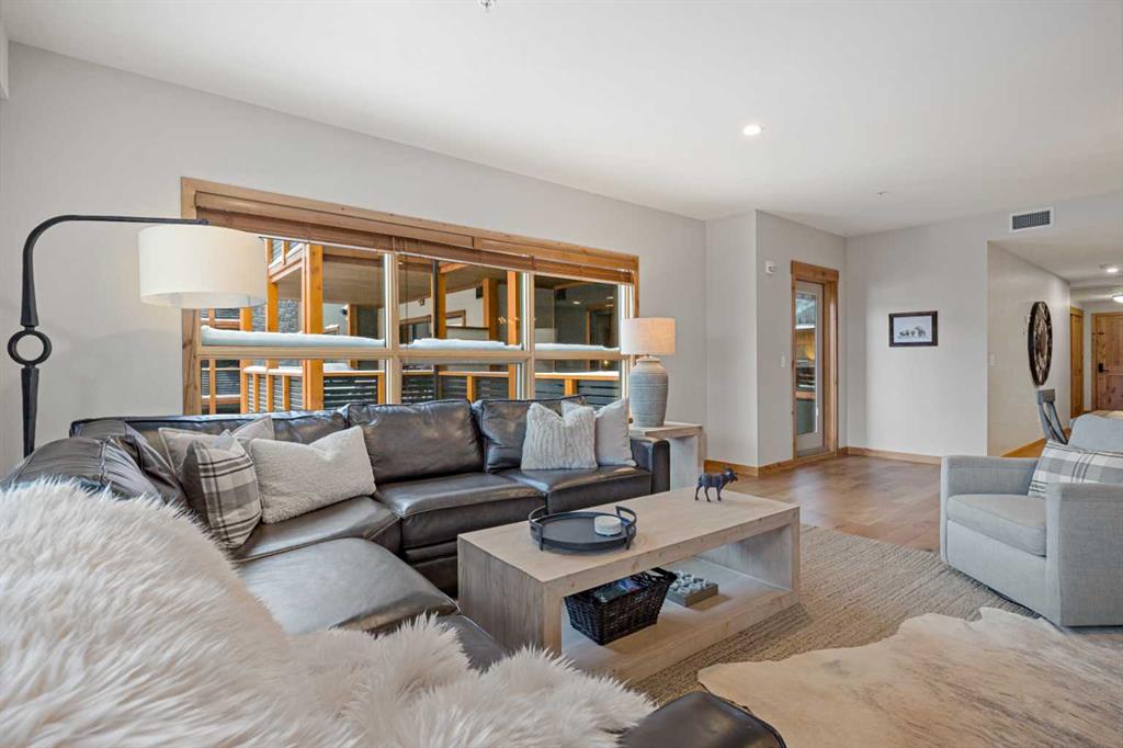 Immaculate and rare 2-bedroom plus den (functions as 3rd bedroom) luxury condominium in White Spruce Lodge in the heart of Spring Creek. This property carries the "tourist home" designation permitting short-term vacation rentals. Sold fully furnished and turn-key for immediate rentals, with many reservations already on the books for 2026! Owners and rental gusts will enjoy the open concept living with spacious living areas ideal for families or gatherings with a large gourmet kitchen complete with stainless appliances, quartz counters and plenty of cabinet space, a large dining area and living room, perfect for entertaining. Enjoy outdoor living with 2 large covered decks, facing SW/W with great views of Ha Ling Peak and the entire Rundle Range. The den has two full size built in bunk beds, perfect for the kids! The large primary bedroom features king, a walk-in closet and 5 piece ensuite. White Spruce Lodge has an inviting courtyard hot tub with fantastic views and an exercise room on the main level. White Spruce Lodge is located adjacent to the Plaza in Spring Creek with shops, Bridgette Bar restaurant and is just a short stroll to Main Street Canmore along the lovely creek paths to downtown.
