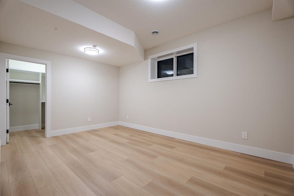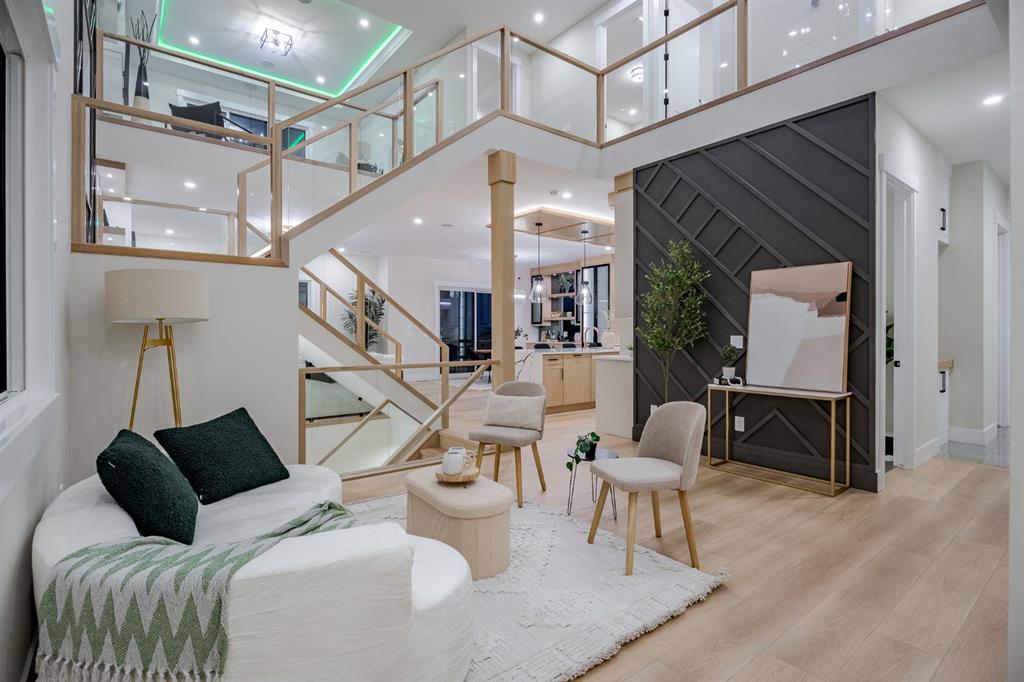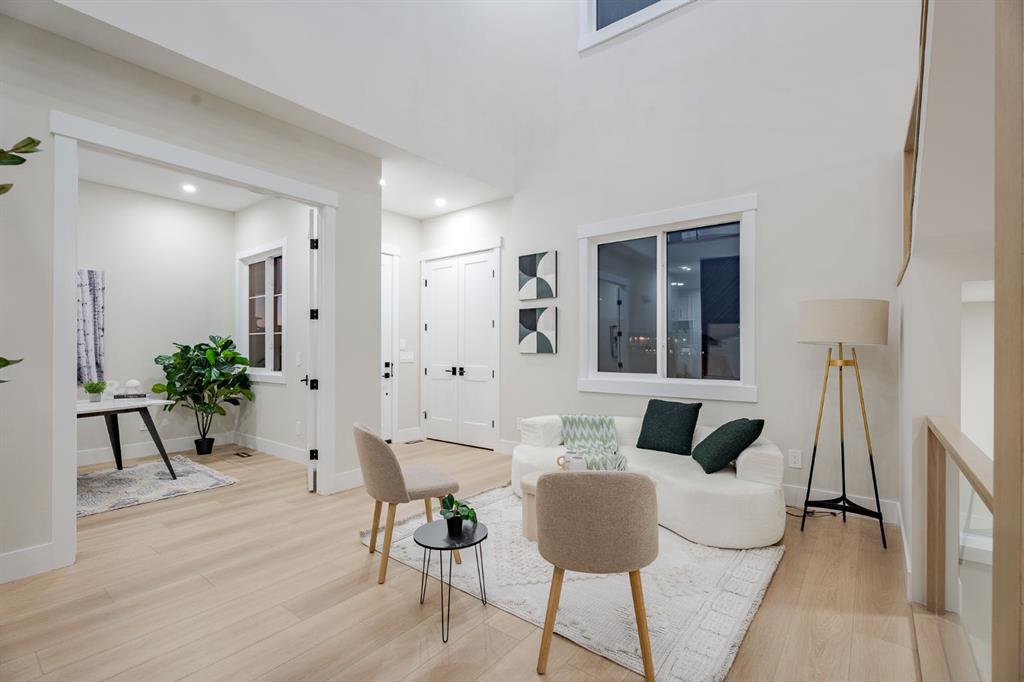 The main floor features 10’ ceilings, a dramatic open-to-above living area, family room, dining space, and a full 3-piece bathroom. A versatile flex room can serve as a bedroom, office, or additional sitting area. The kitchen includes upgraded appliances and is complemented by a walk-through spice kitchen with direct access to the mudroom and triple attached garage.