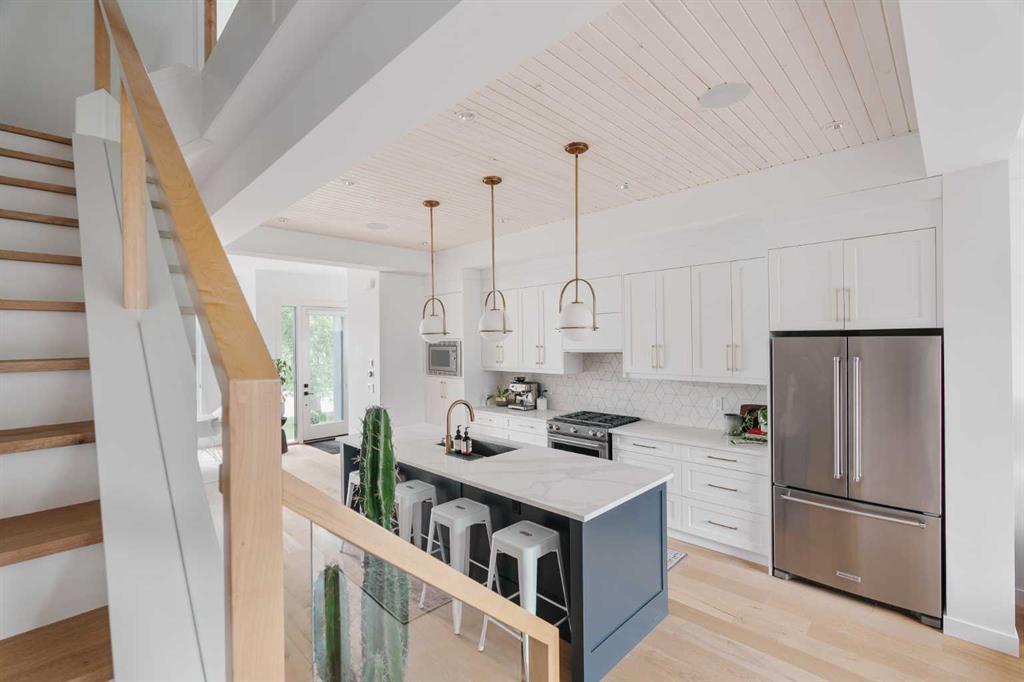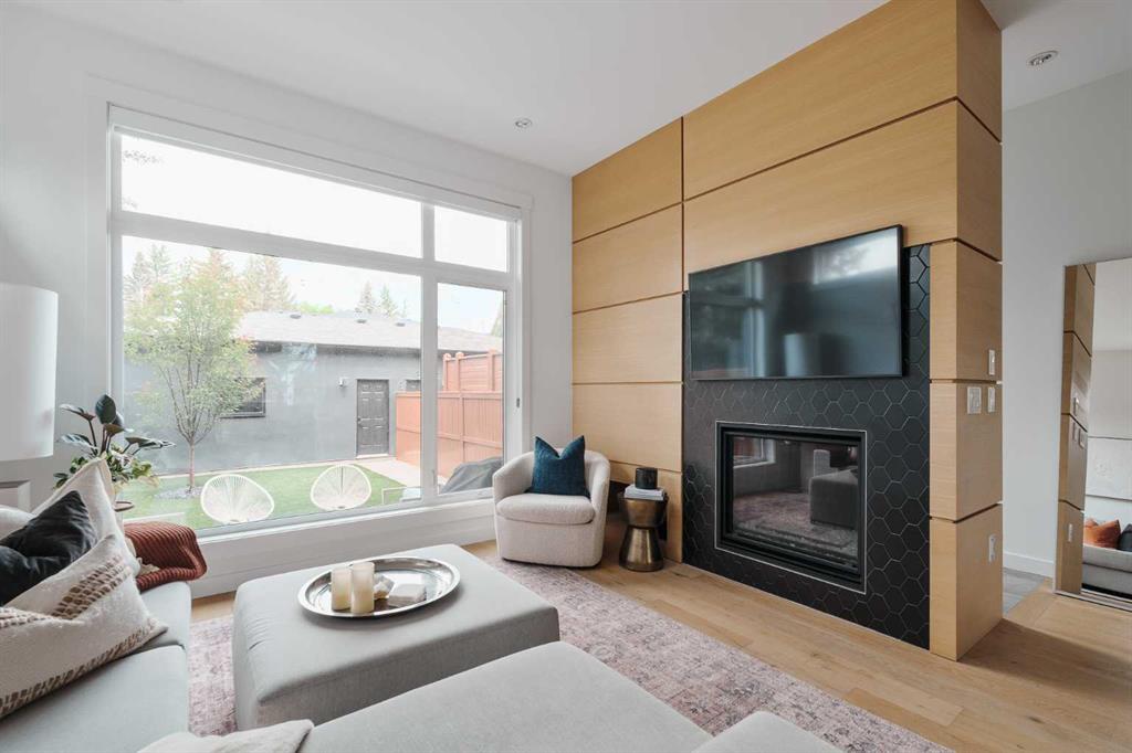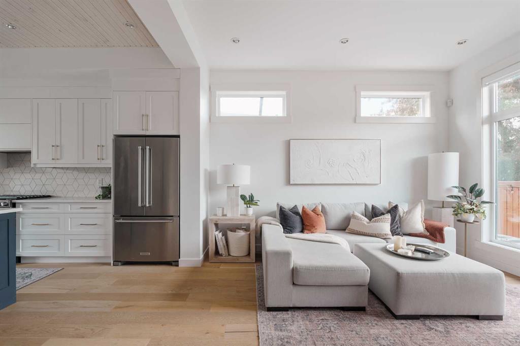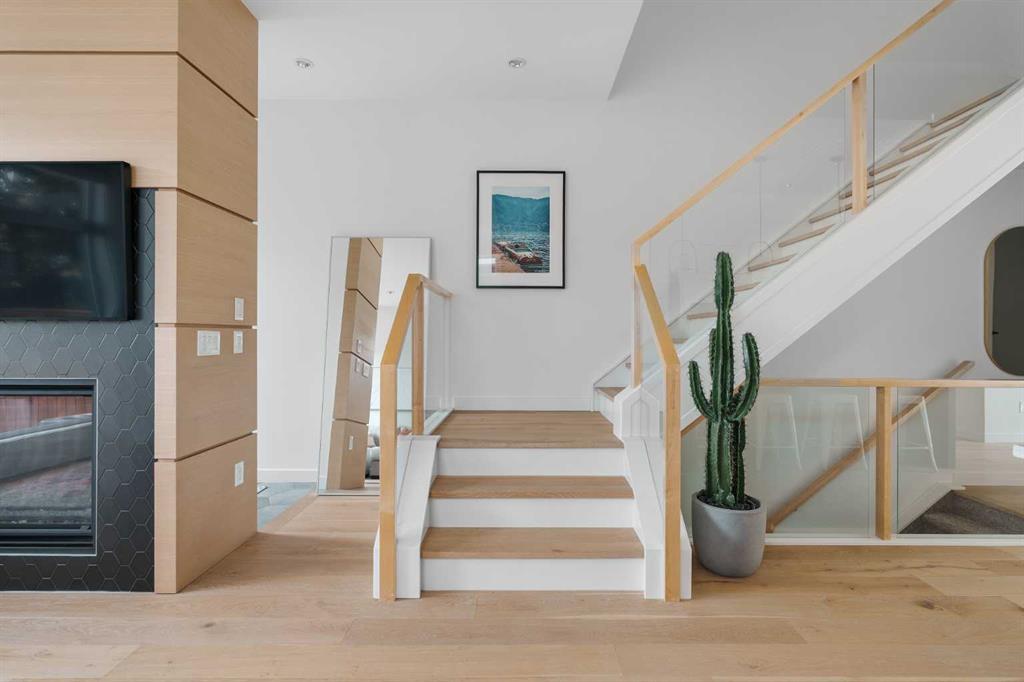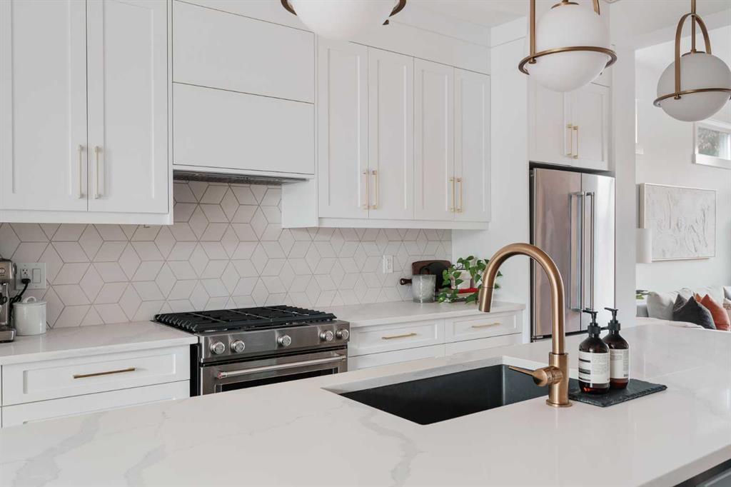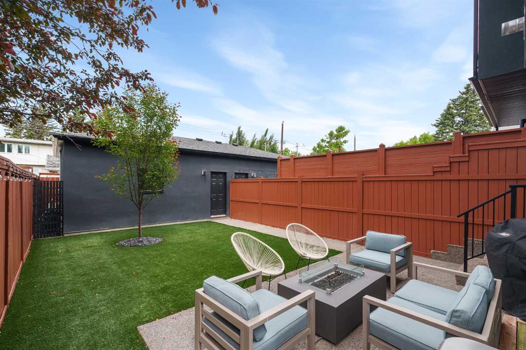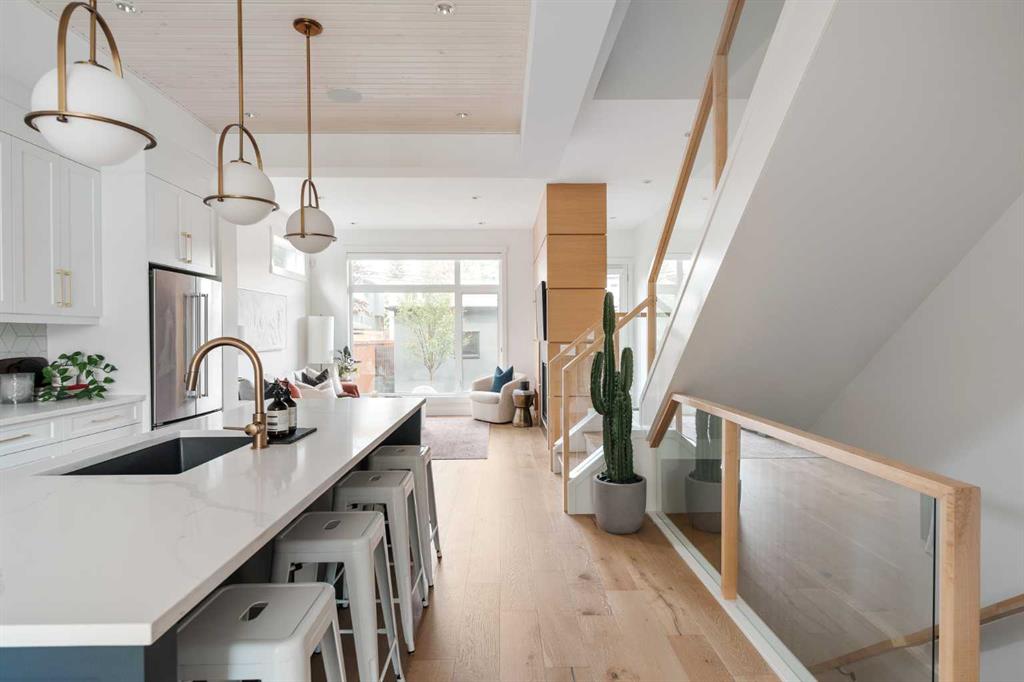 From the moment you step inside, this beautifully appointed and impeccably finished semi-detached home offers an elevated sense of style, comfort, and understated luxury, with beautiful natural light that pours through the open-concept main floor and Hunter Douglas blinds throughout. Just off the front entry is the formal dining room, offering a refined space for hosting and everyday gathering alike. From there, the main floor unfolds into a stunning central kitchen, thoughtfully designed to balance beauty and practicality. Crisp white cabinetry is paired with quartz countertops, striking geometric backsplash, and stainless-steel appliances including a gas range, while the large centre island with seating creates an inviting focal point for casual dining, conversation, and culinary creativity. An upgraded wood plank ceiling detail adds architectural interest, and pendant lighting paired with recessed lighting brings a polished, elevated finish to the space. At the rear of the home, the living room feels both inviting and sophisticated, centred around a gas fireplace and panelled feature wall, with views extending into the backyard. Near the back entry, a built-in bench with hooks creates a stylish everyday drop zone. An elegant staircase with glass and wood railings draws the eye upward, and as you ascend, you’ll discover a full bath, and three bedrooms with hardwood flooring throughout. The primary suite is a true retreat, beautifully appointed with a vaulted ceiling, a spacious walk-in closet with custom organizers, and a beautifully curated ensuite hidden behind a barn door. Finished with patterned tile floors, a freestanding soaker tub, a glass-enclosed walk-in shower, and a skylight, the space feels both serene and beautifully elevated. Hunter Douglas blinds continue on this level, including blackout blinds, add comfort and quality throughout the upper level. The fully developed basement offers exceptional additional living space, anchored by a spacious rec room with upgraded built-ins and a beautifully enhanced wet bar area, perfectly suited to entertaining or unwinding at the end of the day. A fourth bedroom, a full bathroom, and ample storage complete this lower level with both style and practicality. Outside, the backyard has been thoughtfully upgraded with premium artificial turf, creating a polished, low-maintenance outdoor setting, while the insulated garage adds further convenience. Additional upgrades include central air conditioning, a new roof (2024), a new hot water tank (2025), repainted fence and front shingles, dimmers throughout, HRV, and roughed-in speakers. Tucked into the heart of North Glenmore Park, the home enjoys a wealth of nearby recreation and proximity to schools. Close to the Glenmore Athletic Park, Lakeview and Earl Grey Golf course, reservoir pathways and Weaselhead Flats.