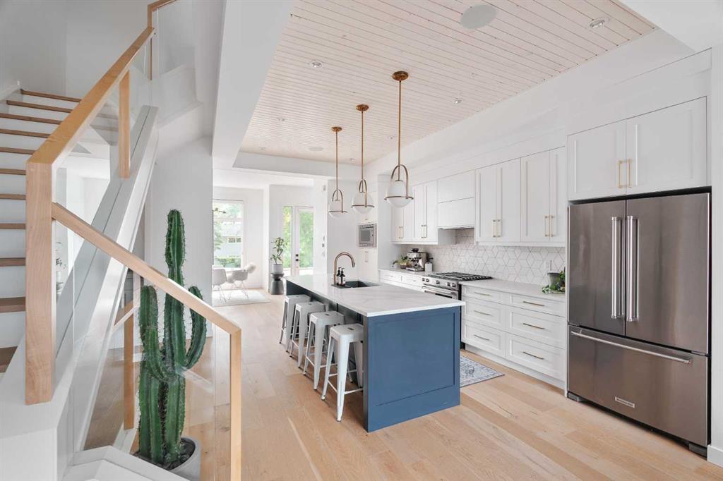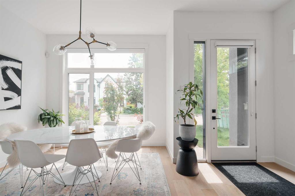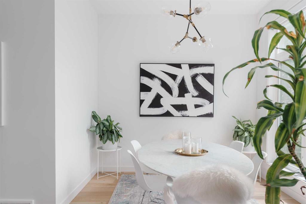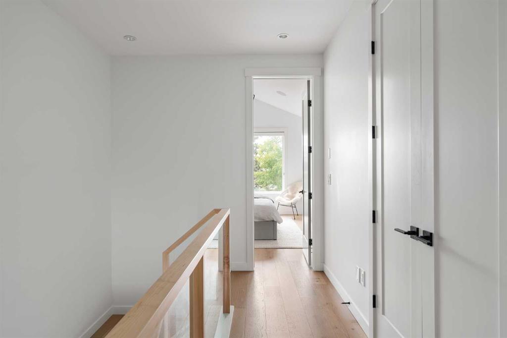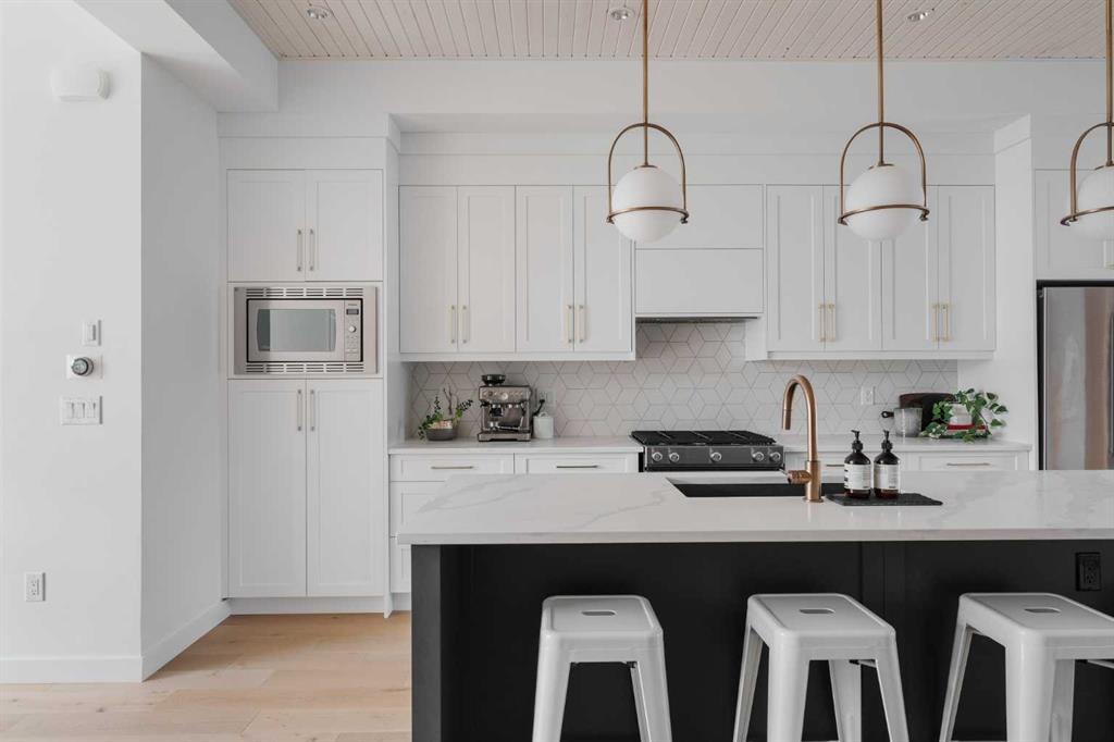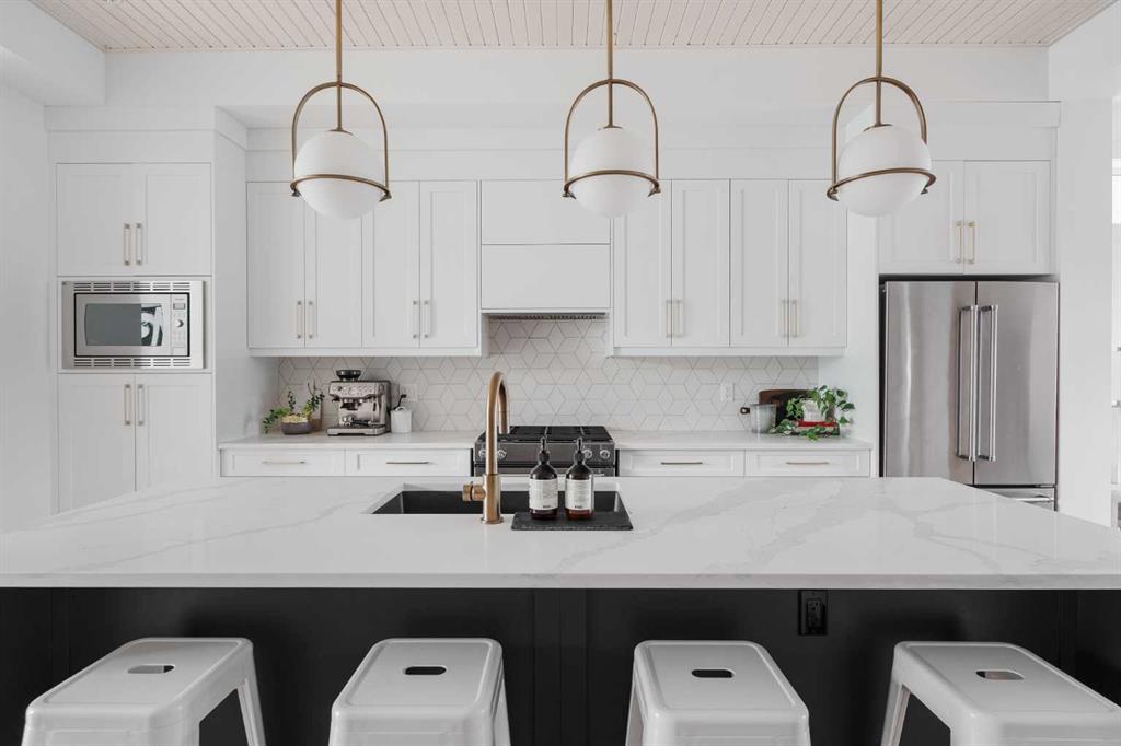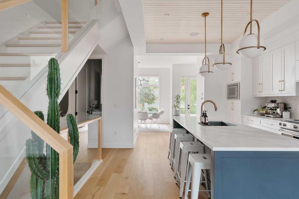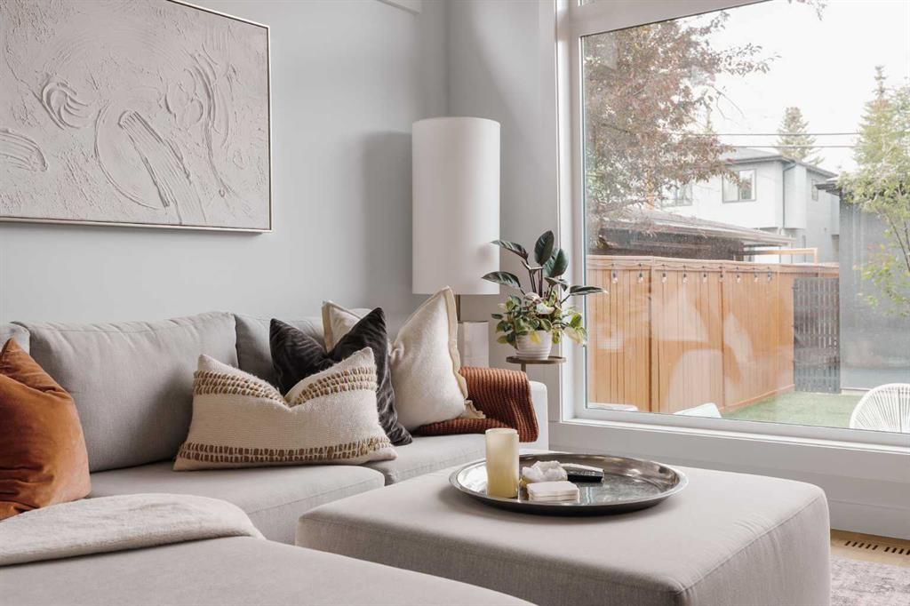 From the moment you step inside, this beautifully appointed and impeccably finished semi-detached home offers an elevated sense of style, comfort, and understated luxury, with beautiful natural light that pours through the open-concept main floor and Hunter Douglas blinds throughout. Just off the front entry is the formal dining room, offering a refined space for hosting and everyday gathering alike. From there, the main floor unfolds into a stunning central kitchen, thoughtfully designed to balance beauty and practicality. Crisp white cabinetry is paired with quartz countertops, striking geometric backsplash, and stainless-steel appliances including a gas range, while the large centre island with seating creates an inviting focal point for casual dining, conversation, and culinary creativity. An upgraded wood plank ceiling detail adds architectural interest, and pendant lighting paired with recessed lighting brings a polished, elevated finish to the space. At the rear of the home, the living room feels both inviting and sophisticated, centred around a gas fireplace and panelled feature wall, with views extending into the backyard. Near the back entry, a built-in bench with hooks creates a stylish everyday drop zone. An elegant staircase with glass and wood railings draws the eye upward, and as you ascend, you’ll discover a full bath, and three bedrooms with hardwood flooring throughout. The primary suite is a true retreat, beautifully appointed with a vaulted ceiling, a spacious walk-in closet with custom organizers, and a beautifully curated ensuite hidden behind a barn door. Finished with patterned tile floors, a freestanding soaker tub, a glass-enclosed walk-in shower, and a skylight, the space feels both serene and beautifully elevated. Hunter Douglas blinds continue on this level, including blackout blinds, add comfort and quality throughout the upper level. The fully developed basement offers exceptional additional living space, anchored by a spacious rec room with upgraded built-ins and a beautifully enhanced wet bar area, perfectly suited to entertaining or unwinding at the end of the day. A fourth bedroom, a full bathroom, and ample storage complete this lower level with both style and practicality. Outside, the backyard has been thoughtfully upgraded with premium artificial turf, creating a polished, low-maintenance outdoor setting, while the insulated garage adds further convenience. Additional upgrades include central air conditioning, a new roof (2024), a new hot water tank (2025), repainted fence and front shingles, dimmers throughout, HRV, and roughed-in speakers. Tucked into the heart of North Glenmore Park, the home enjoys a wealth of nearby recreation and proximity to schools. Close to the Glenmore Athletic Park, Lakeview and Earl Grey Golf course, reservoir pathways and Weaselhead Flats.