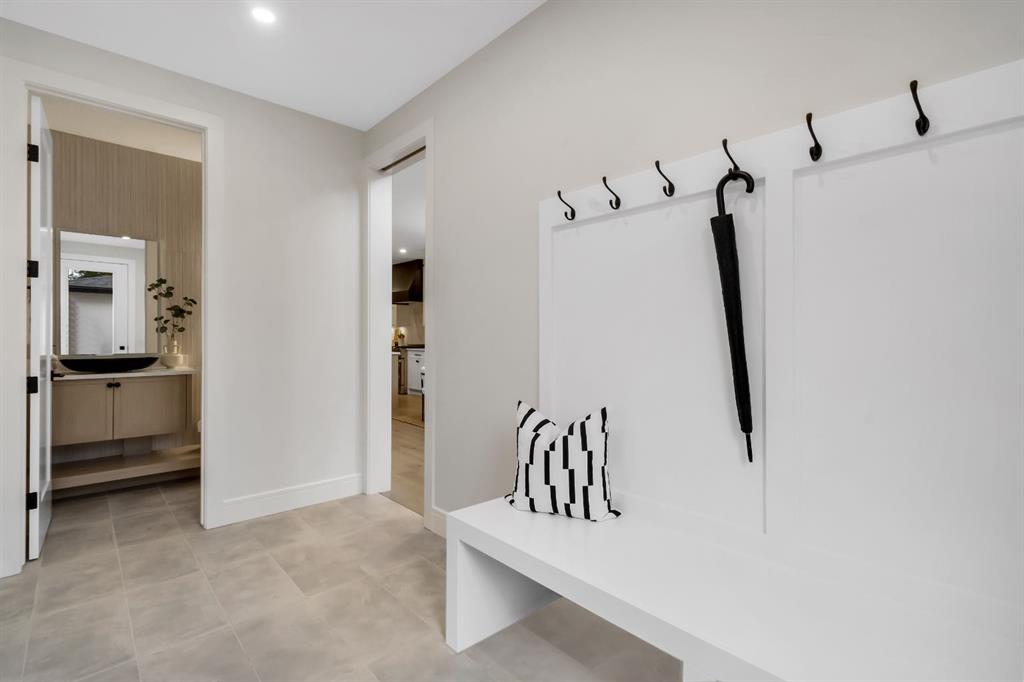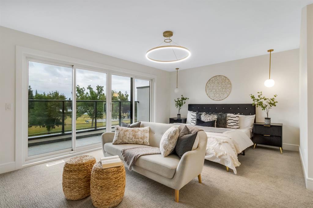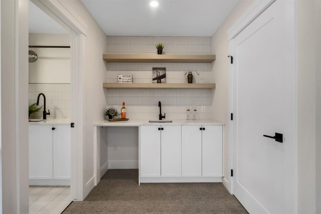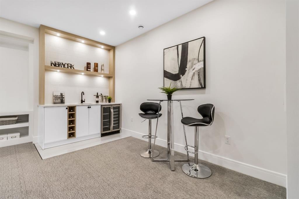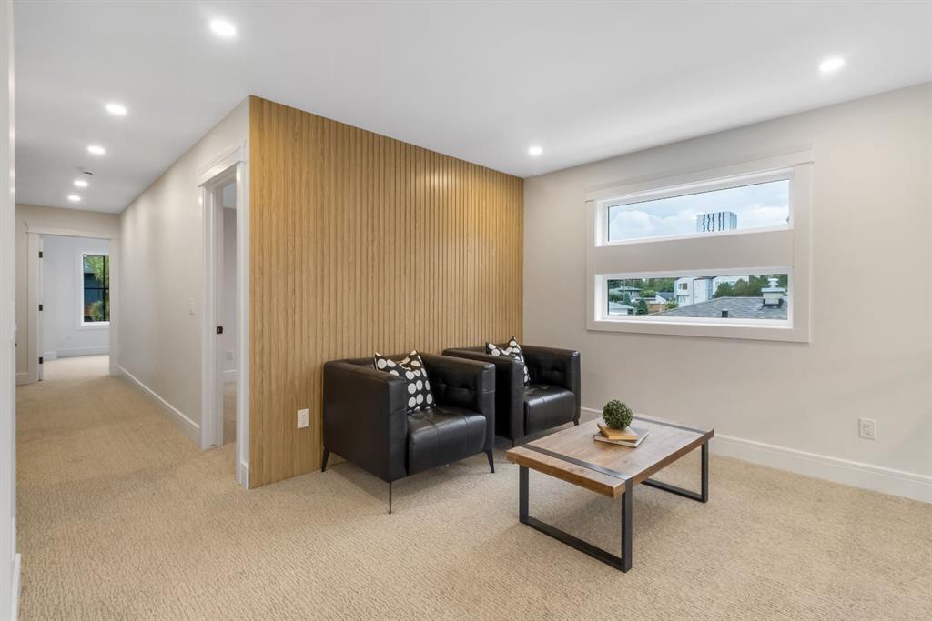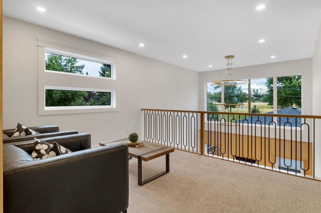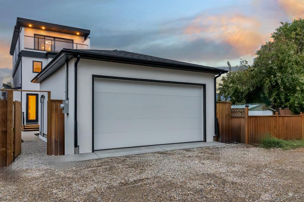 Welcome to this exceptional modern home nestled on a quiet, mature street in the heart of desirable Banff Trail, with a charming park right at your doorstep. Boasting over 3,800 square feet of thoughtfully designed living space across four levels—and serviced by a private elevator—this home seamlessly blends contemporary luxury with everyday comfort. Step into the elegant front den, where custom lighting and a statement feature wall offer a stylish first impression. The main level showcases wide-plank hardwood flooring and a soaring open-to-above layout that brings a dramatic sense of space to the living area. The gourmet kitchen is a true showstopper, equipped with premium appliances, including a 6-burner gas range, and framed by sleek finishes that will delight any culinary enthusiast. A chic powder room, complete with a standout vanity and playful designer lighting, adds personality, while the rear mudroom provides functional storage and access to the backyard. The second level is thoughtfully laid out with two large bedrooms, each featuring a built-in closet, and connected by a spacious Jack-and-Jill bathroom—perfect for family or guests. This floor also includes a cozy bonus room with a built-in bar and a large laundry area with everything you need for convenience. Ascend to the third floor to discover a private primary retreat spanning the entire level. This sanctuary features a generous bedroom, a coffee/wet bar, and a sunny balcony with peaceful views over the backyard and adjacent park. The custom walk-in closet is outfitted with high-end built-ins, and the spa-inspired ensuite is a true retreat, showcasing a dramatic black soaker tub, a double vanity, a stunning tile-clad steam shower, and floor-to-ceiling tile details. Downstairs, the fully finished basement continues to impress with a fourth bedroom, a stylish full bathroom with bold black tile accents, a dedicated home gym, and a spacious media room complete with a wet bar—ideal for movie nights or entertaining friends. Outside, the striking architectural is complemented by a welcoming front patio. With quick access to major routes, top schools, and nearby amenities, this home is a rare combination of style, functionality, and unbeatable location.