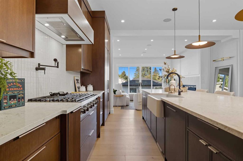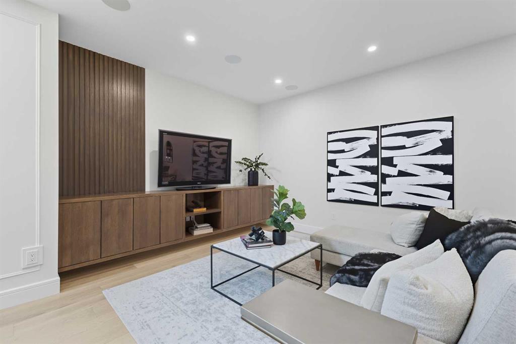 OPEN HOUSE SATURDAY, MARCH 7TH FROM 1-3!!!. Perched on coveted 29th Avenue with UNPARALLELED CITY, DOWNTOWN & MOUNTAIN VIEWS amongst multi-million dollar homes, this exquisite, brand new 3+1 bedroom home is situated on a 33’x125’ lot & exudes the epitome of luxury, offering over 4500 sq ft of developed living space. The open, airy main level presents engineered hardwood floors, lofty ceilings & chic light fixtures, showcasing a grand foyer with floor to ceiling Rift cut oak cabinets & textured feature wall that leads to a kitchen that’s impeccably finished with chamomile butter quartz counter tops, large island/eating bar, fluted cabinets with spice drawers, corrugated tile backsplash, convenient pot filler & stainless steel appliance package. A walk-in butler pantry with extra utility sink & extra storage that’s perfect for storing small appliances is an added convenience. The spacious dining area with built-in hutch & 2 paneled beverage fridges, provides ample space to host family & friends. The living room is anchored by a feature fireplace & wainscoted feature wall. Completing the main level, is a handy mudroom with hexagon tile floors, built-in cabinets & hooks plus a 2 piece powder room. An elegant open riser staircase with glass inserts leads to the second level that hosts 3 bedrooms, a 5 piece main bath & laundry room with sink, lots of storage & hanging racks. The primary retreat is a true private oasis, featuring a sitting area with cozy double sided fireplace, to-die-for walk-in closet with laundry room access & zen-like 6 piece ensuite with heated floors, large vanity with dual sinks, relaxing freestanding soaker tub & rejuvenating steam shower. A third level loft with magnificent feature wall, wet bar & access to north & south decks with UNMATCHED MOUNTAIN VIEWS plus CITY & DOWNTOWN VISTAS is the ideal space for entertaining. A den/study area & 2 piece powder room are the finishing touches to the third level. Basement development includes a large family/media room with wet bar & charming wine room – perfect for game or movie night. A dedicated home gym with glass doors, epoxy flooring, mirrored wall & electrical for a TV delivers the perfect setting early morning workouts. The fourth bedroom with walk-in closet & large spa-like 3 piece bath with steam shower complete the basement. Other notable features include built-in speakers on each level, wainscoting detail throughout plus roughed in A/C. Outside, enjoy aggregate walk-ways & private back yard with patio & access to the double detached garage with rough in for heat.. This outstanding inner city home is located close to trendy Marda Loop, excellent schools, shopping, public transit & has easy access to 33rd & 26th Avenues & Crowchild Trail.