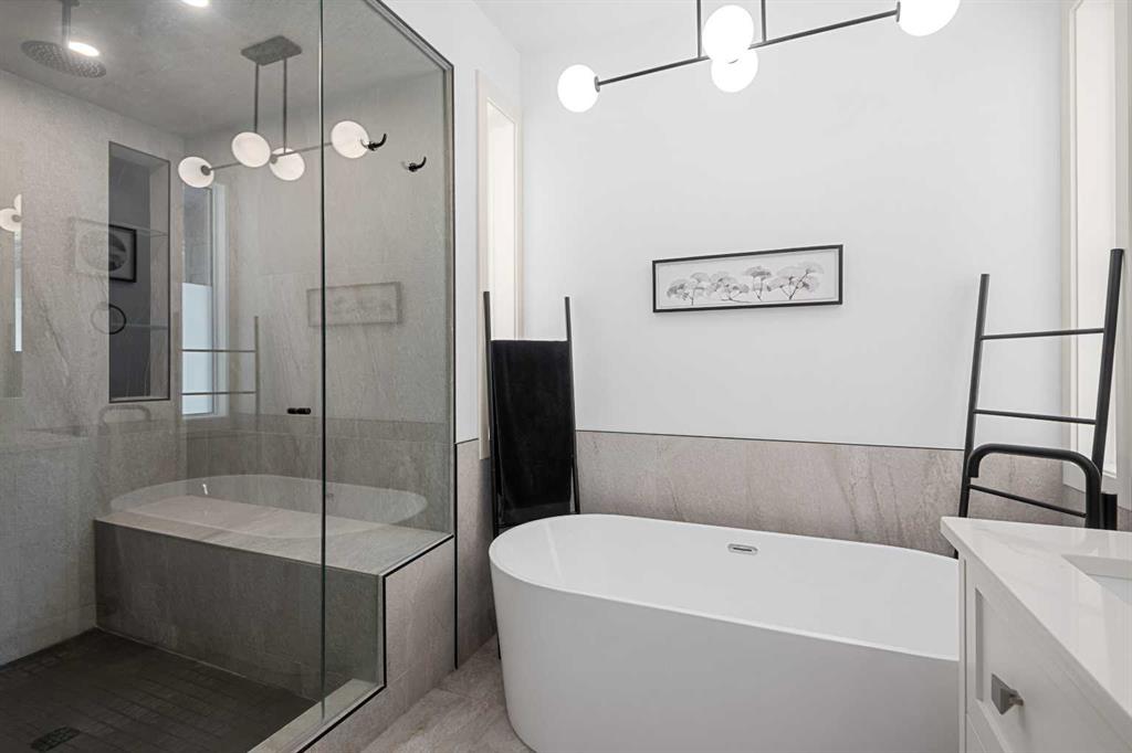 Upstairs, the primary suite serves as a private retreat with vaulted ceilings, a walk-in California Closet, and a luxurious 5-piece ensuite with a freestanding tub, built-in bench, and steam shower rough-in. Two additional bedrooms, a 4-piece bath, a laundry room, and linen storage complete the upper floor.