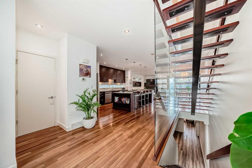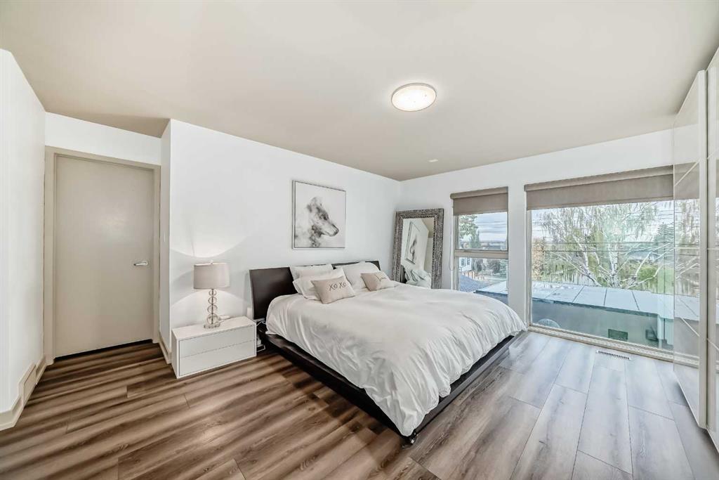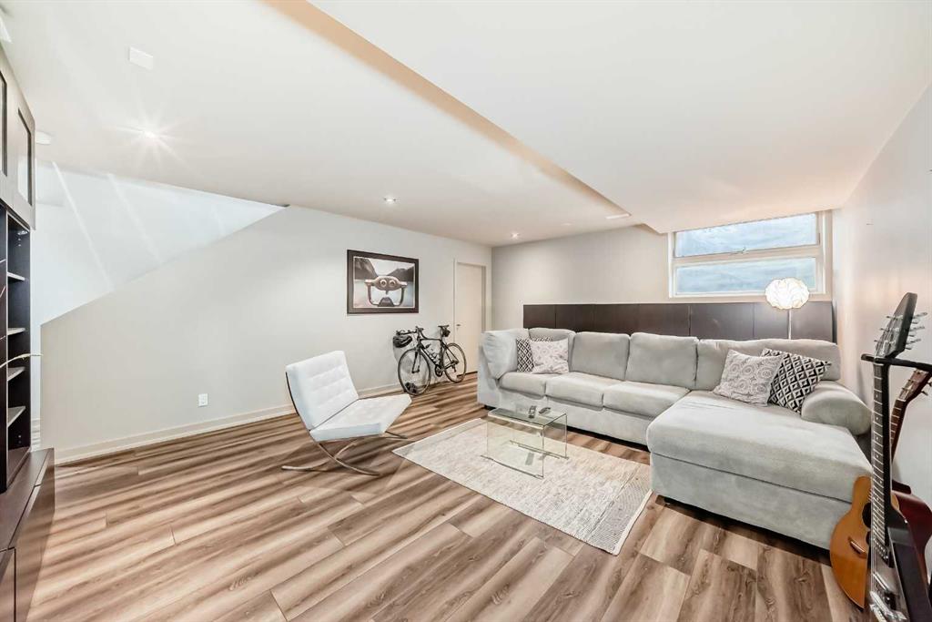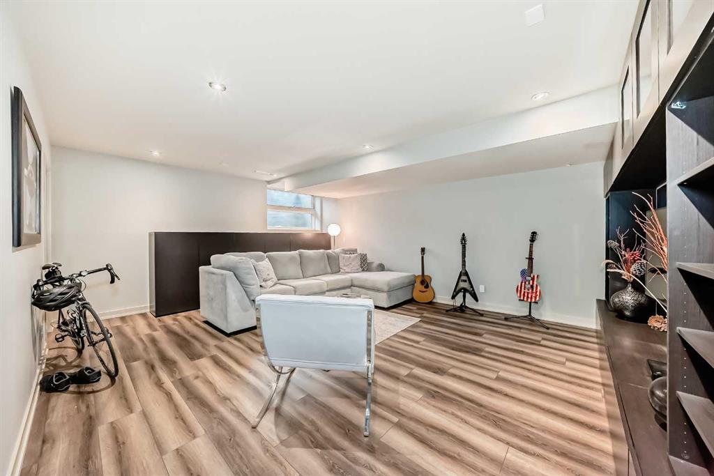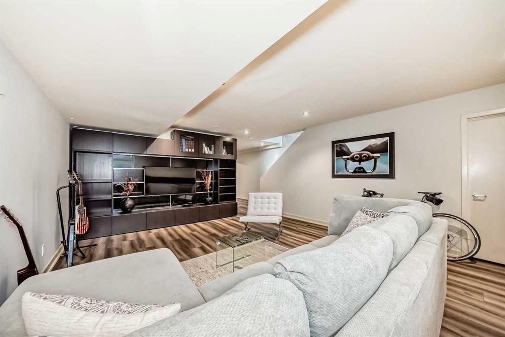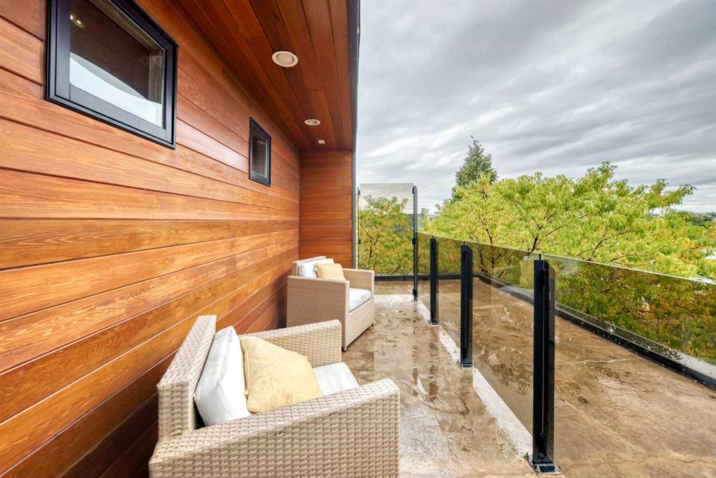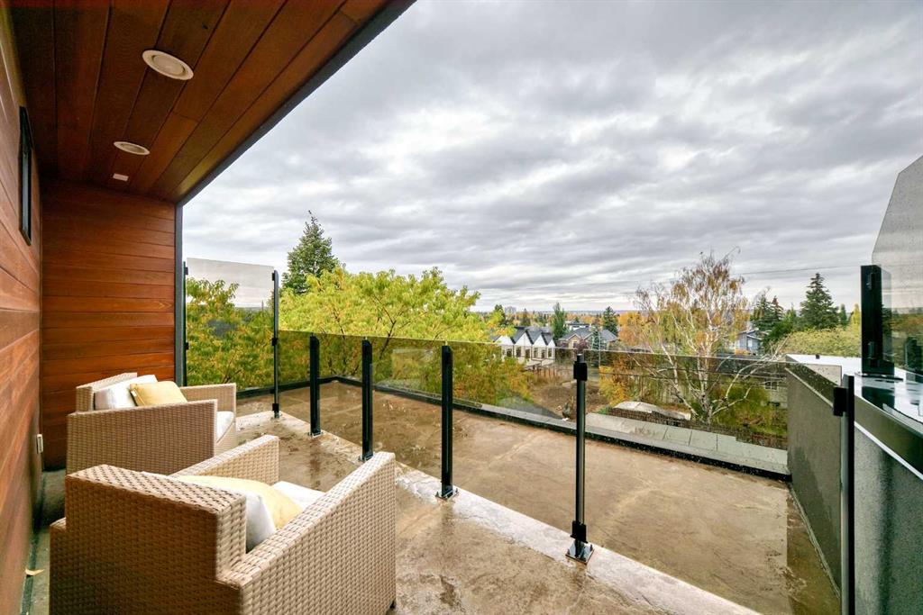 This contemporary, fully developed Inner City Home is loaded with upgrades thru-out and offers over 3200 SqFt of luxury living space complimented with a quiet location and city and mountain views from the Rooftop Patios. With 9 Foot Ceilings on the Main, central A/C and radiant in-floor heating in the Lower Level and all Bathrooms, the open concept floor plan starts with the bright Entry leading to the fully equipped gourmet Kitchen ideal for entertaining, complete with a 10 ft island with built-in wine rack, granite countertops, high-end stainless steel appliances including the gas down-draft cook top and built-in wall ovens, wine fridge and walk in pantry. The Dining area sits in front of a large floor to ceiling window, the Living Room features accent windows and a cozy gas fireplace with access to the backyard and there is the 2pce Guest Bath. The open riser staircase with glass panel wall leads up to the 2nd Level where you’ll find the massive Primary Bedroom offering a 5Pce Ensuite with walk-in shower and Air-Jet corner soaker tub plus, the 15’ walk-in closet with custom California Closet wood built-ins. There is also the 2nd Bedroom with it’s own 4Pce Ensuite, the Den/Flex area and Laundry Room. The Top Level has a 3rd Bedroom complete with a 3Pce Ensuite that can also be used as a Home Gym, Office or a Bonus Room with access to both Rooftop Patios which features stamped concrete with smoked glass panel rails (rails can be pushed out to make a full wrap around patio). The Lower Level is fully developed with a large Media/Family Room, the 4th Bedroom, another Full Bath and a Storage Room. Outside, you’ll find your private backyard oasis ideal for entertaining and the fully finished double detached Garage that’s roughed in for a heater.
