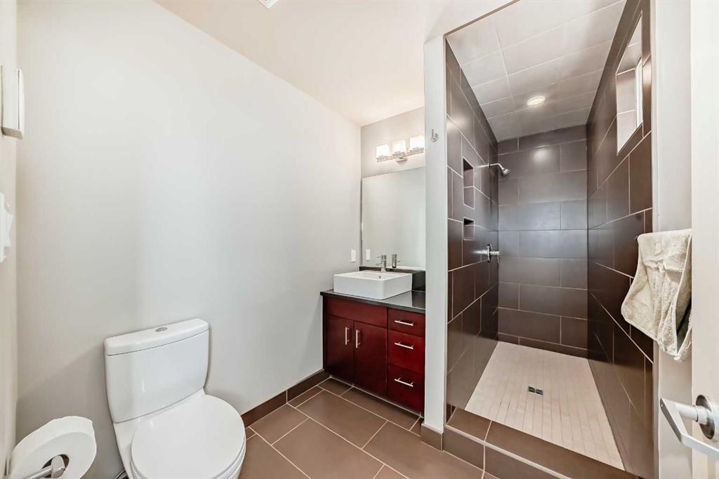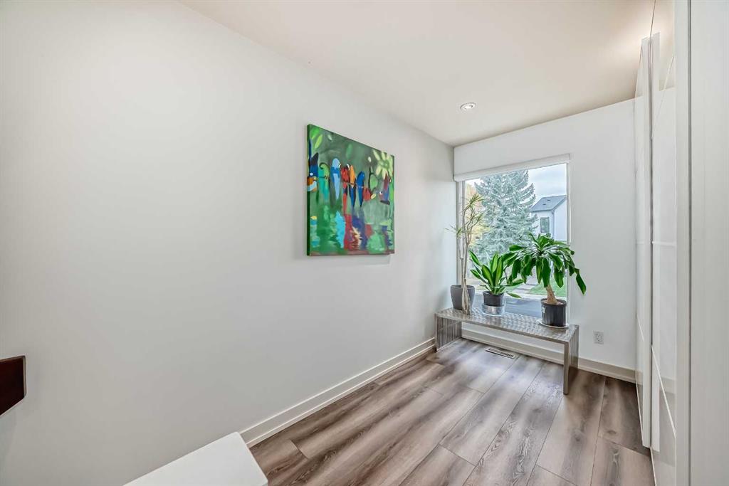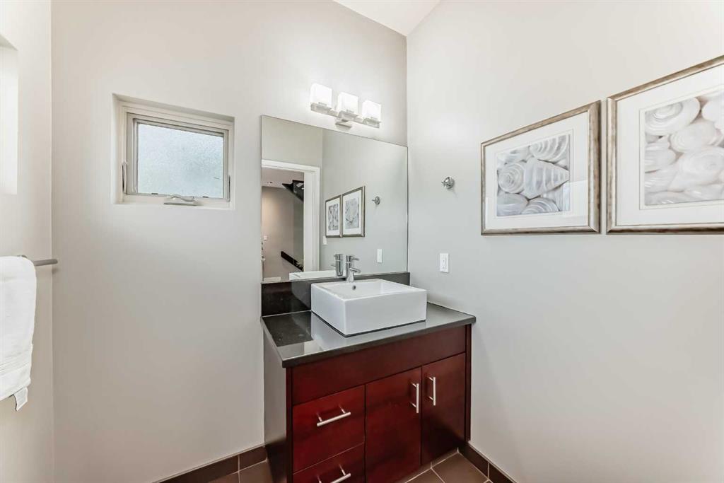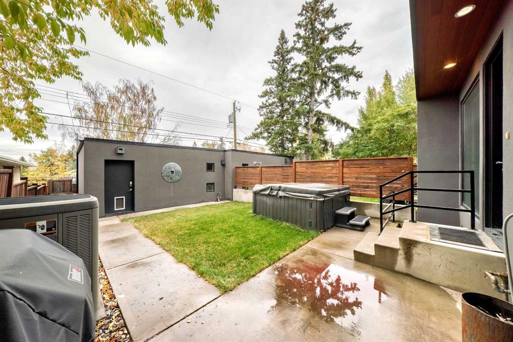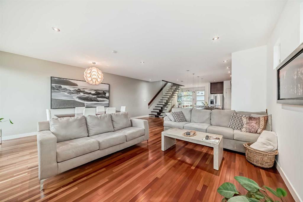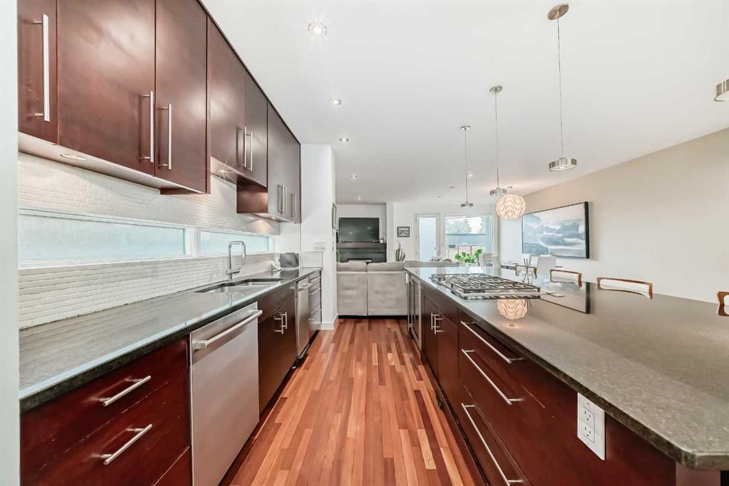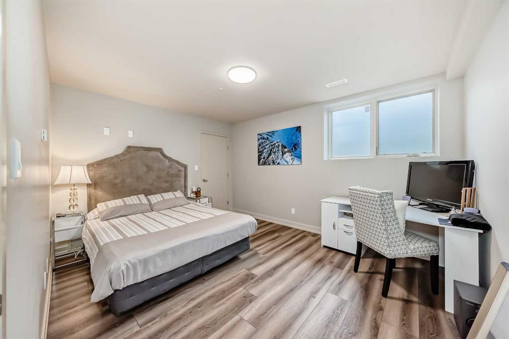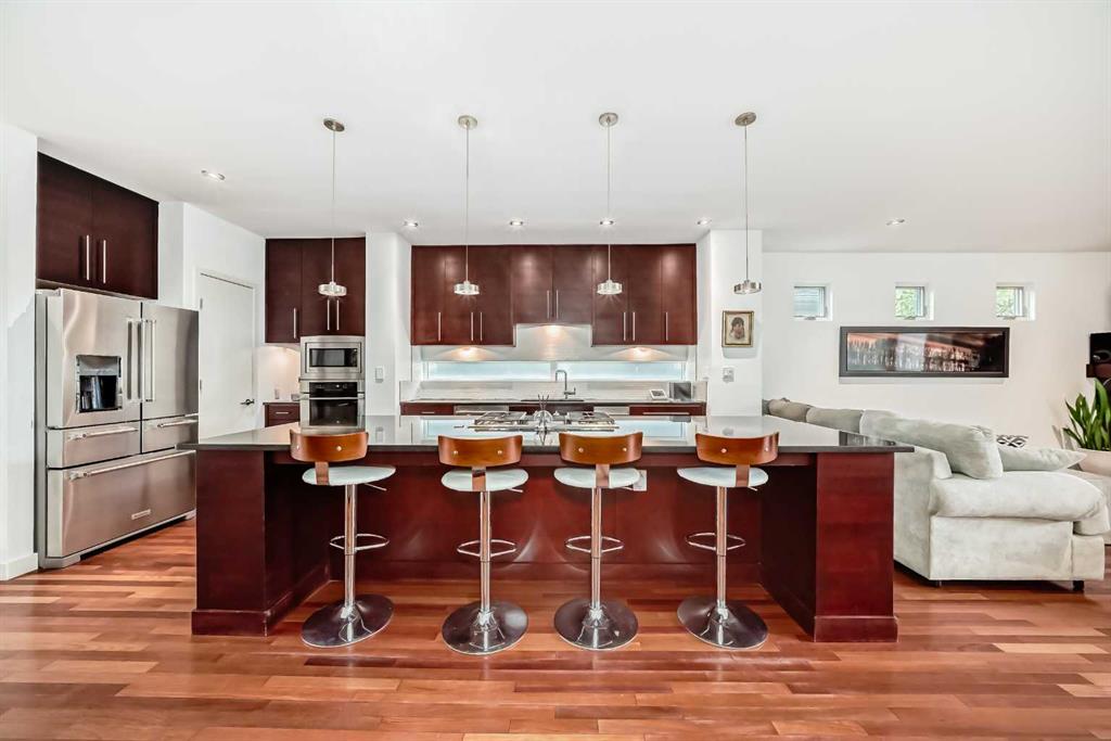 This contemporary, fully developed Inner City Home is loaded with upgrades thru-out and offers over 3200 SqFt of luxury living space complimented with a quiet location and city and mountain views from the Rooftop Patios. With 9 Foot Ceilings on the Main, central A/C and radiant in-floor heating in the Lower Level and all Bathrooms, the open concept floor plan starts with the bright Entry leading to the fully equipped gourmet Kitchen ideal for entertaining, complete with a 10 ft island with built-in wine rack, granite countertops, high-end stainless steel appliances including the gas down-draft cook top and built-in wall ovens, wine fridge and walk in pantry. The Dining area sits in front of a large floor to ceiling window, the Living Room features accent windows and a cozy gas fireplace with access to the backyard and there is the 2pce Guest Bath. The open riser staircase with glass panel wall leads up to the 2nd Level where you’ll find the massive Primary Bedroom offering a 5Pce Ensuite with walk-in shower and Air-Jet corner soaker tub plus, the 15’ walk-in closet with custom California Closet wood built-ins. There is also the 2nd Bedroom with it’s own 4Pce Ensuite, the Den/Flex area and Laundry Room. The Top Level has a 3rd Bedroom complete with a 3Pce Ensuite that can also be used as a Home Gym, Office or a Bonus Room with access to both Rooftop Patios which features stamped concrete with smoked glass panel rails (rails can be pushed out to make a full wrap around patio). The Lower Level is fully developed with a large Media/Family Room, the 4th Bedroom, another Full Bath and a Storage Room. Outside, you’ll find your private backyard oasis ideal for entertaining and the fully finished double detached Garage that’s roughed in for a heater.