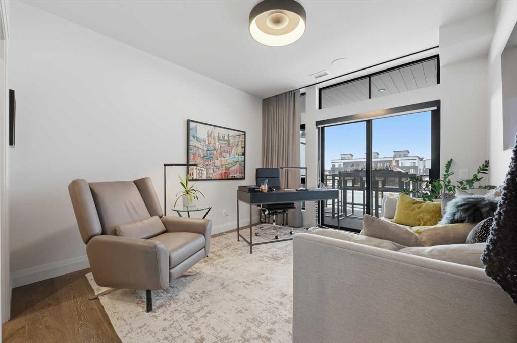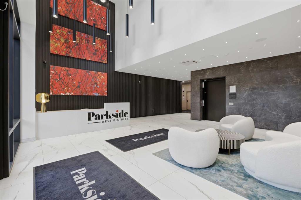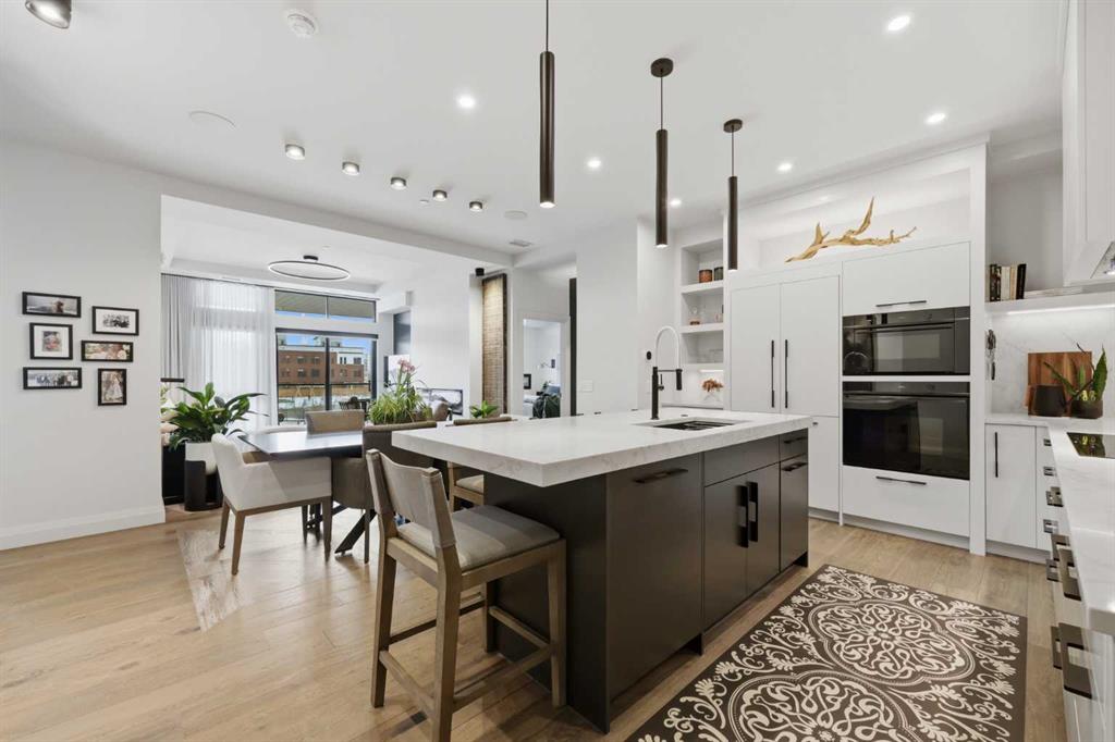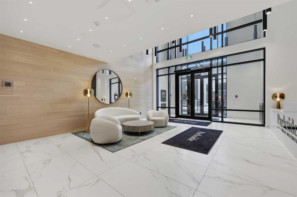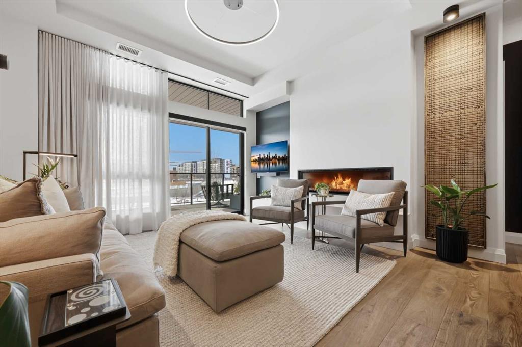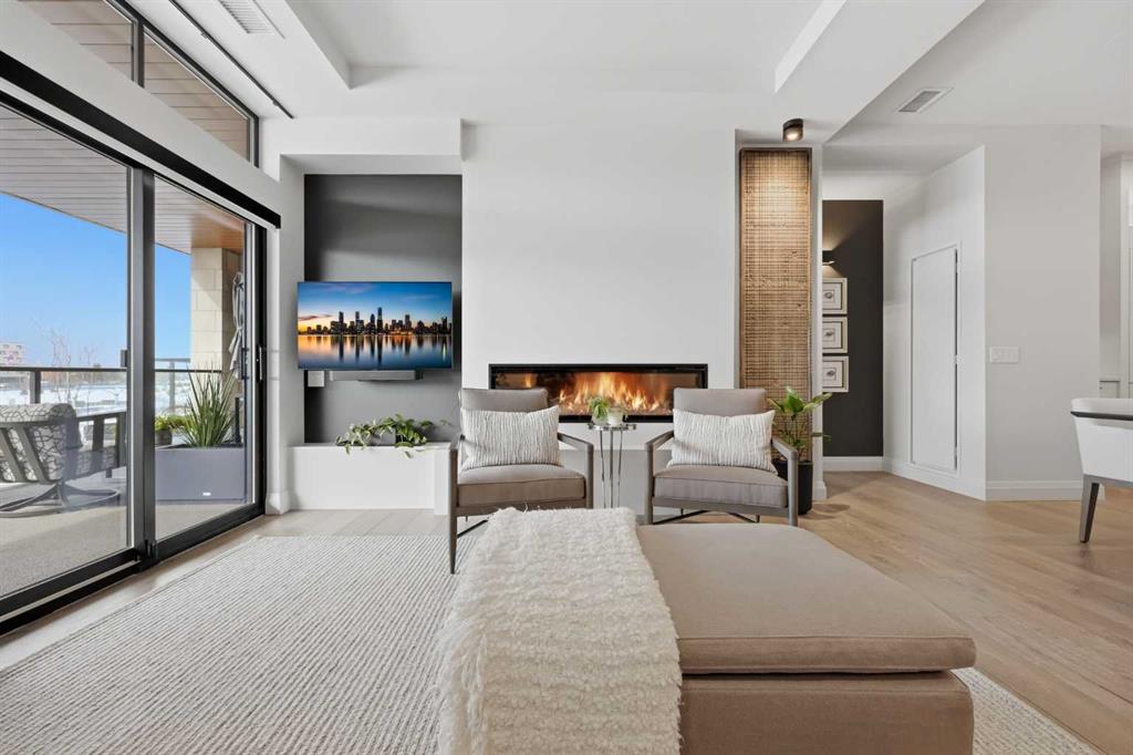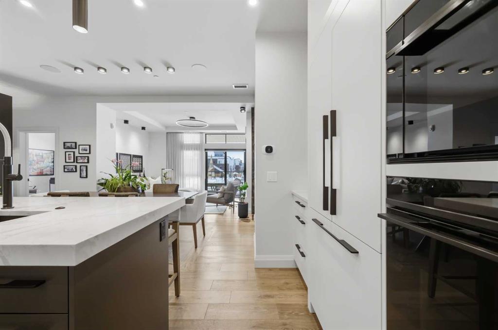 Discover the pinnacle of lock-and-leave living in Calgary's most sought-after luxury building. This meticulously reimagined, 2-bedroom, 2-bath residence demonstrates that nothing was spared in the pursuit of something truly exceptional. Step inside to unmistakable quality across 1,415 sq. ft. of elegance. The home features over $100,000 in distinctive upgrades and designer finishes. The original layout was thoughtfully redesigned before any materials were selected. The spacious entry welcomes you, anchored by a generous closet with built-in cabinetry and an impeccably finished powder room featuring seven-inch quartz countertops. Wide-plank French oak hardwood runs throughout, with a custom inlay in the dining area that adds a distinctive architectural feature. Every light fixture is upgraded, including gallery-style art lighting, pot lights, and refined wall sconces in the primary suite. Expansive 10-foot ceilings and floor-to-ceiling windows overlook Radio Park, flooding the space with natural light and unobstructed views. The chef’s kitchen is fully custom, starting with upgraded cabinetry, open shelving and extending to every appliance. The integrated refrigerator, induction cooktop, wall oven, and dishwasher demonstrate a commitment to quality. The walk-in pantry features a glass door, wraparound open shelving, a beverage fridge, a wine rack, and beautiful botanical-accented wallpaper that transforms how you live and entertain. The living room was extended beyond the standard plan to accommodate a larger footprint and features an elongated fireplace. Sheer drapery in the living area keeps the park views centre stage while maintaining an effortless, airy elegance throughout the day. Opening the sliding doors to your 37-foot uninterrupted covered terrace extends the living space for seamless entertaining, unmatched in the building. The primary suite is a true sanctuary, with a solid-core door, blackout drapes, and a sliding glass door that leads directly to the ensuite bathroom, evoking a boutique-hotel ambiance. The ensuite is truly spa-calibre, featuring dual vanities, premium quartz, a fully tiled shower with a quartz bench, a striking black-and-white soaker tub, and heated floors. Through the bathroom lies a dedicated laundry room with a worktop, a hanging rod, and built-in shelving. The walk-in closet features an extensive organizer, enough room for two! The second bedroom functions as an executive home office or guest room, and is served by a second full bath with the condo's signature matte-black fixtures and oversized penny tiles. Two titled parking stalls, positioned directly beside the elevator for maximum convenience, plus one titled storage unit on the third floor. Residents of Parkside enjoy exclusive access to a rooftop patio, an owner's lounge with entertainment kitchen, and a fully equipped fitness centre - all set above award-winning green space and steps from Calgary’s best dining and shops. Experience a lifestyle without compromise.