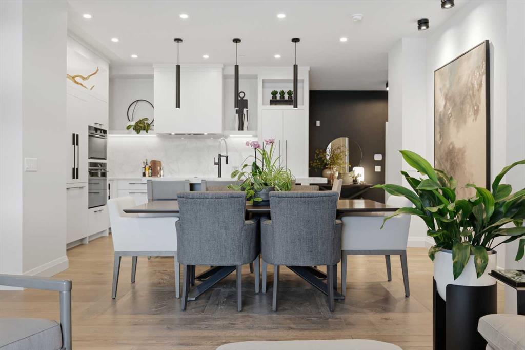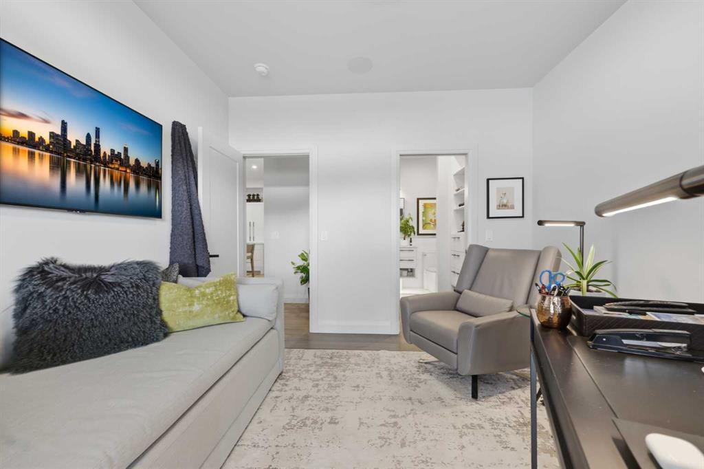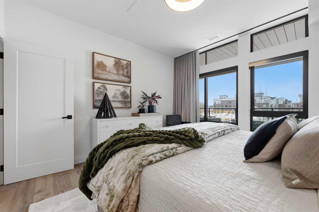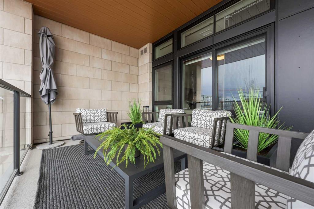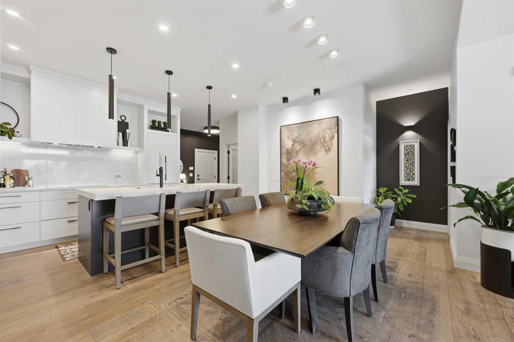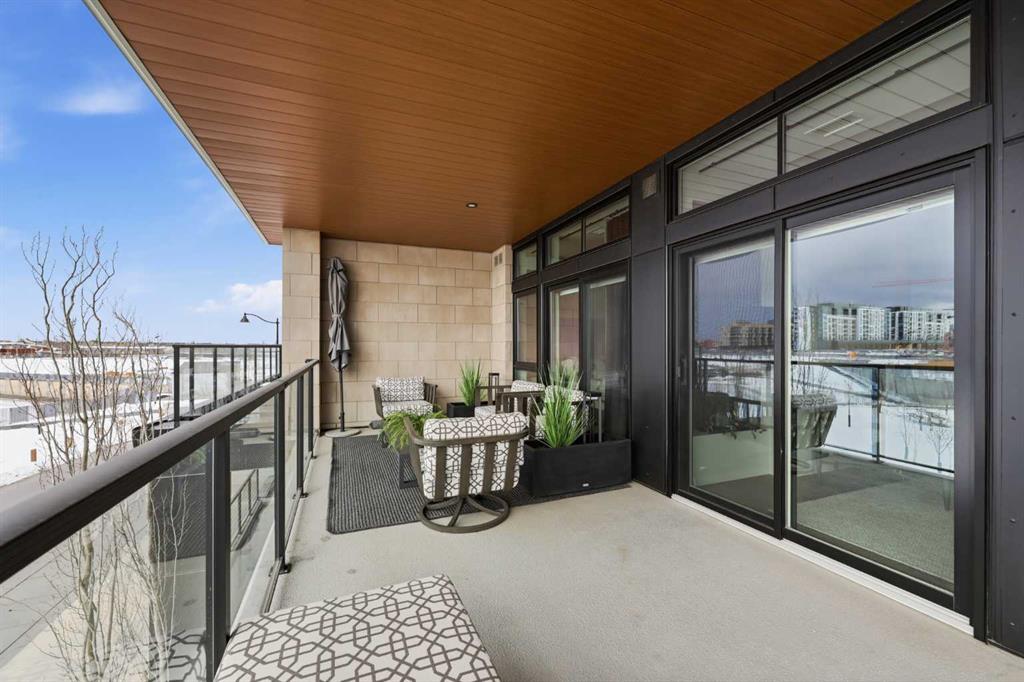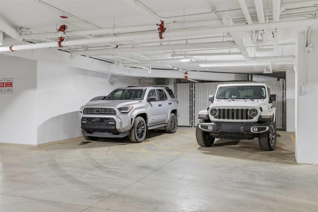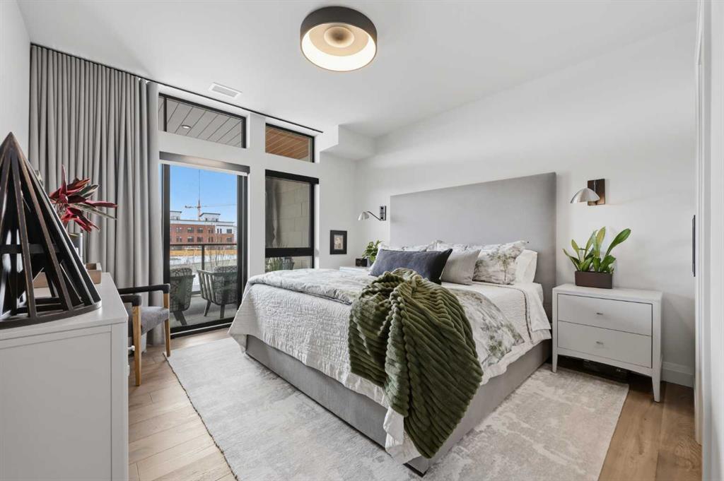 Discover the pinnacle of lock-and-leave living in Calgary's most sought-after luxury building. This meticulously reimagined, 2-bedroom, 2-bath residence demonstrates that nothing was spared in the pursuit of something truly exceptional. Step inside to unmistakable quality across 1,415 sq. ft. of elegance. The home features over $100,000 in distinctive upgrades and designer finishes. The original layout was thoughtfully redesigned before any materials were selected. The spacious entry welcomes you, anchored by a generous closet with built-in cabinetry and an impeccably finished powder room featuring seven-inch quartz countertops. Wide-plank French oak hardwood runs throughout, with a custom inlay in the dining area that adds a distinctive architectural feature. Every light fixture is upgraded, including gallery-style art lighting, pot lights, and refined wall sconces in the primary suite. Expansive 10-foot ceilings and floor-to-ceiling windows overlook Radio Park, flooding the space with natural light and unobstructed views. The chef’s kitchen is fully custom, starting with upgraded cabinetry, open shelving and extending to every appliance. The integrated refrigerator, induction cooktop, wall oven, and dishwasher demonstrate a commitment to quality. The walk-in pantry features a glass door, wraparound open shelving, a beverage fridge, a wine rack, and beautiful botanical-accented wallpaper that transforms how you live and entertain. The living room was extended beyond the standard plan to accommodate a larger footprint and features an elongated fireplace. Sheer drapery in the living area keeps the park views centre stage while maintaining an effortless, airy elegance throughout the day. Opening the sliding doors to your 37-foot uninterrupted covered terrace extends the living space for seamless entertaining, unmatched in the building. The primary suite is a true sanctuary, with a solid-core door, blackout drapes, and a sliding glass door that leads directly to the ensuite bathroom, evoking a boutique-hotel ambiance. The ensuite is truly spa-calibre, featuring dual vanities, premium quartz, a fully tiled shower with a quartz bench, a striking black-and-white soaker tub, and heated floors. Through the bathroom lies a dedicated laundry room with a worktop, a hanging rod, and built-in shelving. The walk-in closet features an extensive organizer, enough room for two! The second bedroom functions as an executive home office or guest room, and is served by a second full bath with the condo's signature matte-black fixtures and oversized penny tiles. Two titled parking stalls, positioned directly beside the elevator for maximum convenience, plus one titled storage unit on the third floor. Residents of Parkside enjoy exclusive access to a rooftop patio, an owner's lounge with entertainment kitchen, and a fully equipped fitness centre - all set above award-winning green space and steps from Calgary’s best dining and shops. Experience a lifestyle without compromise.