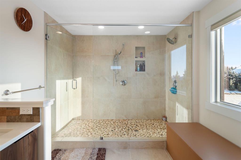 MOUNTAIN VIEWS! Set on 2-acres in prestigious Bearspaw Summit Estates, this remarkable 4659sqft home is refined country living with effortless access to the city. The property is moments from top schools, everyday conveniences, and just a 9-minute drive to Rocky View Co-Op. At the heart of the home, the living room makes a striking first impression with soaring ceilings, expansive picture windows, and a dramatic floor-to-ceiling stone wood-burning fireplace that anchors the space while framing breathtaking natural vistas beyond. The custom-designed kitchen is elegance and function in one, featuring quartz countertops, a generous wrap-around island, new (2024) Samsung stainless steel appliances, and a walk-through pantry. It flows seamlessly into the spacious dining area and the southwest-facing sunroom designed as a four-season retreat—glass walls capture uninterrupted mountain views and golden evening light year-round. The upper level is thoughtfully designed for comfort and family living. The serene primary retreat offers sweeping mountain views, a private sunroom, and a bright, spa-inspired 5-piece ensuite. 2 additional oversized bedrooms, a 3-piece bathroom, a full laundry room, and a flexible workspace complete this level for exceptional versatility. The fully finished walkout lower level offers an adaptable studio space—ideal for fitness, creativity, or quiet reflection—enhanced by a cozy gas fireplace and a 3-piece bathroom. Walk out to a concrete patio with new railings, effortlessly extending the living space into the outdoors.The fully heated 3-car attached garage mirrors the home’s elevated standard, complete with custom maple cabinetry, granite countertops, tiled flooring, and an additional refrigerator—ideal for entertaining, storage, or a secondary prep space. Mature trees provide natural seclusion, while thoughtful enhancements elevate both beauty and function: a custom firepit (2024), an upgraded children’s playhouse with solar lighting (2024), and a fully wired 3-season retreat structure built on poured concrete (2023), perfect for recreation or peaceful escape. Recently added: a Buddha waterfall feature, solar landscape lighting, 6 large planters, and gated entry pillars create a sense of tranquility and arrival. Extensive upgrades completed in 2024 ensure modern comfort: updated mechanical room; 2 new furnaces with humidifiers, a tankless hot water heater, sump pump, water softener, reverse osmosis drinking water system, and a smart security/automation system. New flooring upstairs and in the basement, fresh paint throughout, and fully renovated kitchen, bathrooms, and laundry room with new cabinetry, quartz countertops, designer lighting, modern fixtures, and backsplashes. Additional recent upgrades include closet organizers, enhanced sunrooms, and upgraded balconies. This is an exceptional Bearspaw offering, where light, landscape, and craftsmanship exist in quiet harmony—a home that invites you to slow down, breathe deeply, and truly arrive.