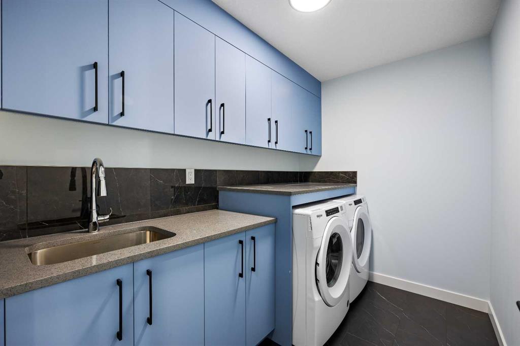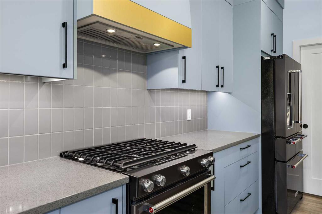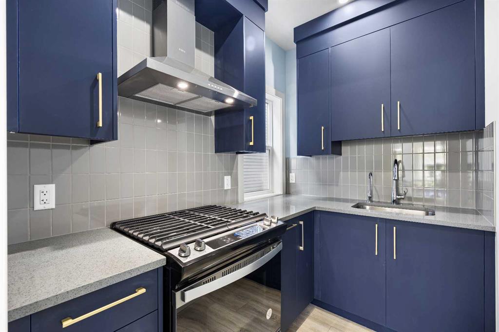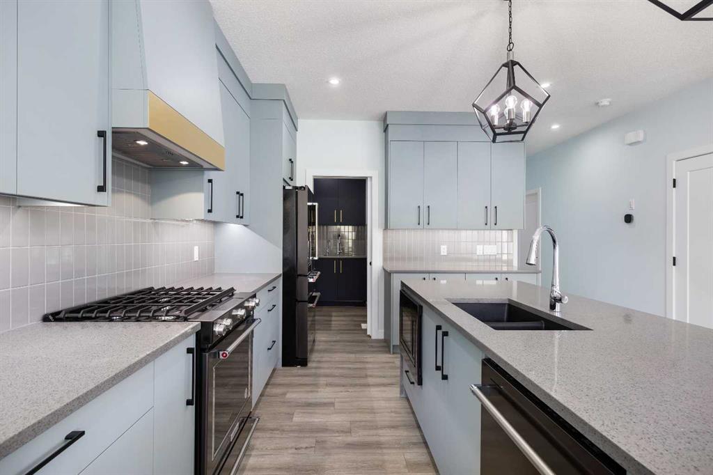 The main level features 9-foot ceilings and luxury vinyl plank flooring throughout. At the heart of the home is the chef’s kitchen, outfitted with premium KitchenAid appliances, soft-closing cabinetry and drawers, quartz countertops, a centre island with bar seating, full-height cabinets, under-cabinet lighting, and a sleek hidden range hood. A separate spice kitchen adds additional culinary space, complete with a second gas stove, range hood, bold royal blue cabinetry and elegant gold hardware, ideal for preparing aromatic dishes with ease!