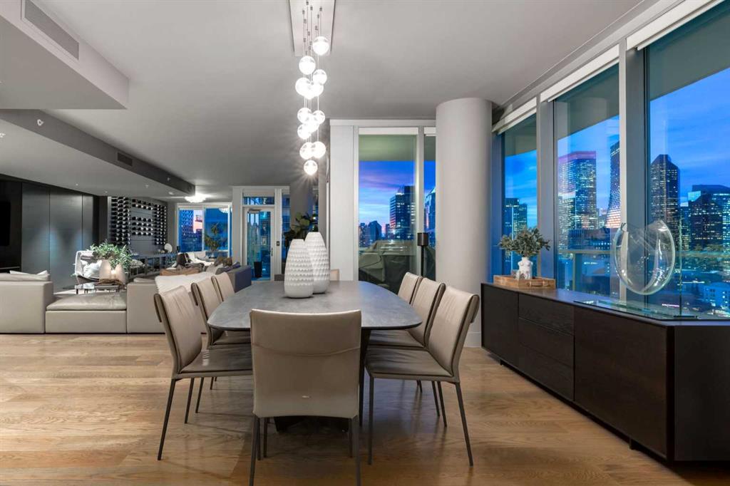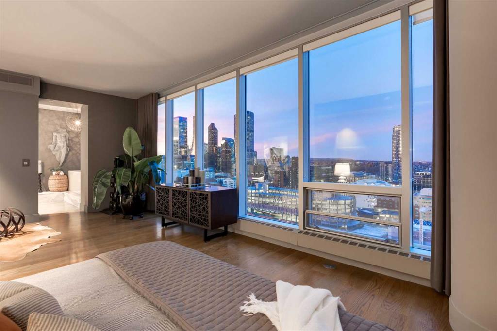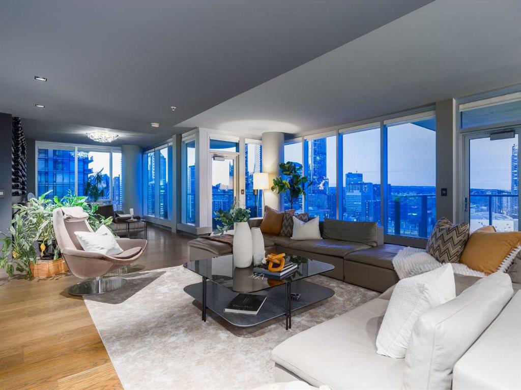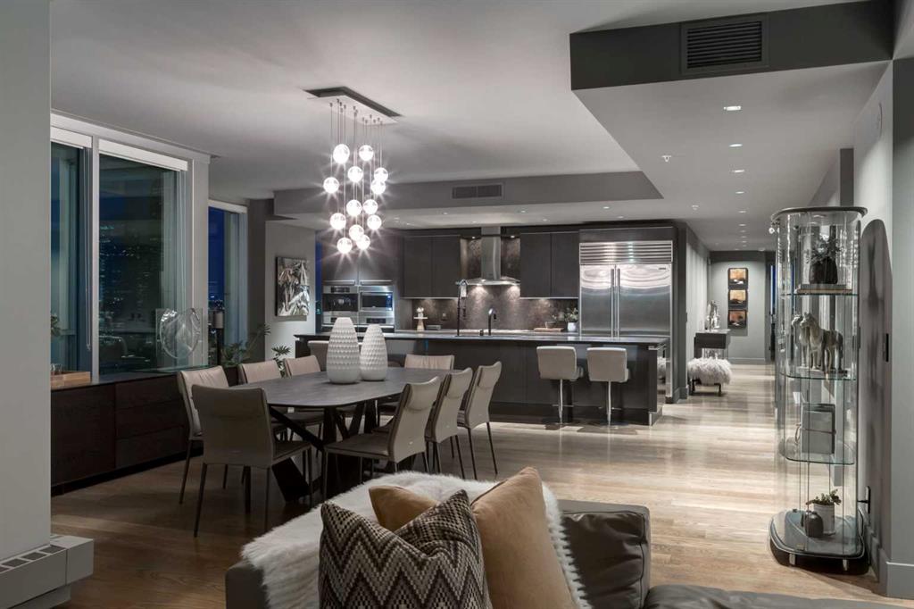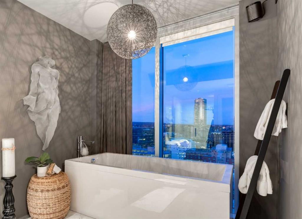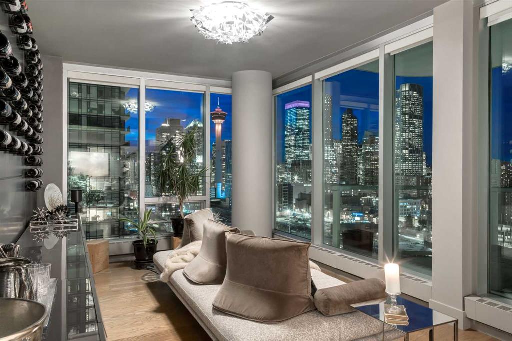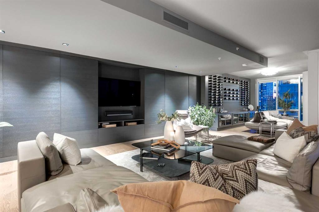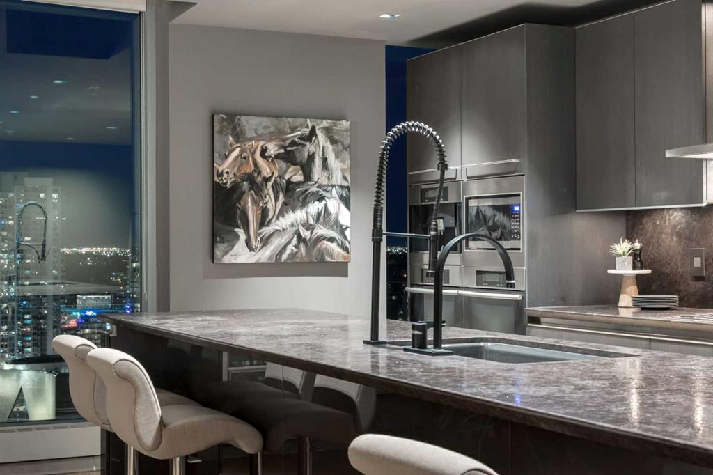 Experience panoramic views of the city skyline from every window in this modern executive two-bedroom residence. This incredible two-bedroom property offers almost 2600 SF of visionary living space and is centrally located for its new owners to take in “all of what downtown living” has to offer. This property whispers sophistication and refined living with its cutting-edge interior design. A concierge is on-site 24/7 to greet your guests and provide the utmost in secured living. Three parking stalls are included for your summer convertible toys. The state-of-the-art designer kitchen features a full Miele luxury appliance package and a gigantic leathered granite island, perfect for Sommelier-hosted wine tastings and entertaining. The living room features rift oak custom hidden cabinetry on each side of the media center and is open to the lovely dining space that features a Bocci chandelier hovering over this dreamy space. The relaxation lounge has the most stupendous views of the Calgary Tower and city skyline and showcases a Vin de Garde luxury wine display wall. The romantic primary suite features its own East terrace, two dressing rooms and a decadent spa-like ensuite with a free-standing bathtub set on a marble base, dual vanities and a frameless glass marble shower. The secondary suite is situated on the East wing with streams of natural light and has its own ensuite. This space is perfect for guests or can be used as a home office.