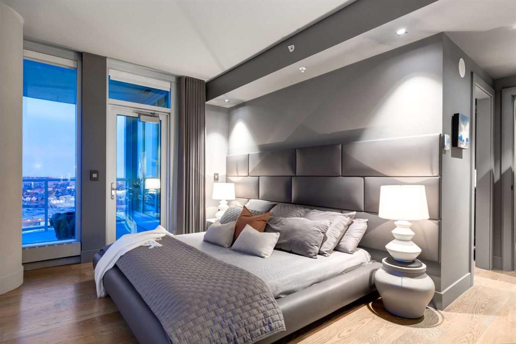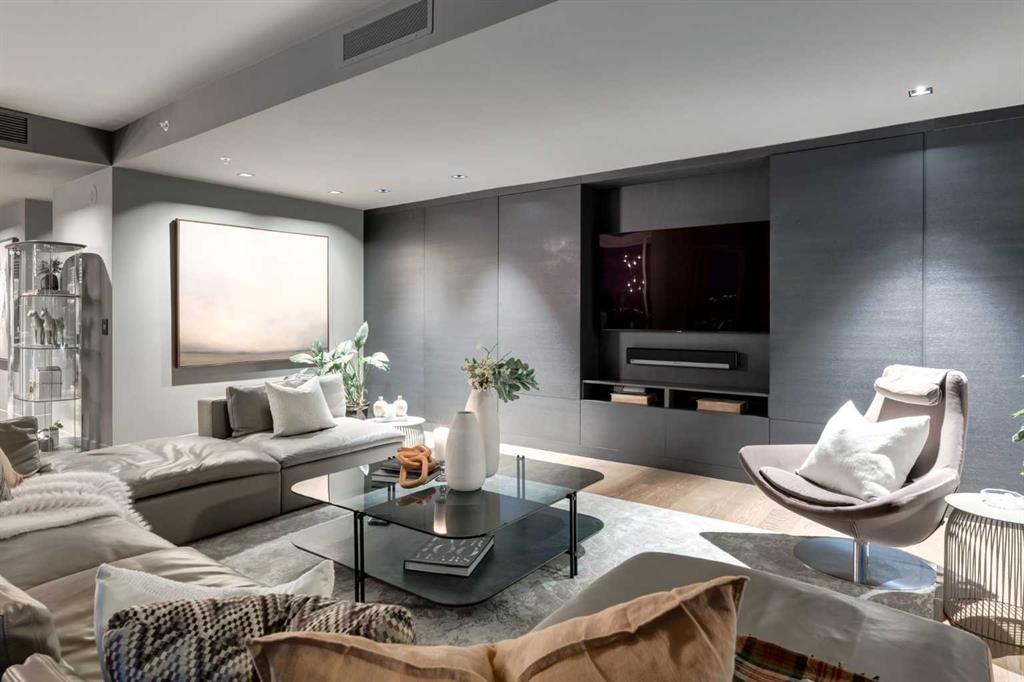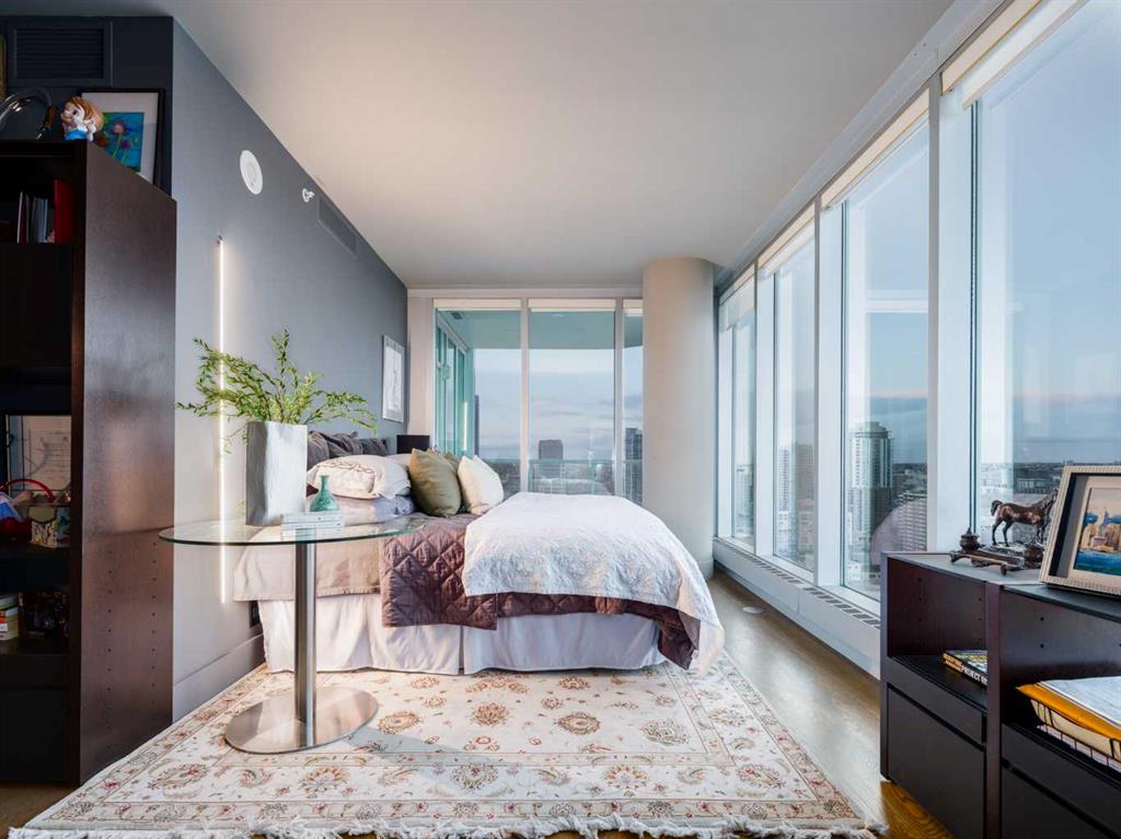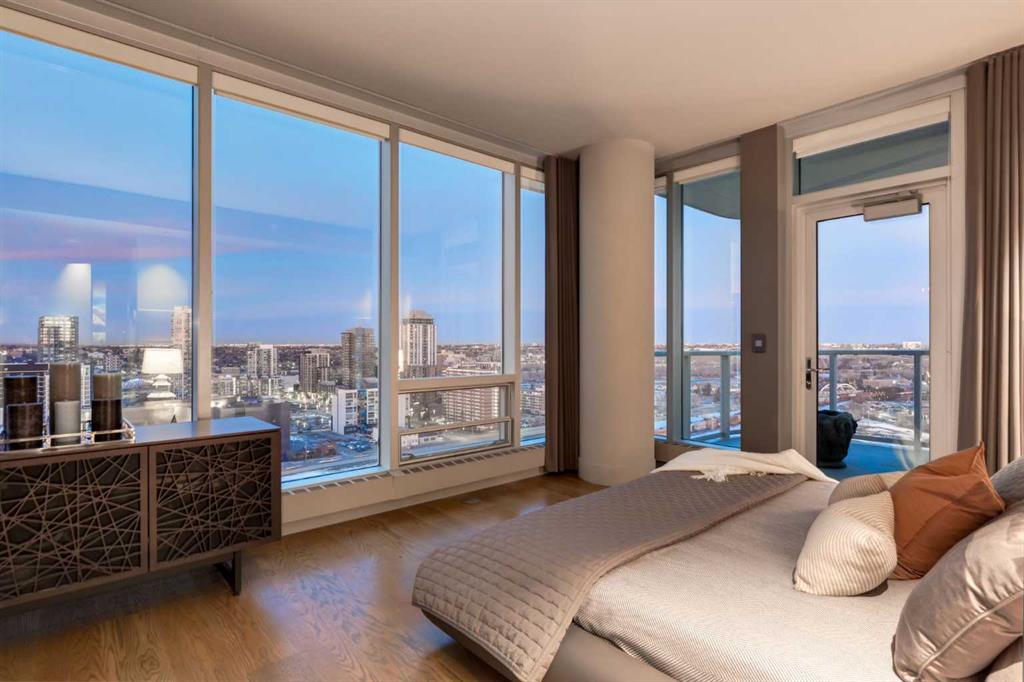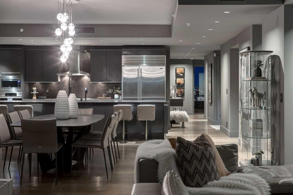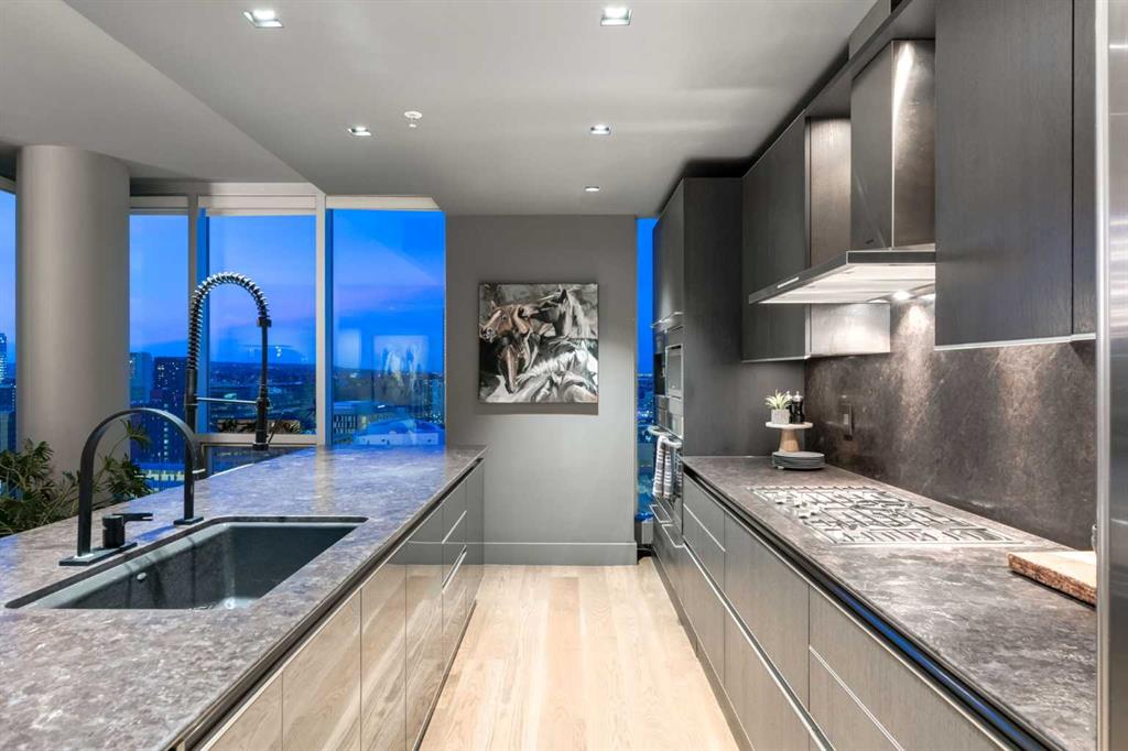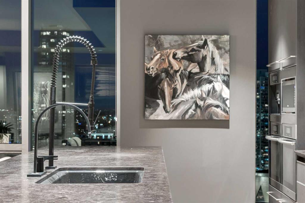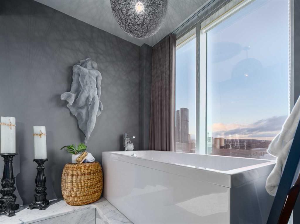 Experience panoramic views of the city skyline from every window in this modern executive two-bedroom residence. This incredible two-bedroom property offers almost 2600 SF of visionary living space and is centrally located for its new owners to take in “all of what downtown living” has to offer. This property whispers sophistication and refined living with its cutting-edge interior design. A concierge is on-site 24/7 to greet your guests and provide the utmost in secured living. Three parking stalls are included for your summer convertible toys. The state-of-the-art designer kitchen features a full Miele luxury appliance package and a gigantic leathered granite island, perfect for Sommelier-hosted wine tastings and entertaining. The living room features rift oak custom hidden cabinetry on each side of the media center and is open to the lovely dining space that features a Bocci chandelier hovering over this dreamy space. The relaxation lounge has the most stupendous views of the Calgary Tower and city skyline and showcases a Vin de Garde luxury wine display wall. The romantic primary suite features its own East terrace, two dressing rooms and a decadent spa-like ensuite with a free-standing bathtub set on a marble base, dual vanities and a frameless glass marble shower. The secondary suite is situated on the East wing with streams of natural light and has its own ensuite. This space is perfect for guests or can be used as a home office.