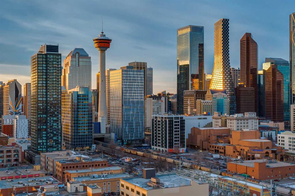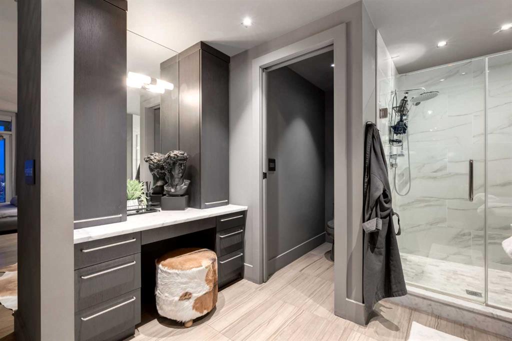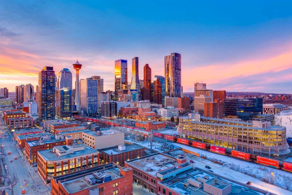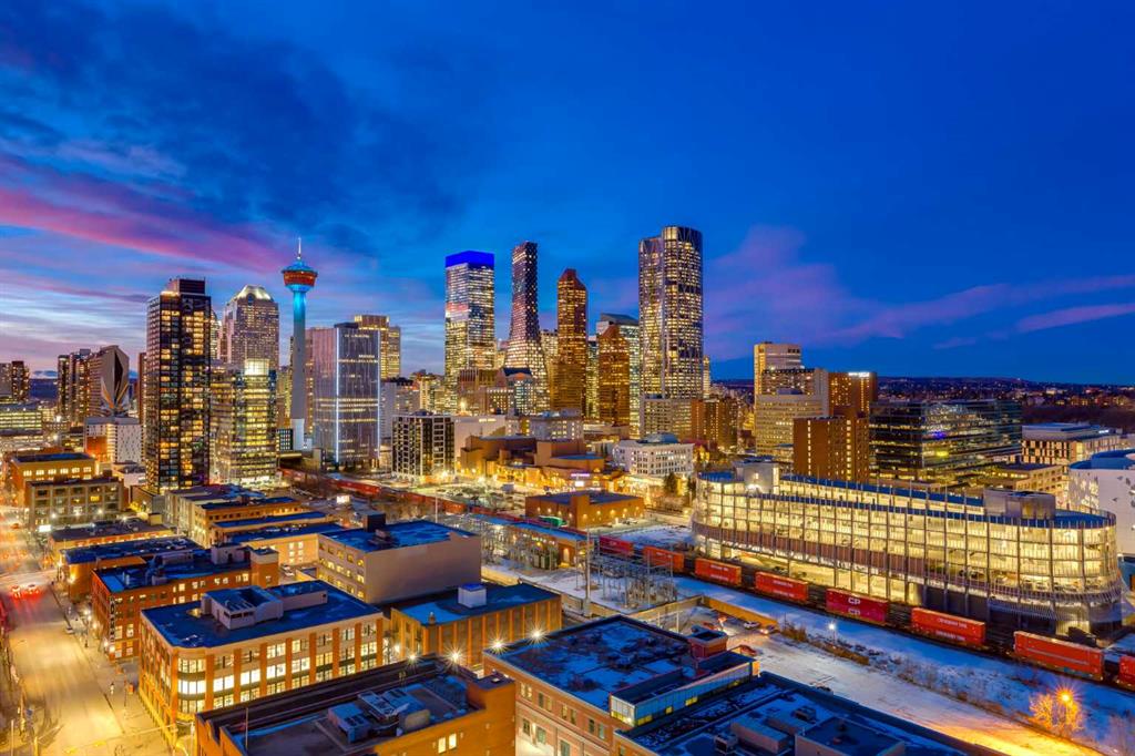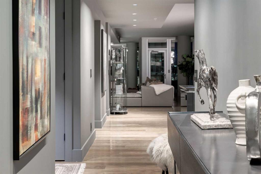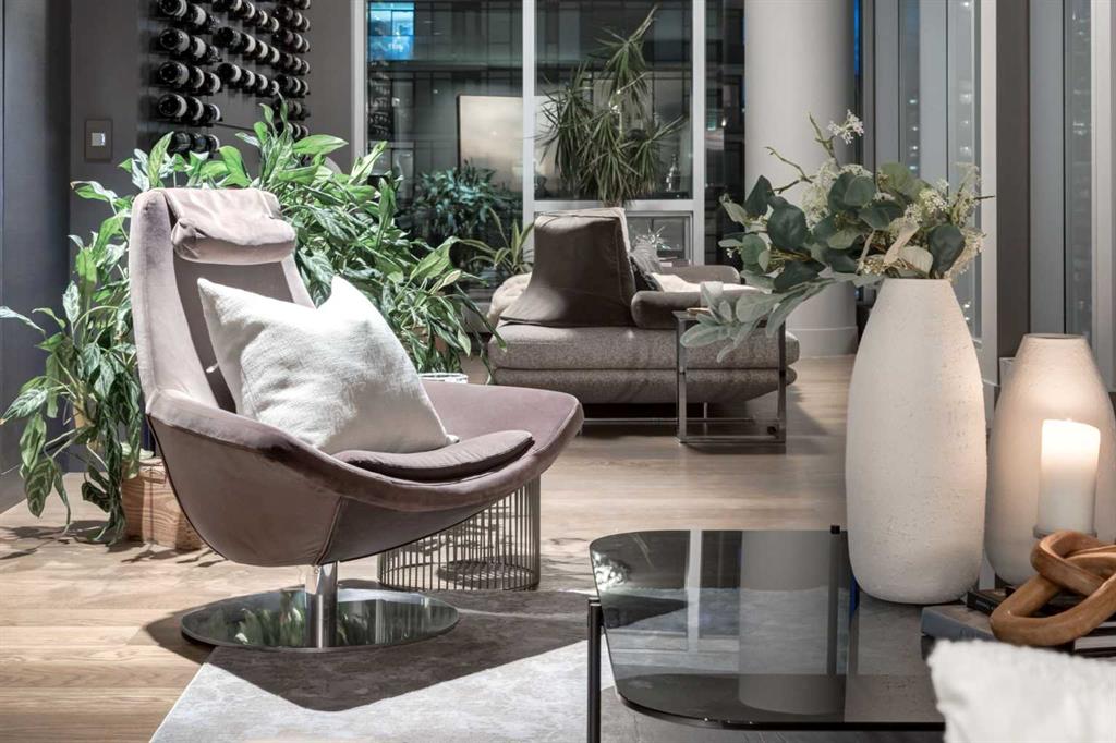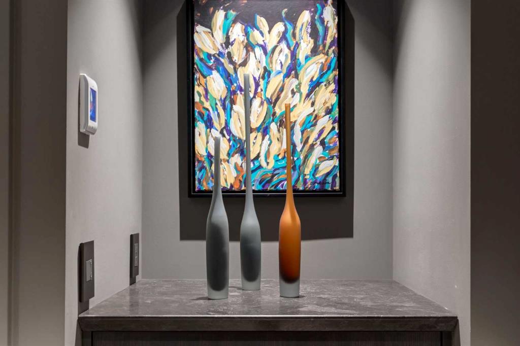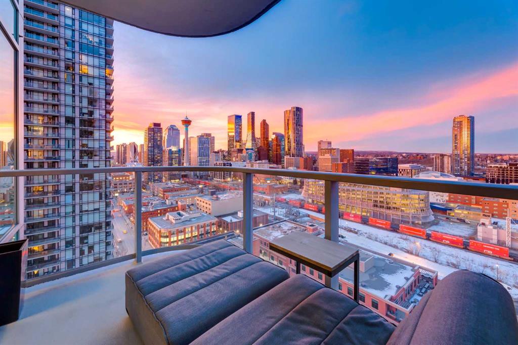 Experience panoramic views of the city skyline from every window in this modern executive two-bedroom residence. This incredible two-bedroom property offers almost 2600 SF of visionary living space and is centrally located for its new owners to take in “all of what downtown living” has to offer. This property whispers sophistication and refined living with its cutting-edge interior design. A concierge is on-site 24/7 to greet your guests and provide the utmost in secured living. Three parking stalls are included for your summer convertible toys. The state-of-the-art designer kitchen features a full Miele luxury appliance package and a gigantic leathered granite island, perfect for Sommelier-hosted wine tastings and entertaining. The living room features rift oak custom hidden cabinetry on each side of the media center and is open to the lovely dining space that features a Bocci chandelier hovering over this dreamy space. The relaxation lounge has the most stupendous views of the Calgary Tower and city skyline and showcases a Vin de Garde luxury wine display wall. The romantic primary suite features its own East terrace, two dressing rooms and a decadent spa-like ensuite with a free-standing bathtub set on a marble base, dual vanities and a frameless glass marble shower. The secondary suite is situated on the East wing with streams of natural light and has its own ensuite. This space is perfect for guests or can be used as a home office.