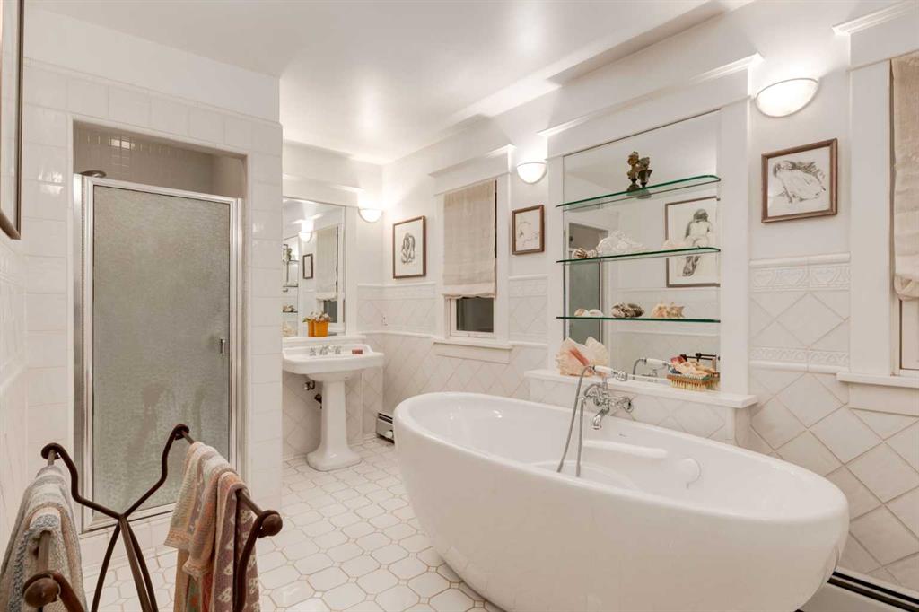 This two-storey residence features four generously sized bedrooms, a comfortable library or entertainment area, and a wine/root cellar tucked beneath a main floor powder room added in 2015. The original millwork with leaded glass, restored quarter-sawn oak, and a hidden liquor cabinet from the Prohibition era speak to the home’s storied past. A major renovation completed in the 1990s introduced radiant stone floor heating, oak hardwood, and custom finishes throughout, enhancing comfort while maintaining architectural integrity.