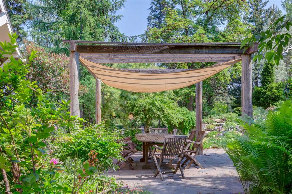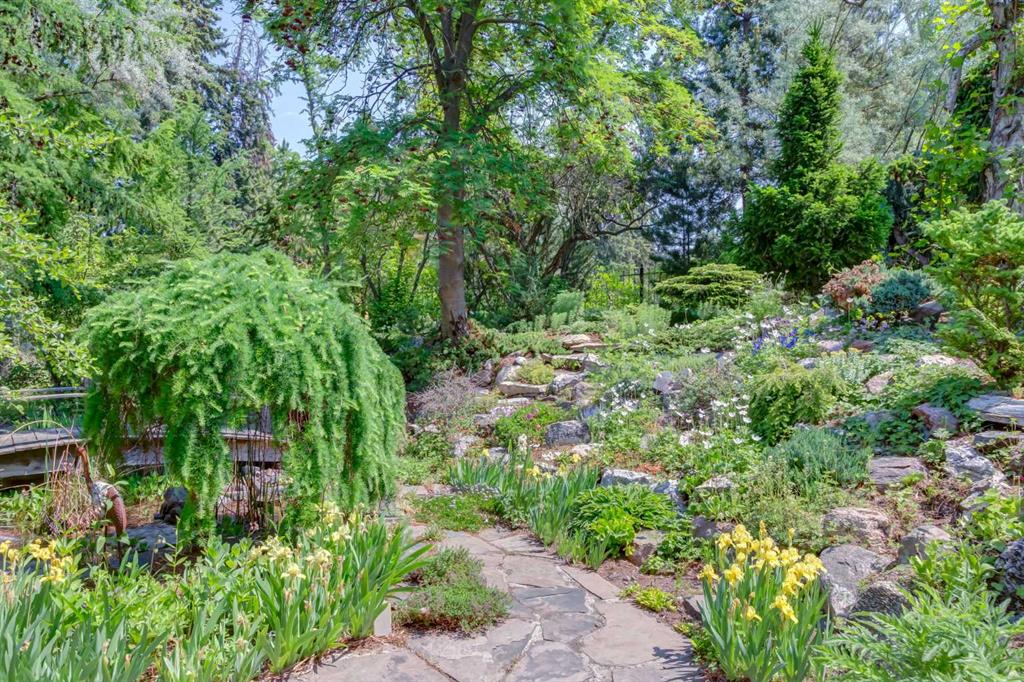 The kitchen, renovated in 1995 by Empire Kitchen & Bath, includes Downsview cabinetry, a Sub-Zero refrigerator, a custom copper hood fan, and city-facing windows that bring natural light into the space. The front veranda overlooks a mature garden established over 77 years ago, now a vibrant arboretum featuring multiple species of larch trees and a tranquil pond that attracts a variety of birds. Outdoor dining areas are integrated into the landscape, creating a private urban retreat.