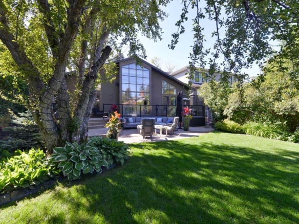The kitchen, renovated in 1995 by Empire Kitchen & Bath, includes Downsview cabinetry, a Sub-Zero refrigerator, a custom copper hood fan, and city-facing windows that bring natural light into the space. The front veranda overlooks a mature garden established over 77 years ago, now a vibrant arboretum featuring multiple species of larch trees and a tranquil pond that attracts a variety of birds. Outdoor dining areas are integrated into the landscape, creating a private urban retreat.