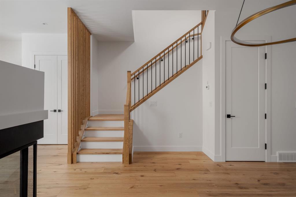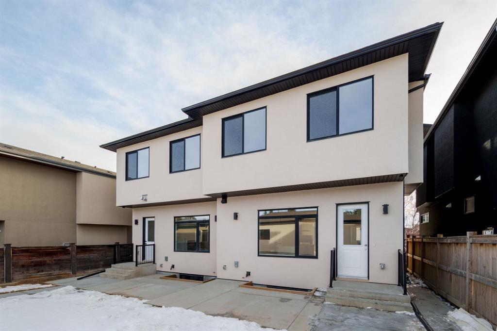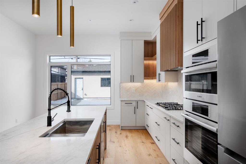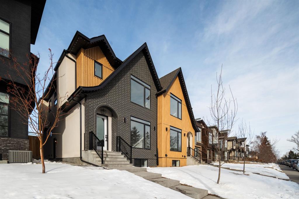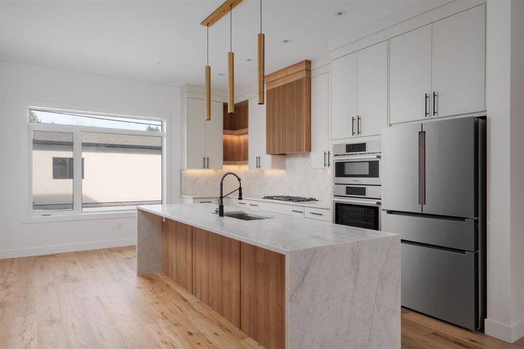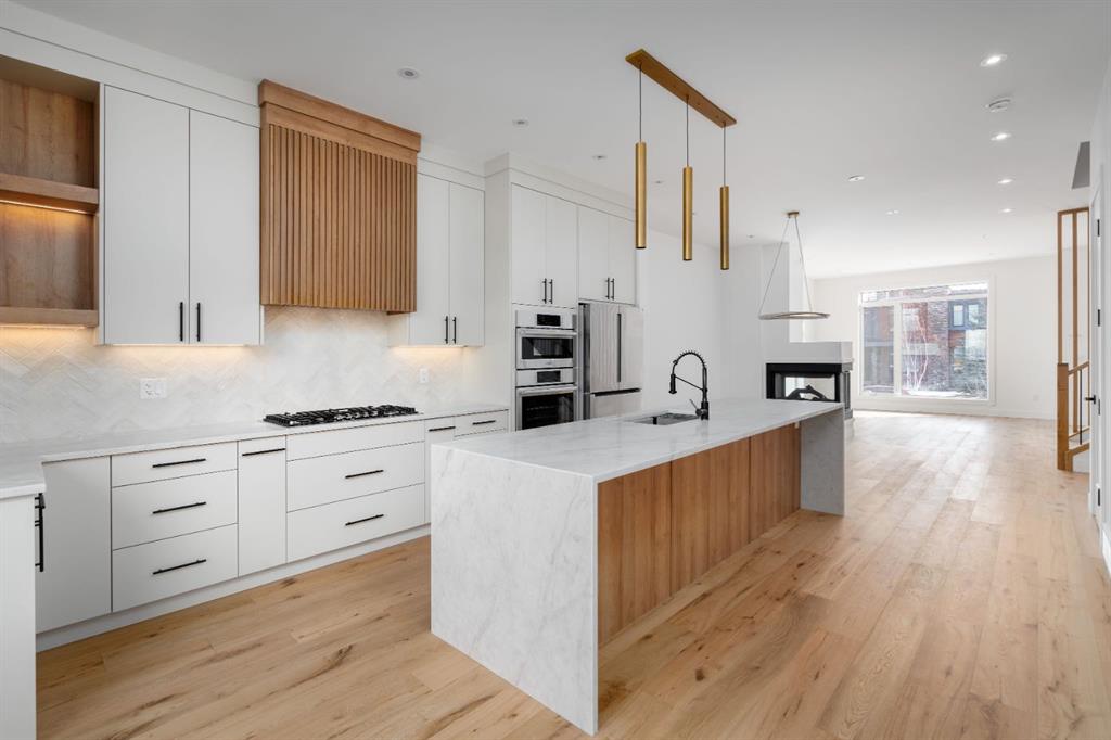 | Show Suite Open House Saturday March 14th and Sunday March 15th from 12:00pm-3:30pm | Welcome to The Killarney Collection in SW Calgary—thoughtfully crafted on a quiet street, this fully upgraded duplex infill offers a refined balance of scale, texture, and modern comfort. From the moment you arrive, the home makes a striking first impression with its sleek, contemporary exterior, pairing oversized triple-pane windows for abundant natural light with warm natural tones of true brick detailing and stucco accenting stands out. Inside, 10-foot main floor ceilings create a grand sense of arrival, setting the tone for the interior designer–curated colour palette carried throughout the home. Every detail has been intentionally explored, with the heart of the main floor anchored by a chef-inspired gourmet kitchen. Featuring a premium Bosch appliance package, fully custom-painted cabinetry, and an oversized waterfall granite island, the space effortlessly blends luxury with everyday functionality. A dedicated central dining off the kitchen offers a warm setting for gatherings, while the front living room provides a more intimate retreat, both areas are anchored by the full feature-wall gas fireplace—perfect for evenings spent unwinding. Thoughtful storage solutions are seamlessly integrated, including built-ins at the entry and a fully custom mudroom at the rear, ensuring every inch of space is maximized. Ascending to the upper level, subtle design moments continue to impress, with a full wood feature wall, custom stair lighting, and luxury wide-plank hardwood flooring flowing continuously throughout both the main and upper levels for a seamless transition.The oversized primary bedroom is a true sanctuary, showcasing a vaulted and peaked ceiling design with expansive windows that welcome morning light. The spa-inspired ensuite features a dual vanity, an expansive full-tile shower, and a calming, private retreat. Two additional bedrooms offer generous proportions, each complete with custom closet built-ins. The upper-level laundry room maintains the home’s commitment to efficiency and design, offering full cabinetry, a folding counter, side-by-side washer and dryer, and a laundry sink. A versatile work-from-home alcove completes the upper floor, easily functioning as a den or secondary living space.The lower level further extends the home’s flexibility with an oversized 2-bedroom, 1-bath legal suite (900+SQFT), centered around a spacious open kitchen—ideal for rental income, guests, or multi-generational living. A separate full laundry room, understair storage, and built-ins throughout each closet to ensure the same level of thoughtful design continues below.Perfectly positioned close to inner-city Calgary, recreation centres, shopping, and public transit, this Killarney residence offers a timeless blend of form and function—designed to live beautifully today and adapt effortlessly for tomorrow.